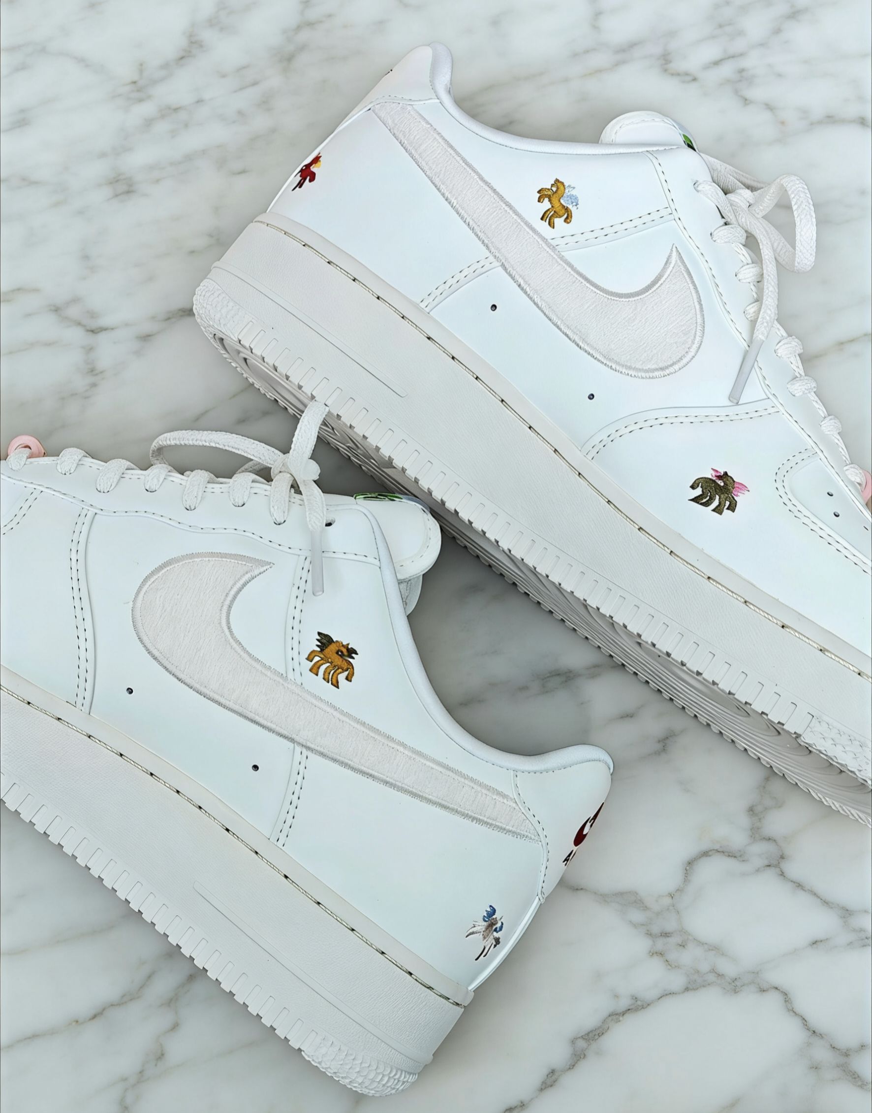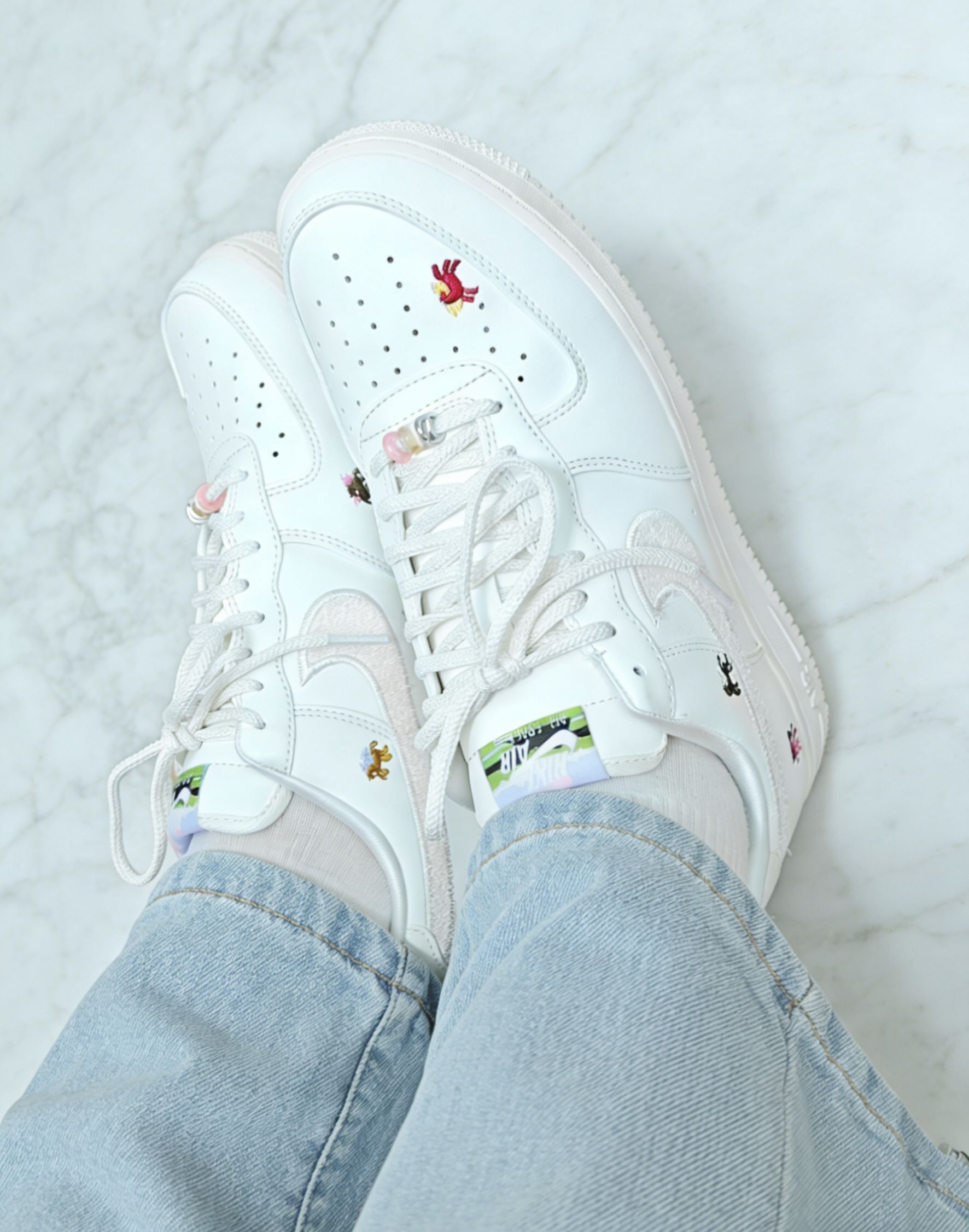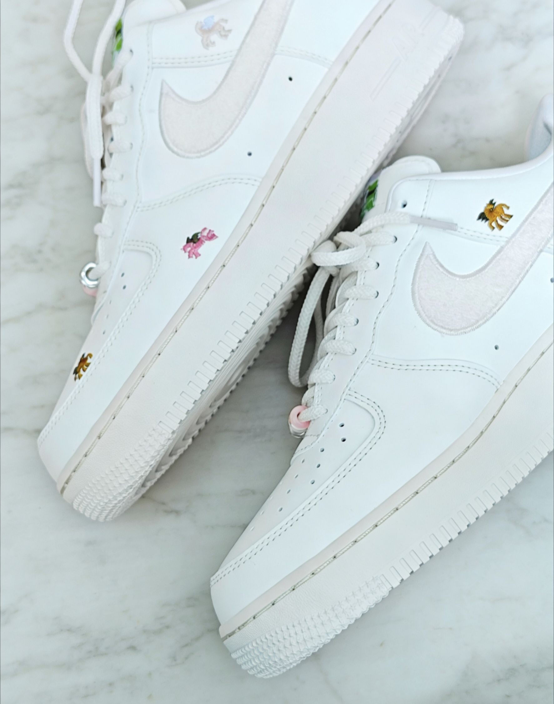 新年入的AF1生肖款太香了!米白麂皮拼皮质质感绝了,生肖刺绣细节超有年味。Air气垫软弹不累脚,隐形增高超适合小个子,搭牛仔裤、运动裤都百搭,就是麂皮容易沾灰,介意慎入~