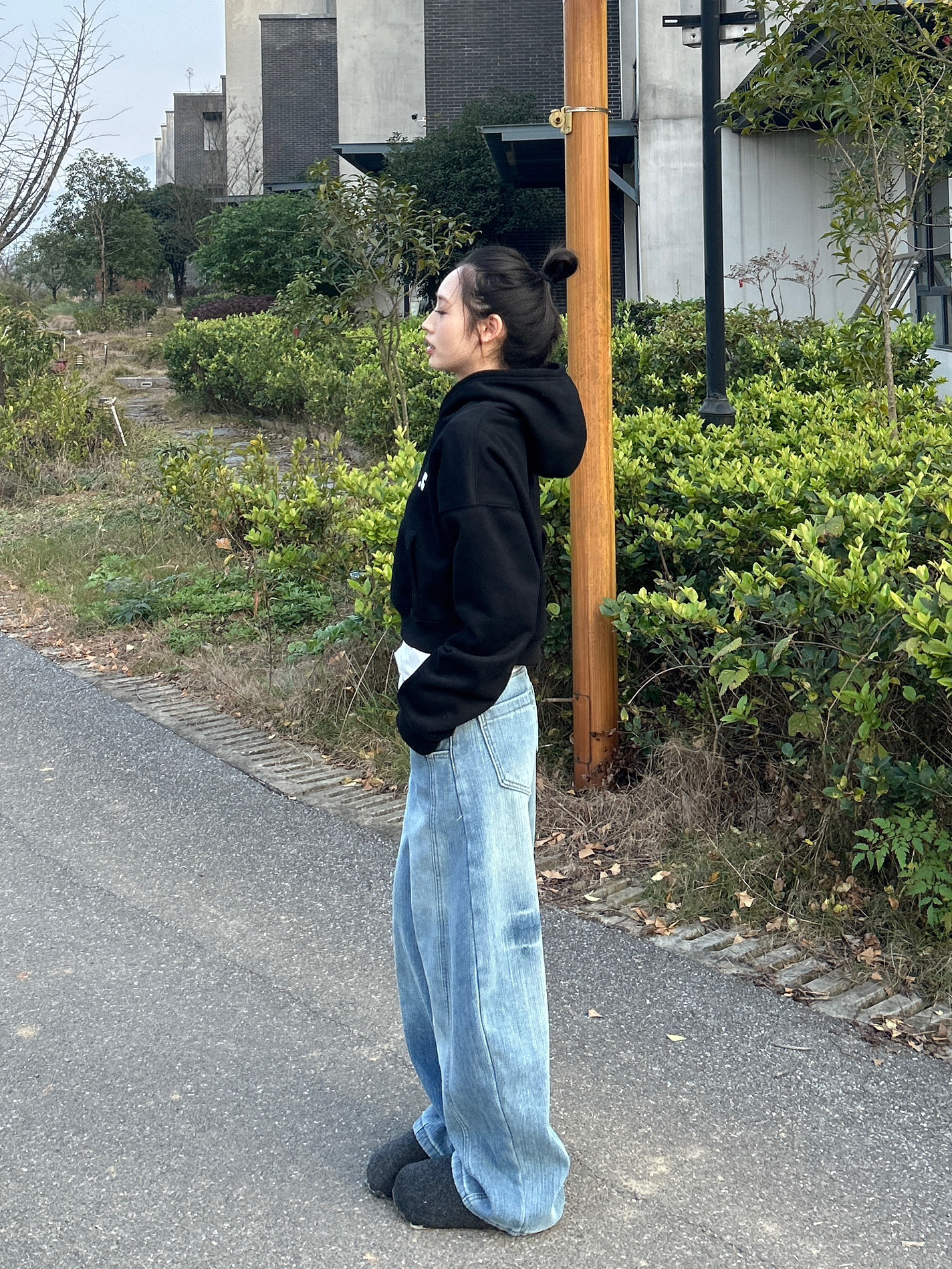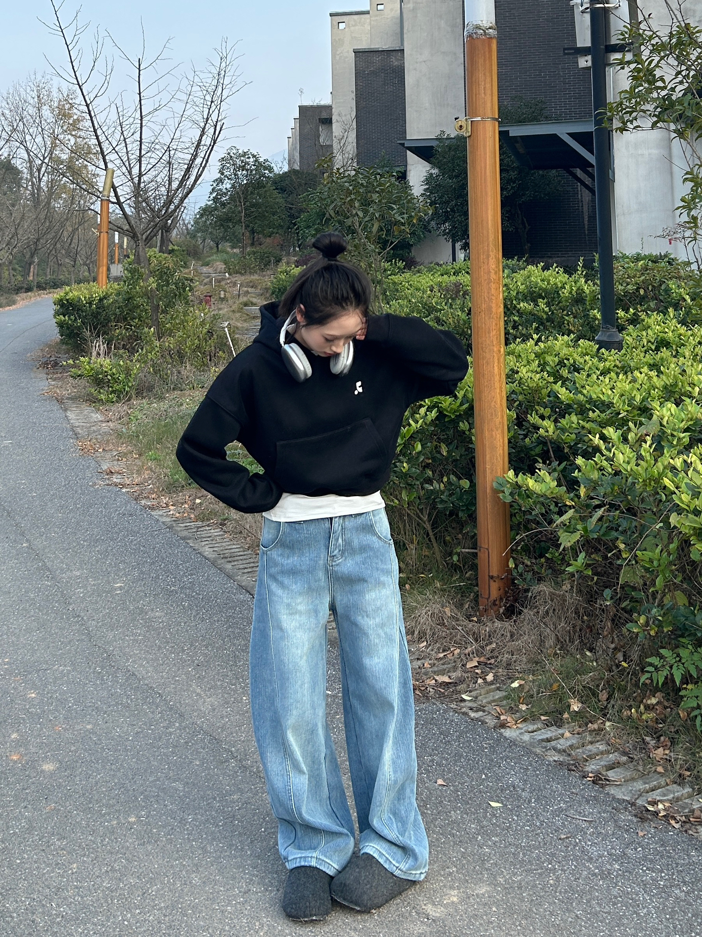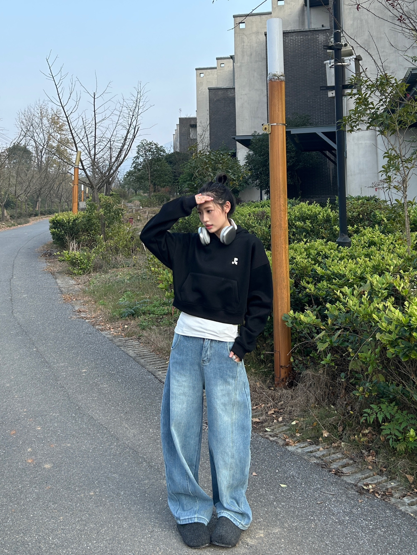 黑色短款连帽卫衣露一截白边打底,瞬间增加穿搭层次感,搭配阔腿牛仔裤藏肉又显随性,踩双毛毛拖,把冬日的慵懒街头风焊在身上~