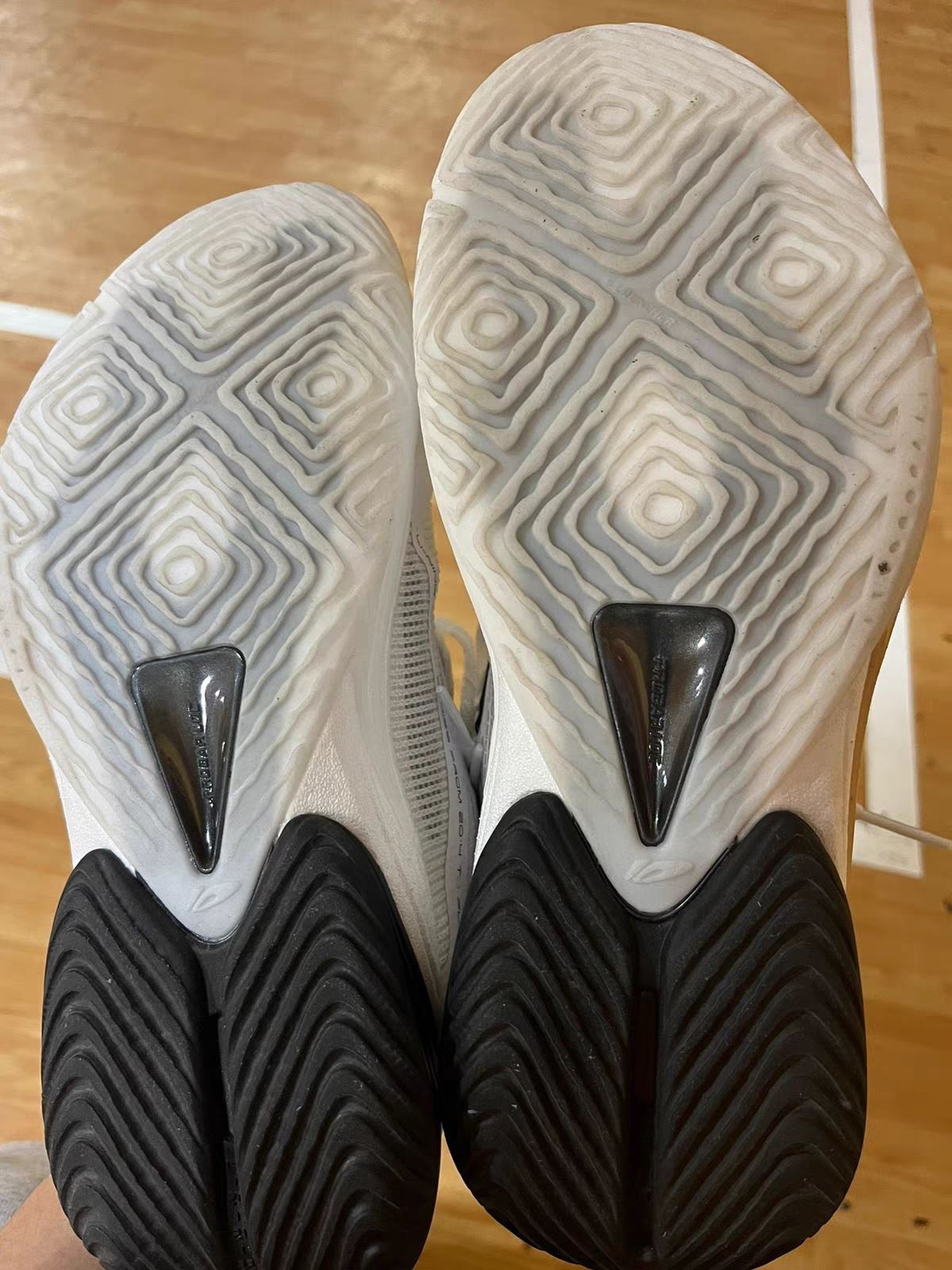 - 耐磨: 7.5分(前掌橡胶材质耐磨抗造,室外场多次实战无明显磨损;后掌去外底化设计是短板,高频落地易出现磨损不均,水泥地长期实战需谨慎)。