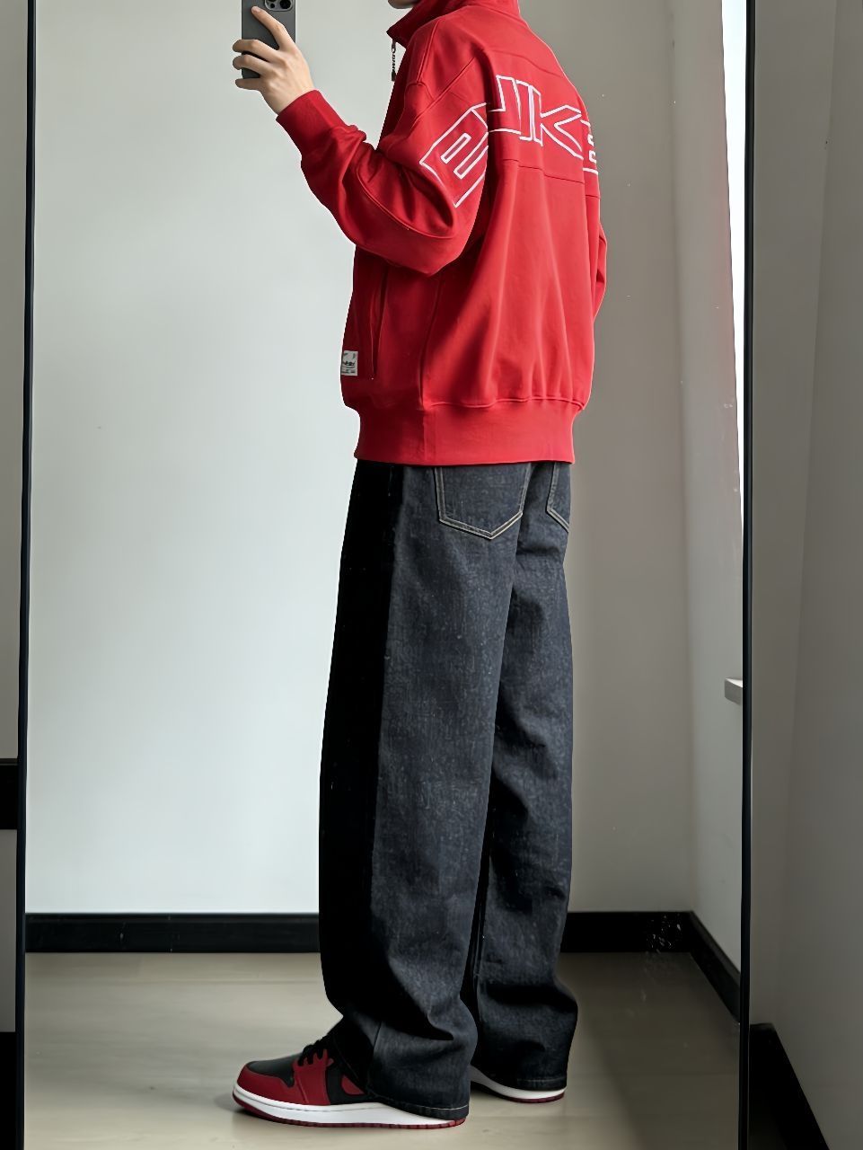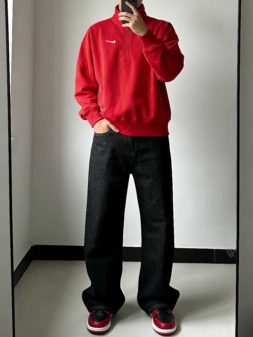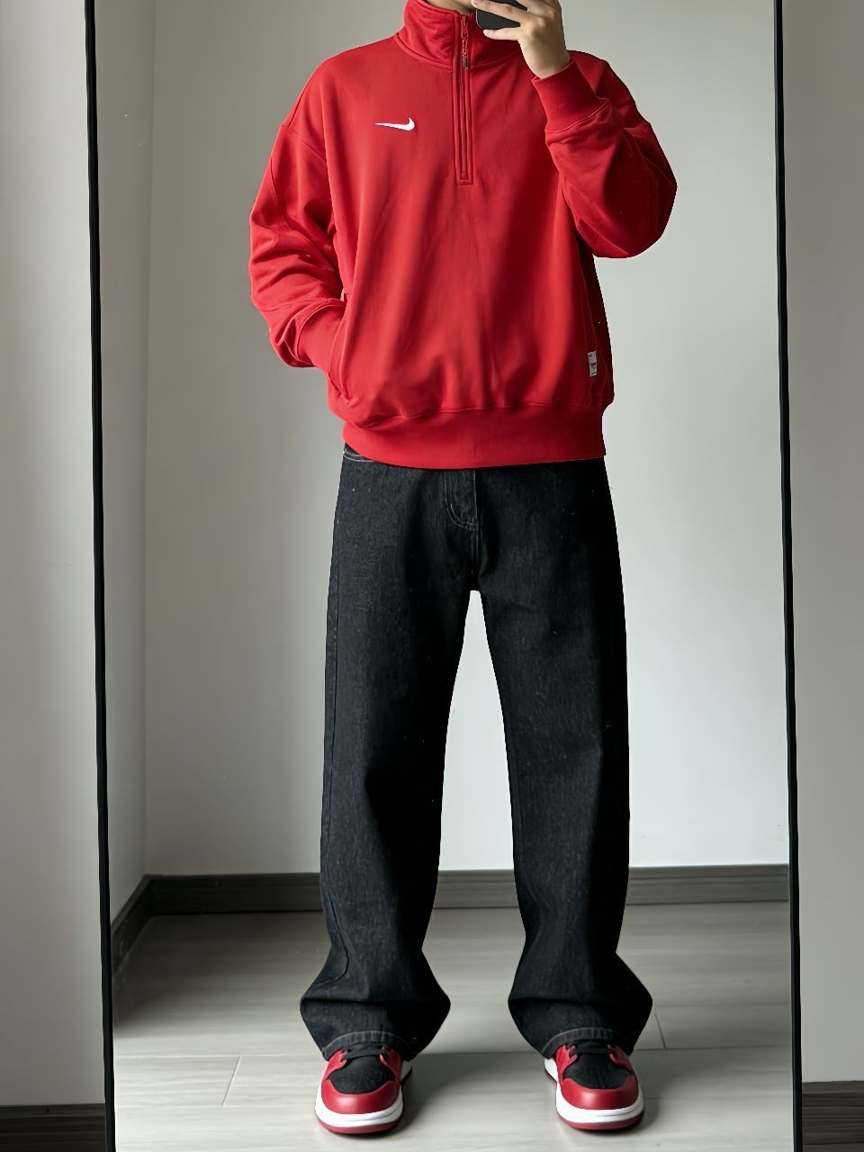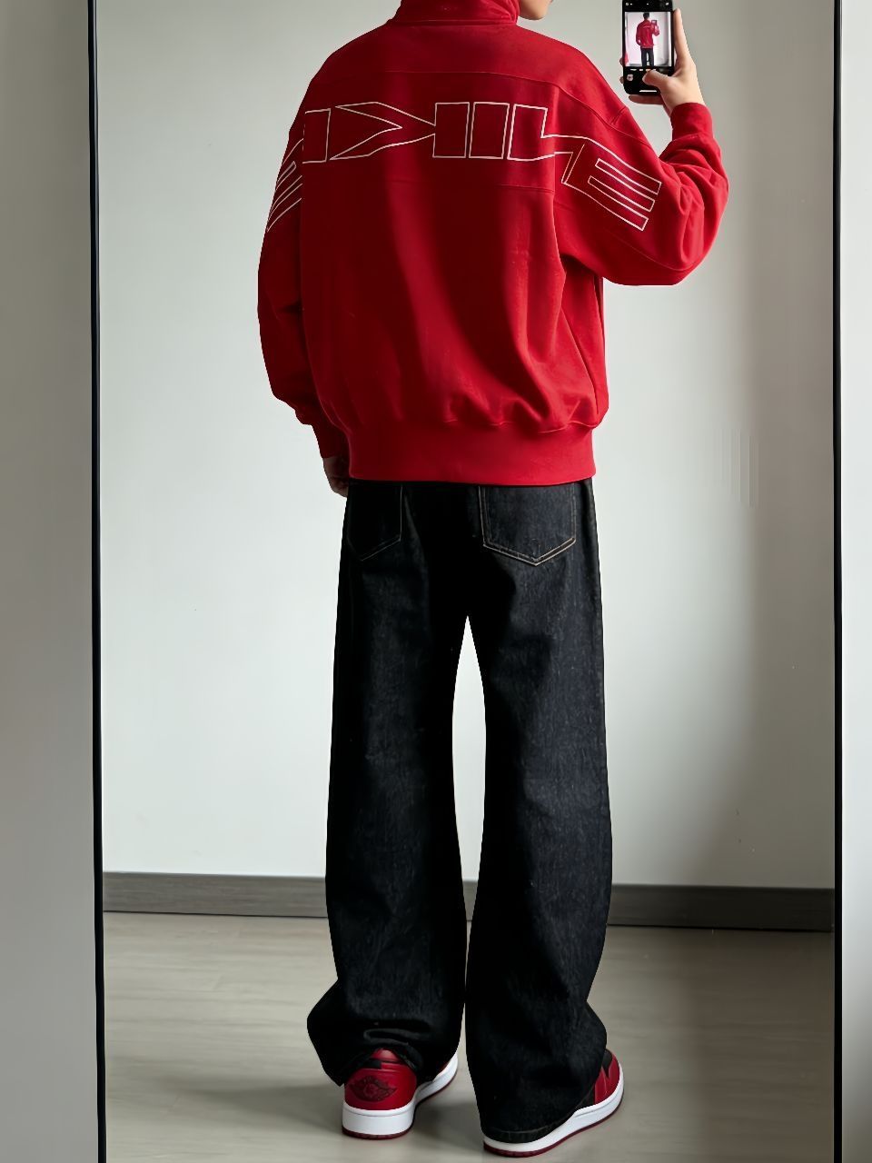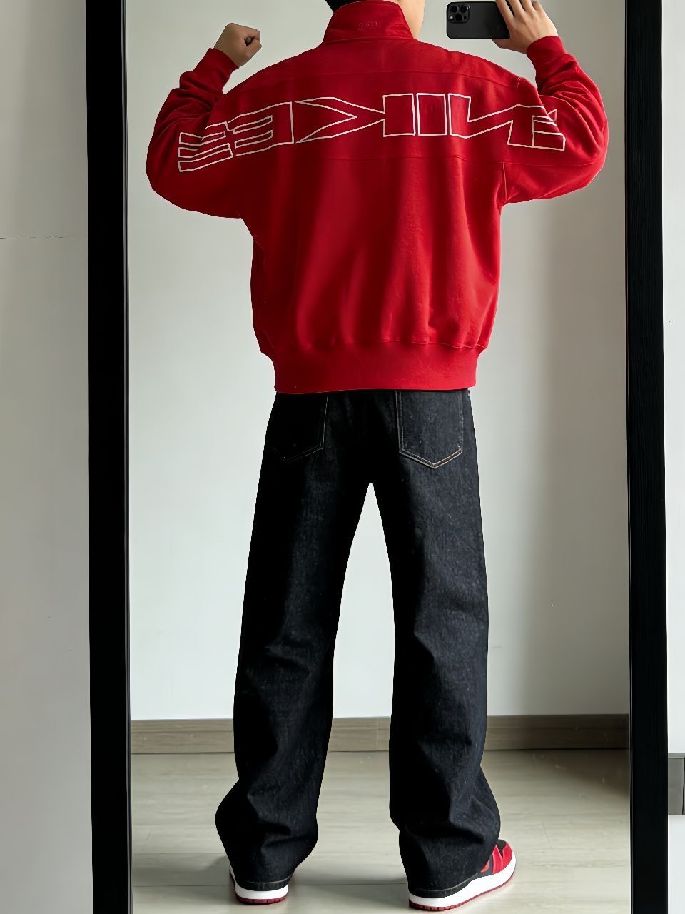 🙈🙈最近超爱这套下楼拿外卖都被追问的红黑配!Nike蛇年卫衣这件半拉链设计太方便了,红色正得恰到好处,袖子上的刺绣细节绝了。下身搭新因素这条直筒牛仔裤,版型真的修饰腿型,面料挺括但不会硬。重点这双AJ1马年低帮!黑红配色经典不说,后跟的马年扣子简直是点睛之笔。 🥳🥳整套就是懒人搭配法——卫衣塞一角到牛仔裤里,鞋子颜色和上衣呼应。红黑配真的永远不会错,既有新年氛围又不夸张,日常穿舒服又好看,廓形平...