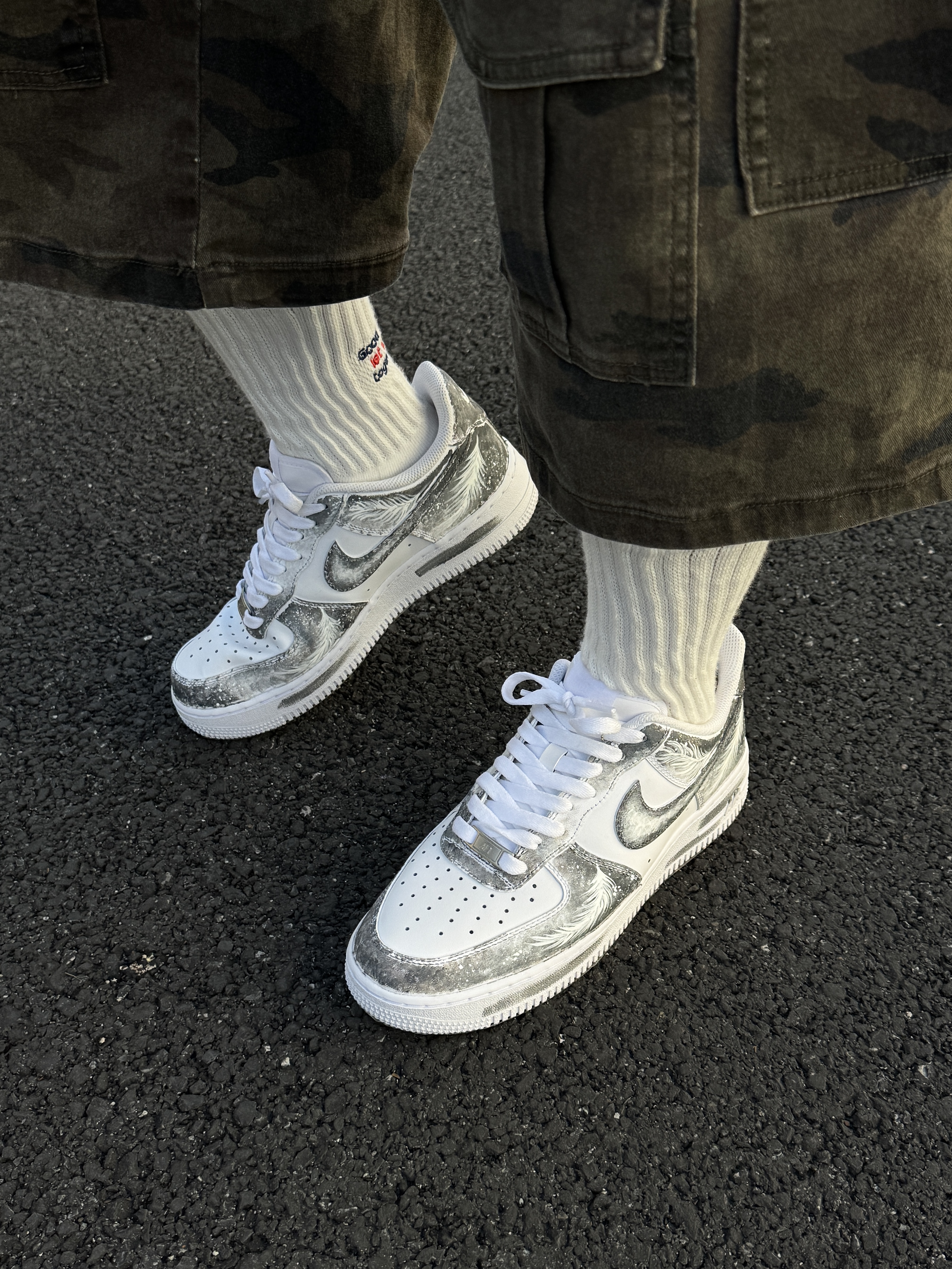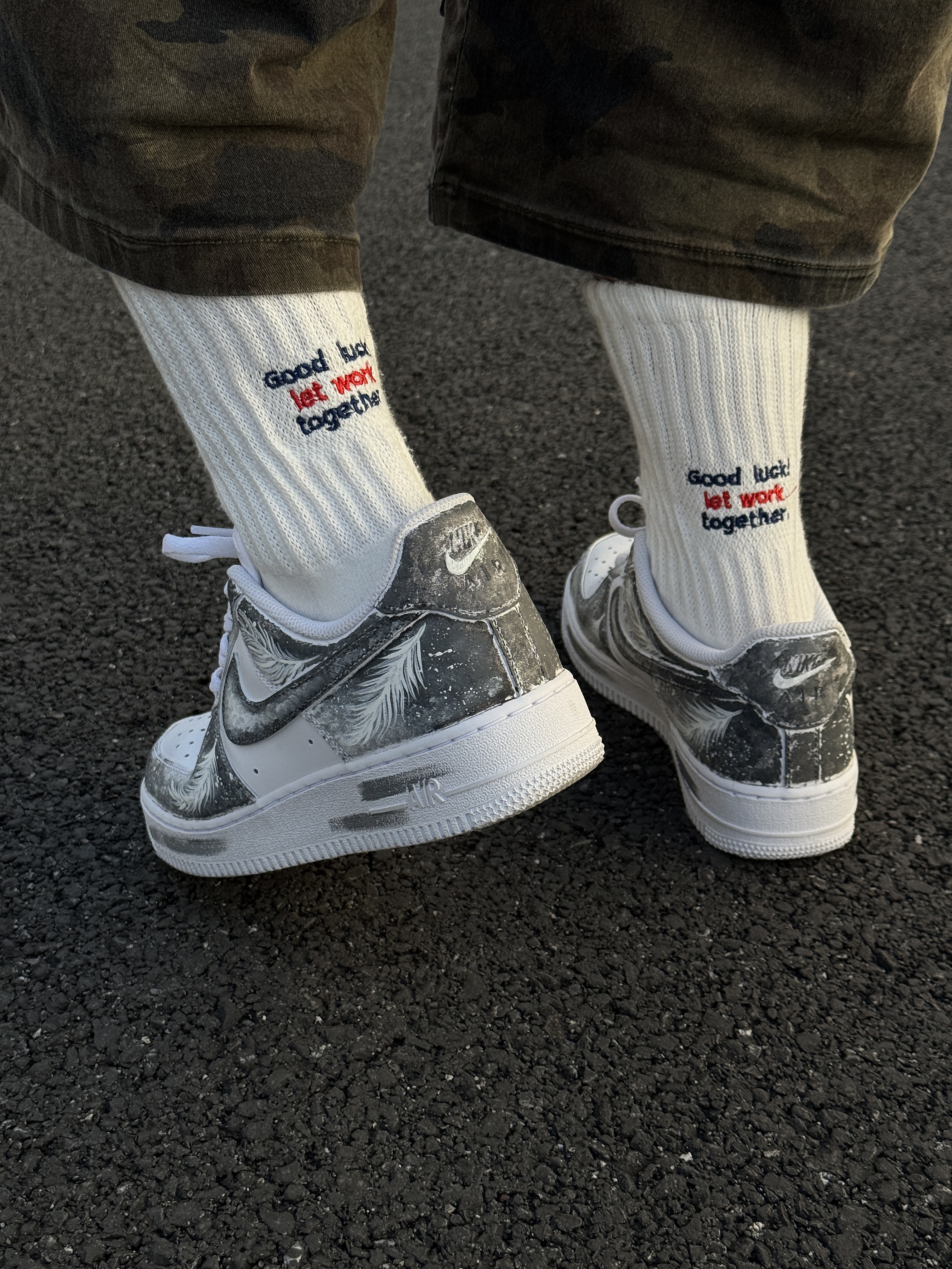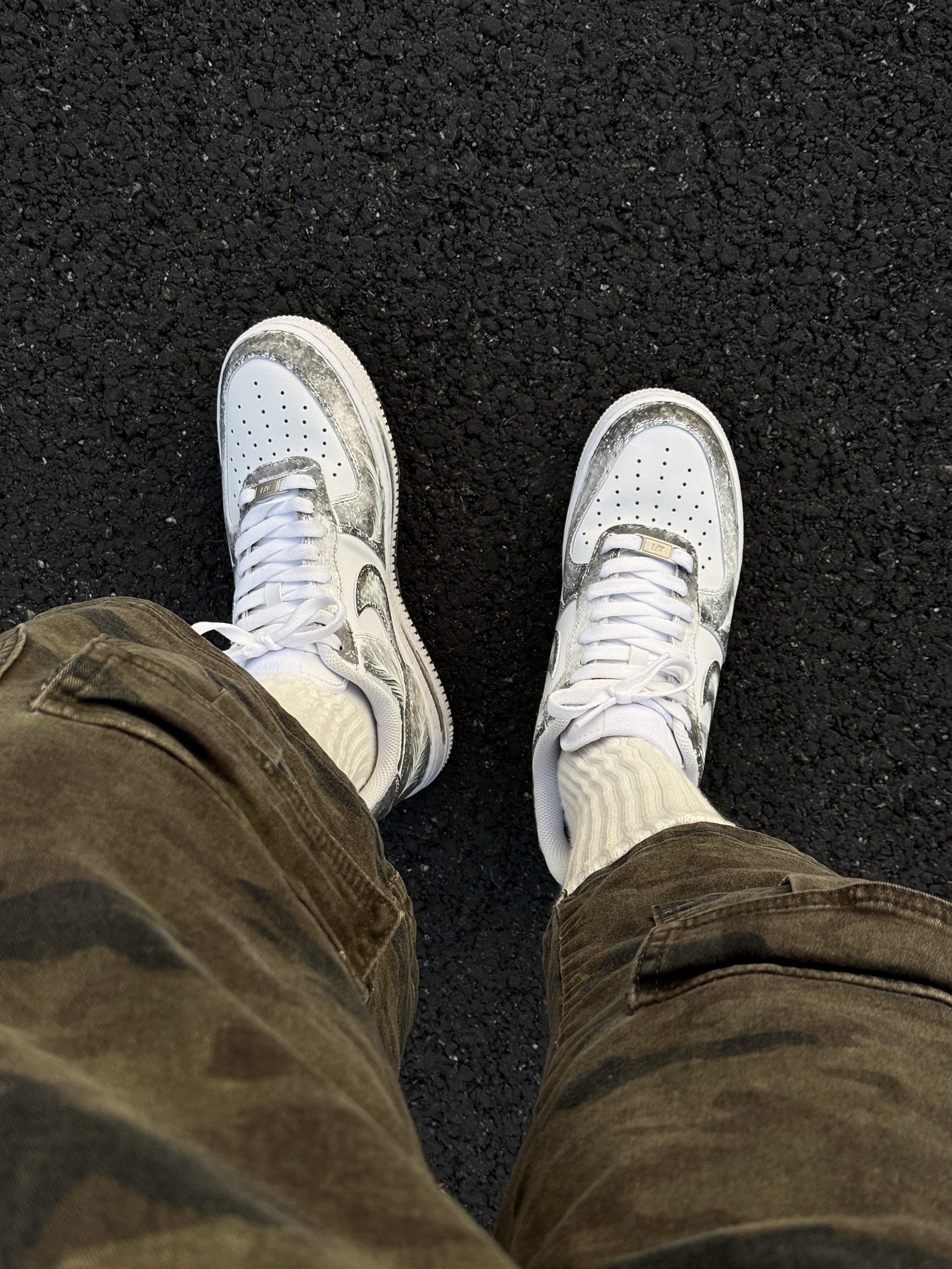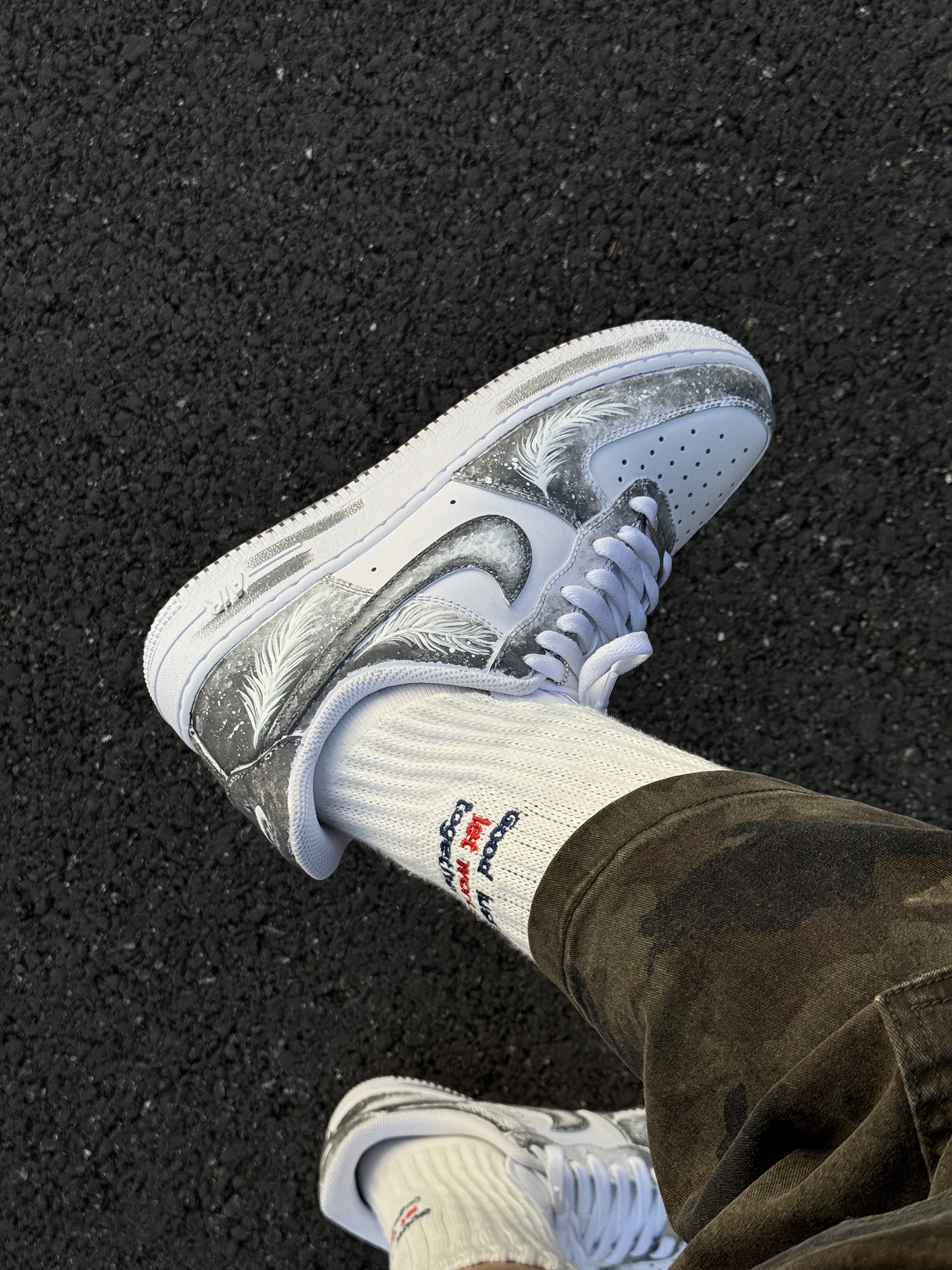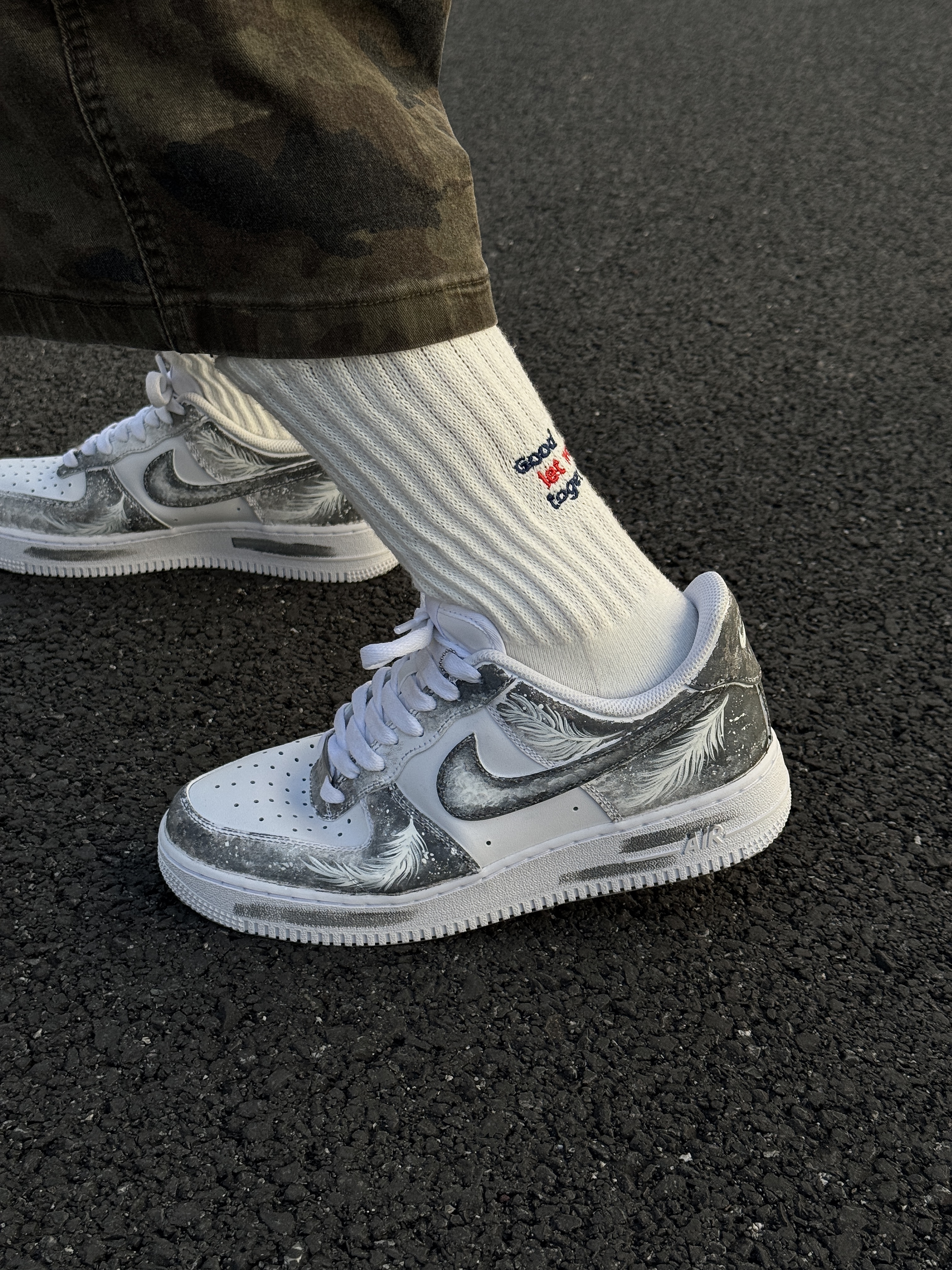 ~ 给大家分享一双 #Nike 的定制板鞋👟 这双是做了复古的灰色➕羽毛的印花 有种古罗马雕塑的风格真的很特别🤳🏻 做工和工艺都是比较复杂的一双鞋子 整双鞋上脚就是比较显脚🦶🏻瘦的鞋型 喜欢玩点不一样的这双鞋肯定合适😆 空军的脚感一直都是很ok的 像我日常常穿的牛仔裤和休闲卫裤都挺ok的 尺码小建议: 徐哥平常穿的40这双40的是刚好合适的‼️ @万花弄定制 #新年战靴已更新 #一马当先晒新...