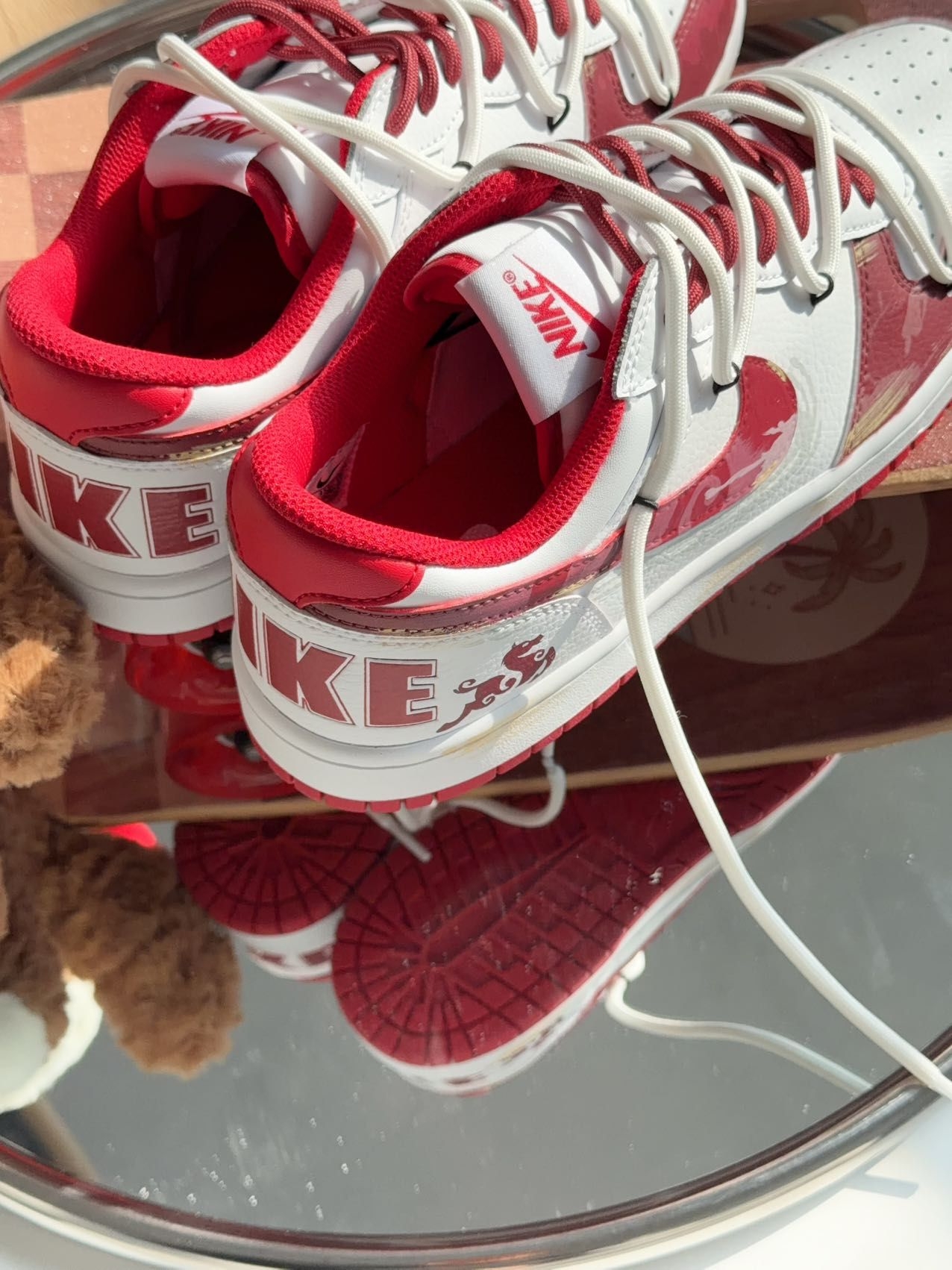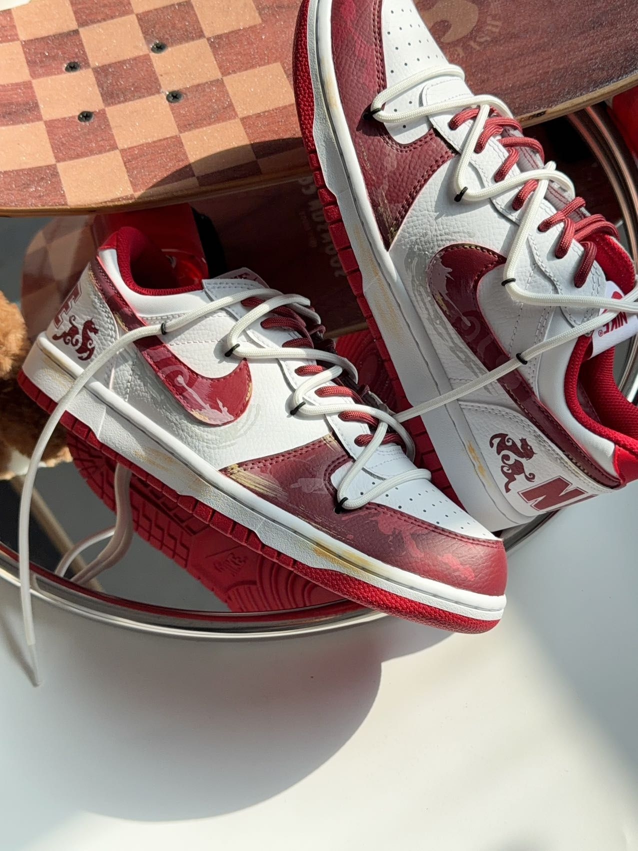 马年专属!这双红白Dunk把年味穿在脚上🧧|||刚收到这双Nike Dunk马年定制款,红白配色一整个拿捏住新年氛围。鞋面的泼墨和“福”“马”印花,是直接把年味焊在了鞋上,低调又有辨识度,不管搭牛仔裤还是运动裤都很和谐。脚感方面,Dunk的经典缓震中底确实稳,日常通勤走路不压脚,鞋面是荔枝纹皮革,支撑性不错,冬天穿也不冻脚。整体是复古又带点潮酷的风格,过年走亲访友穿它,既应景又不会太刻意,属于日常...