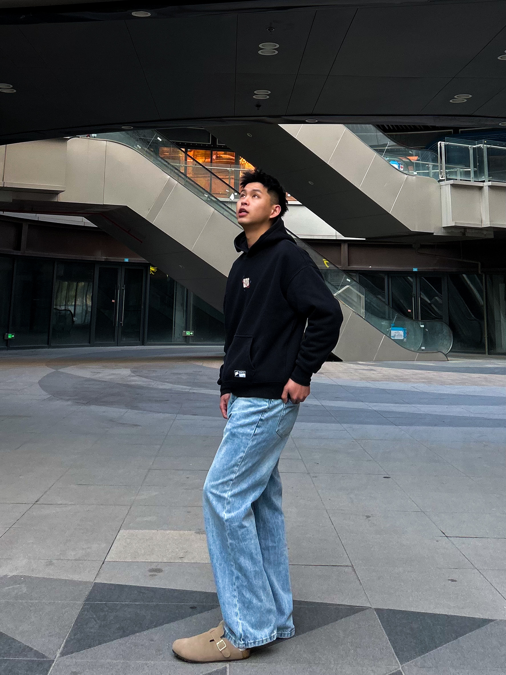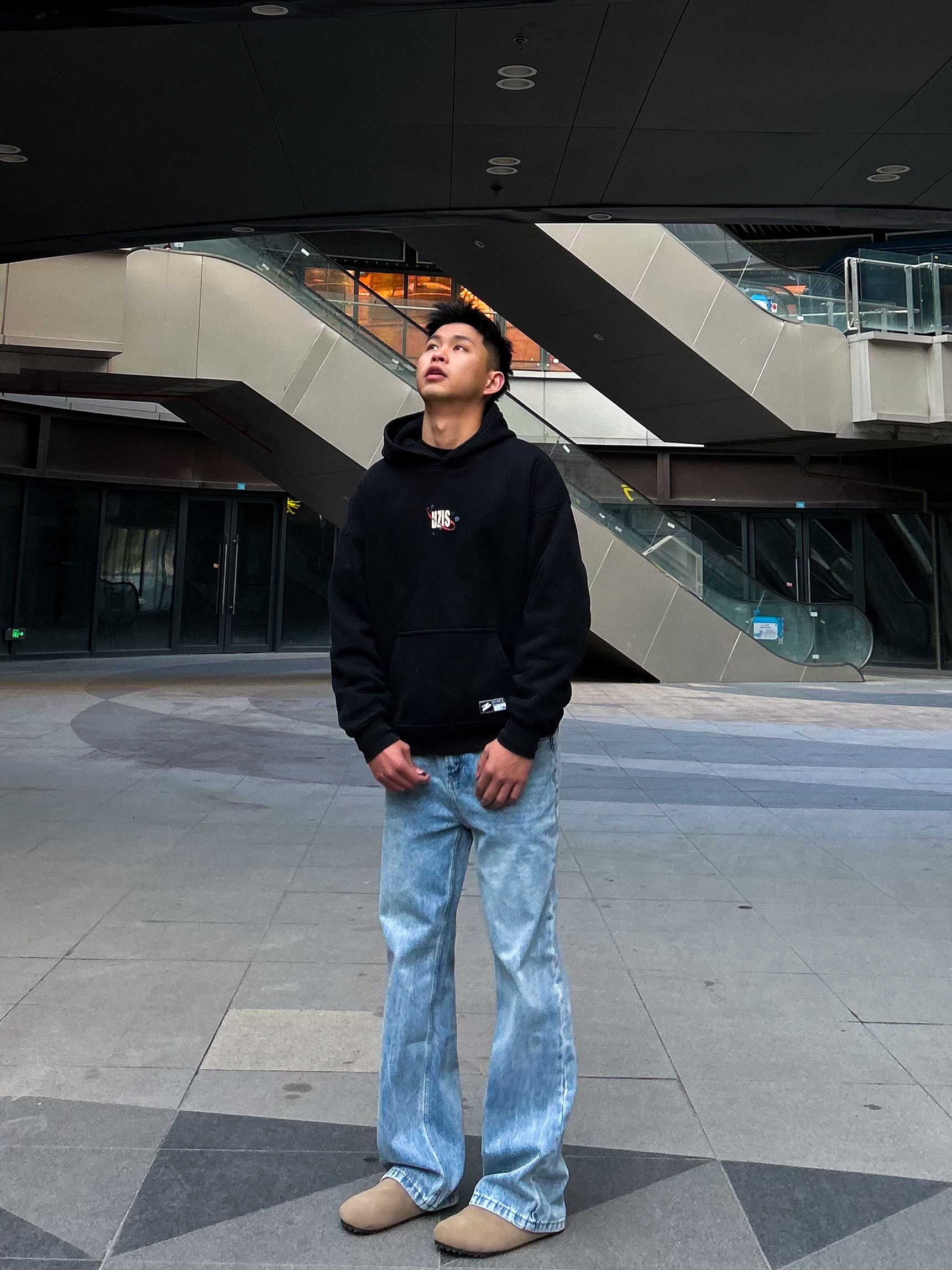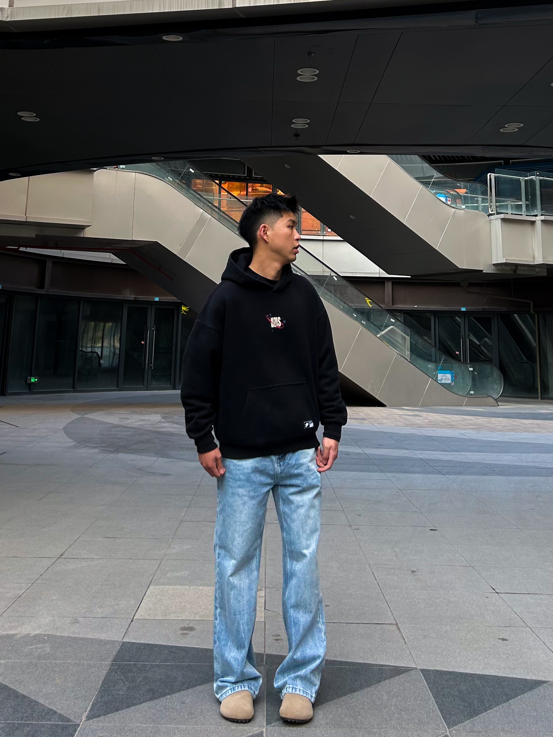 哈咯,这里是卢_SG 冬日酷帅感街头风穿搭! 上身选了件黑底字母印花连帽卫衣 后背大尺寸字母图案+胸前小标装饰 潮流感直接拉满,宽松版型不挑身材 还能穿出随性的街头范儿 下身搭了条水洗蓝做旧阔腿牛仔裤 渐变酸洗纹理+直筒阔腿剪裁 复古街头感拉满!