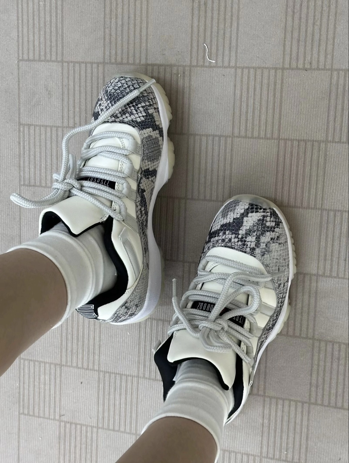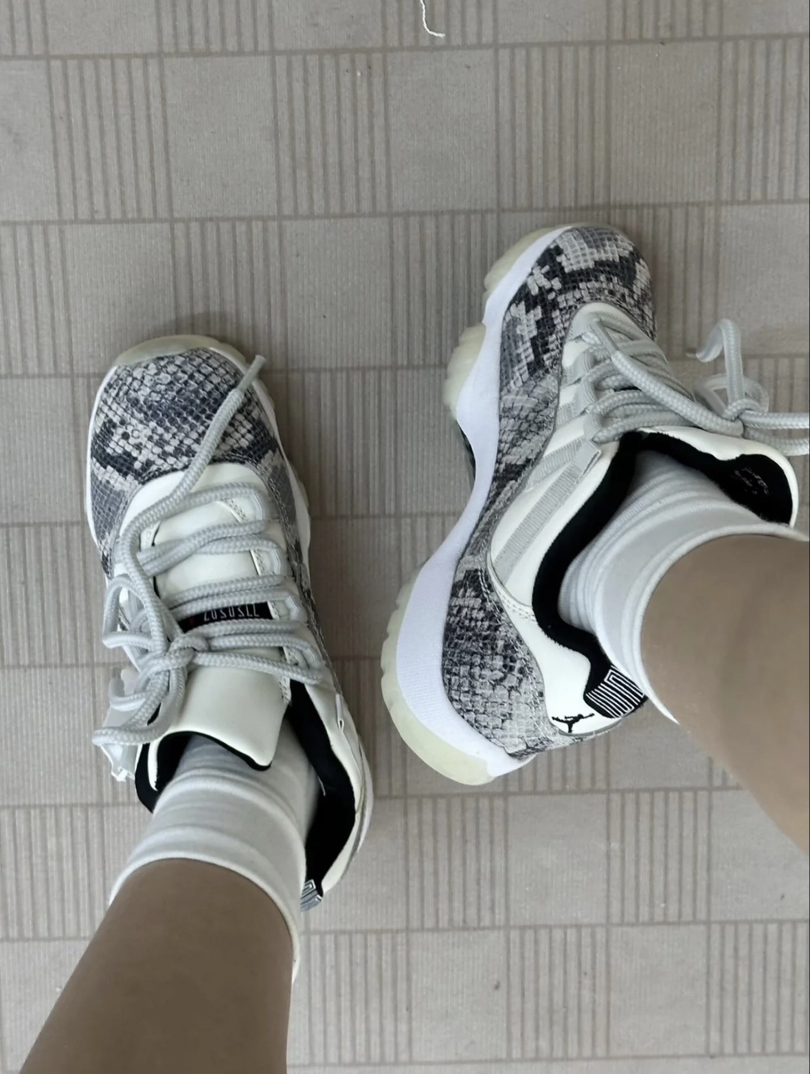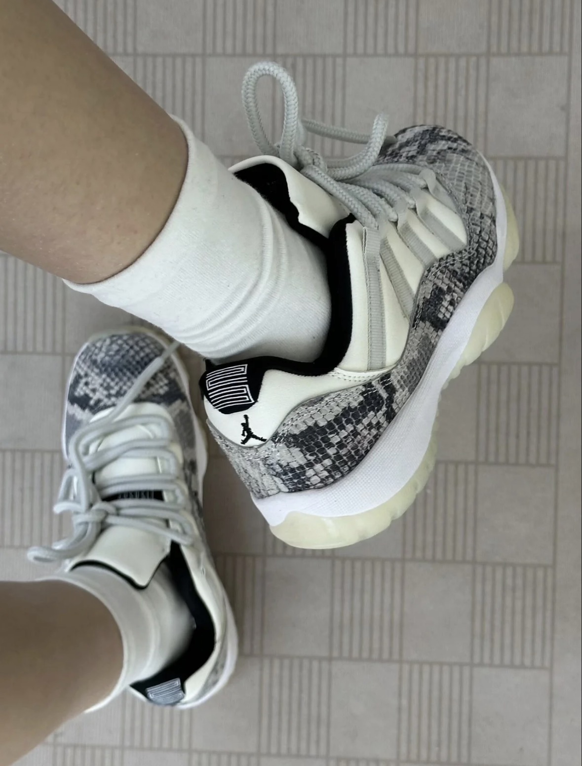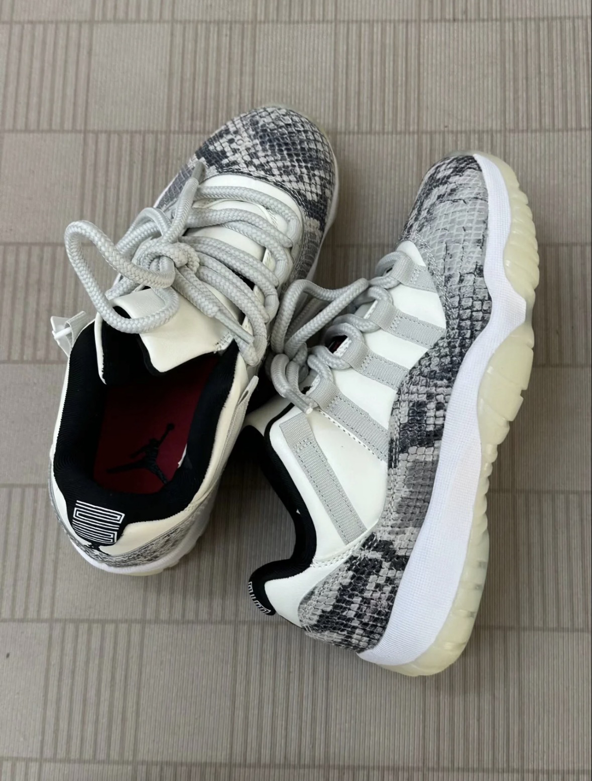 双AJ11白蛇纹的外观确实很亮眼,蛇纹纹理的质感在线,搭配日常的休闲裤或者牛仔裤都很合适,出门的回头率也还不错。 上脚后的前掌反馈还算明显,走路时的脚感不算硬,但后跟的气垫体验感比较弱,长时间走路会觉得后跟有点闷。 鞋身的蛇纹材质虽然好看,却很容易沾灰,打理起来要多花点心思,而且鞋帮的包裹性偏紧,脚型偏宽的话会有挤脚的感觉。整体来说,颜值是加分项,但实用性上的小问题也确实存