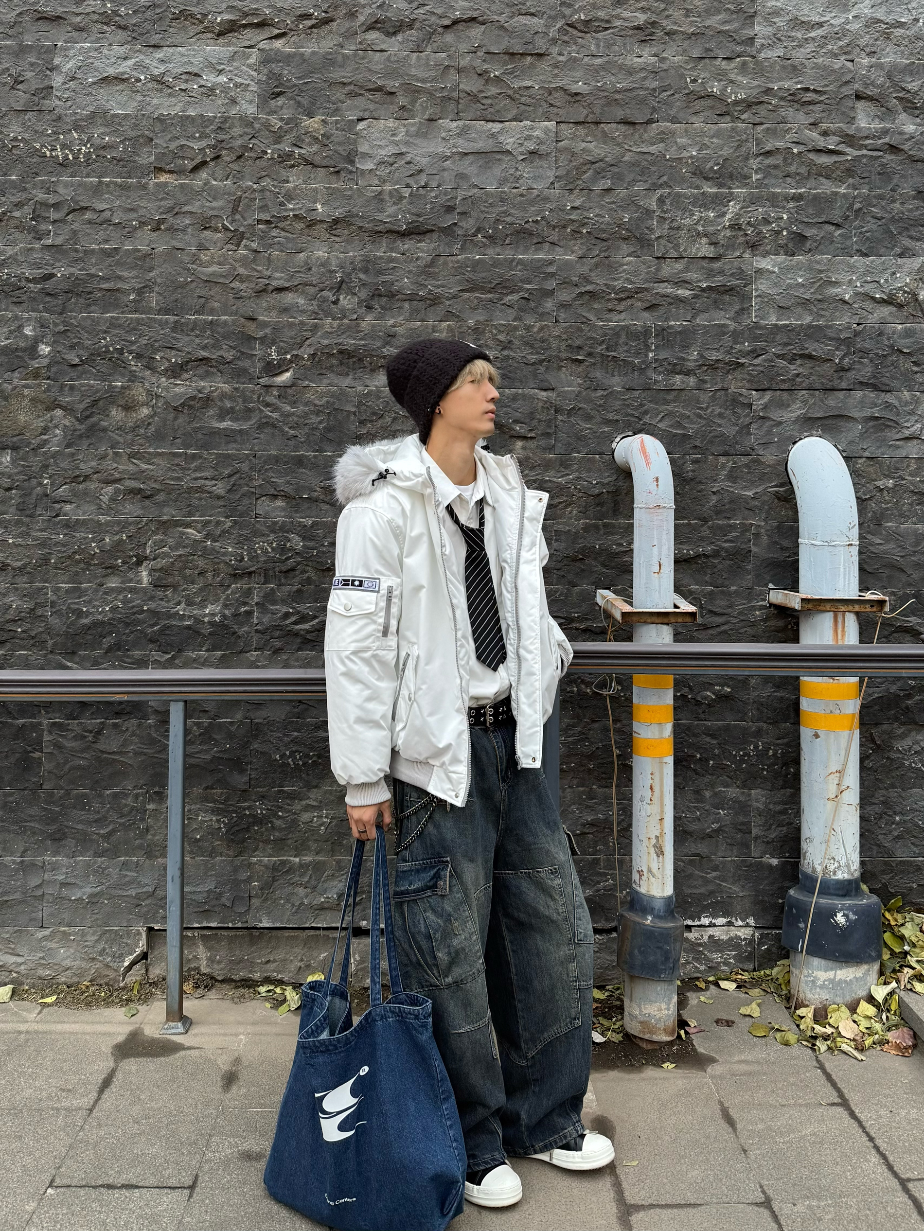 今天出门扫街的穿搭 碎碎念~ 简单的叭叭两句hhh✌️ 上身白色派克服搭配工装阔腿 内搭件简单的白衬衫👔提亮 假模假样的搞点学生味儿🎓 领口抓了常用的领带 点缀一下细节 算是给整体增加层次了 顺便抓顶大头围针织帽一戴 把懒懒散散的劲儿直接扣在头上😎 天气还蛮晴☀️ 但风有点糊脸 在老城区的街边走了走 发现这种砖楼 管道 居民楼 随便拍拍都比咖啡店拍照 更有生活气息🌅