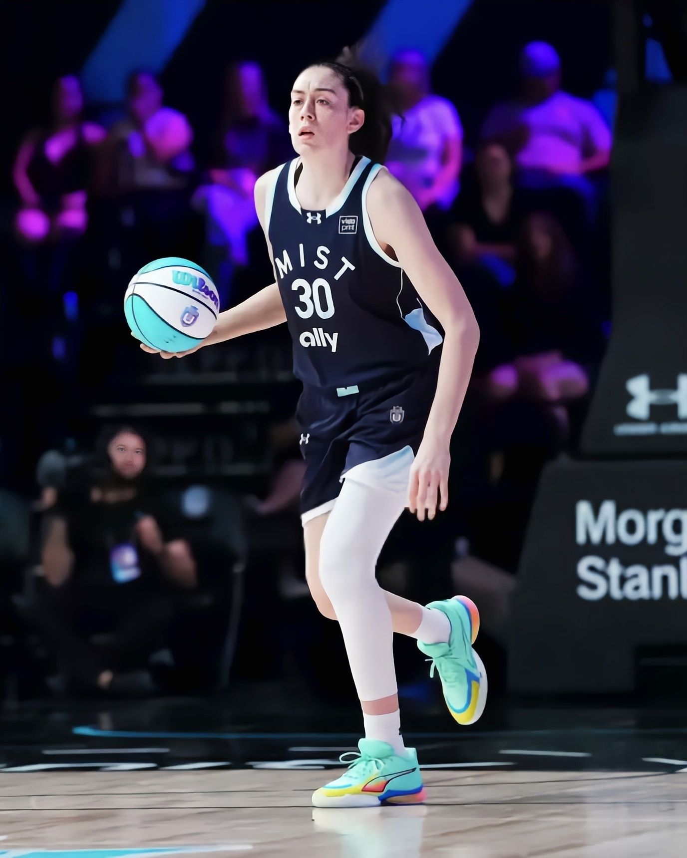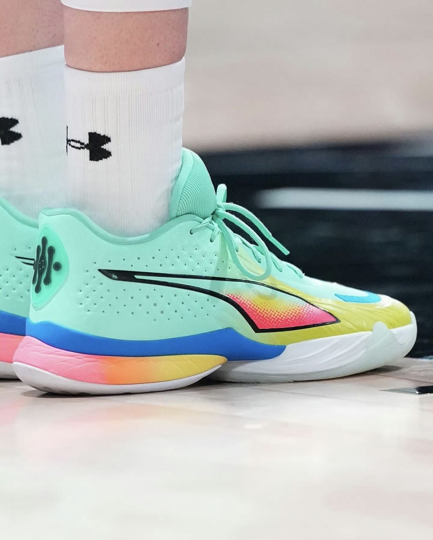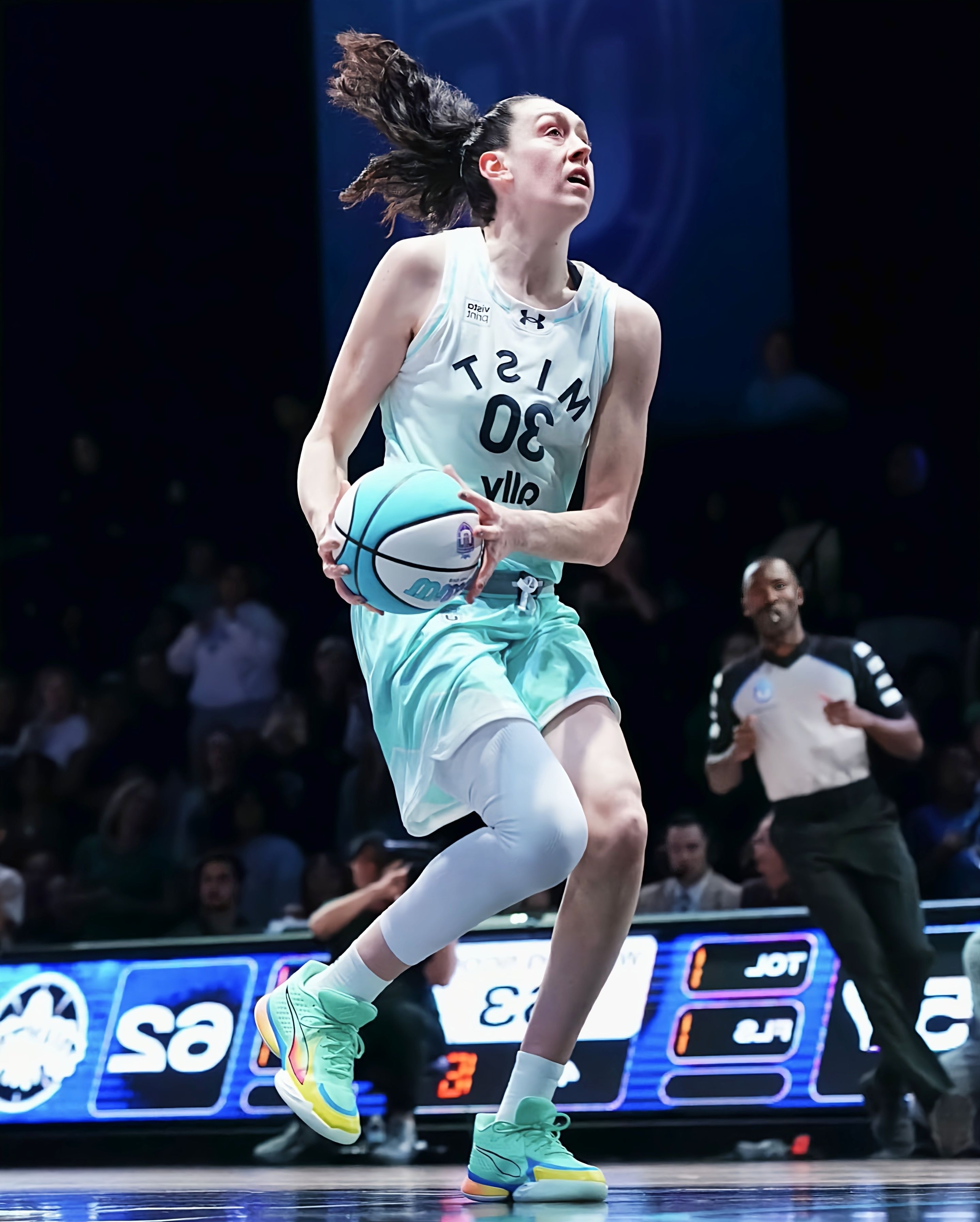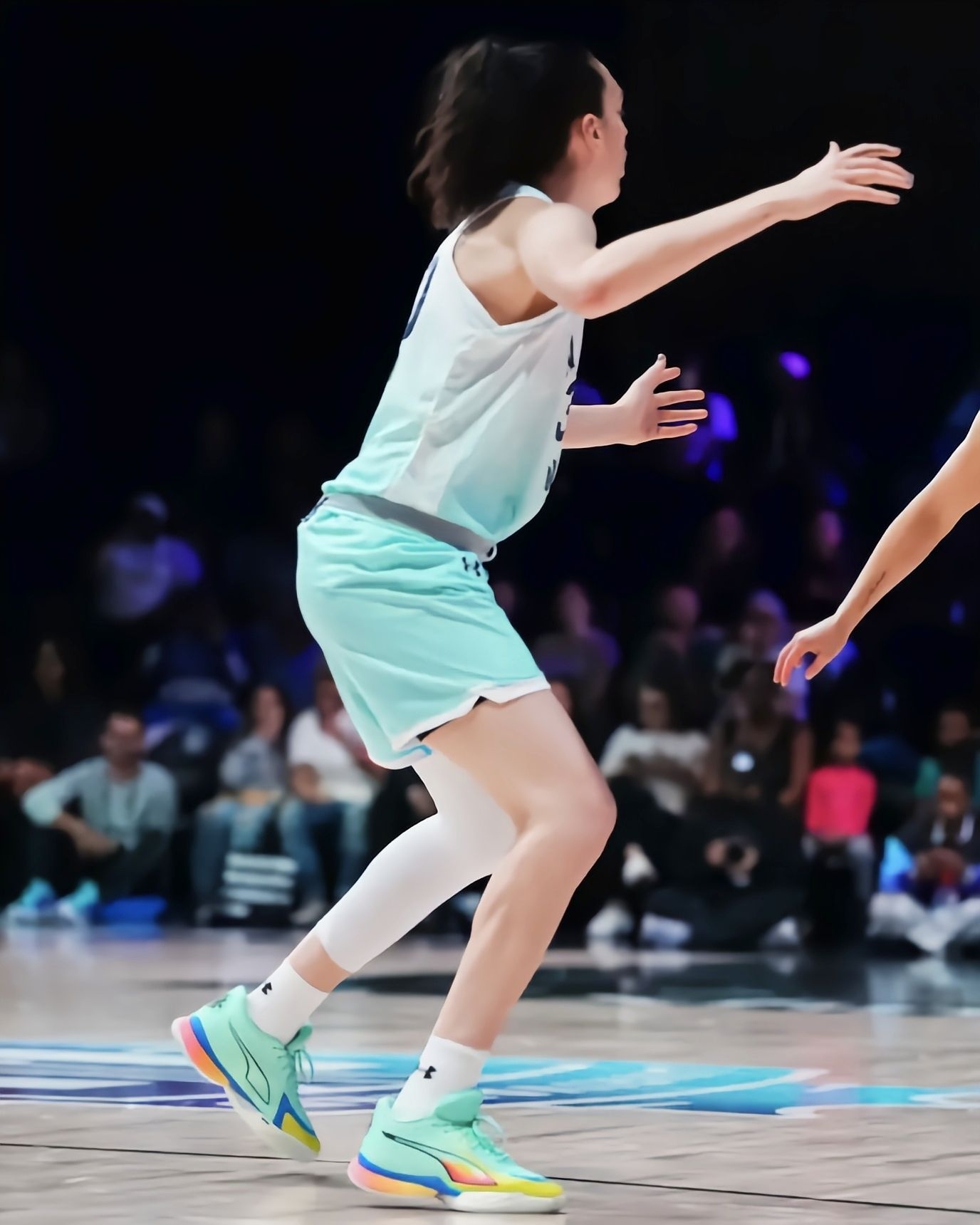 看WNBA纽约自由人的比赛,被Breanna Stewart的表现和她脚上的鞋彻底圈粉了。 作为WNBA的MVP级球员,Stewart这双个人签名鞋Stewie 5代完全是为她的打法量身打造的。薄荷绿鞋身+彩虹渐变中底,在球场上清爽又吸睛,鞋身的透气孔设计和后跟的“Stewie”专属Logo,细节直接拉满。 看她穿着这双鞋一次次完成翻身跳投、冲抢篮板,就知道这双鞋的缓震和支撑有多顶。全掌氮...