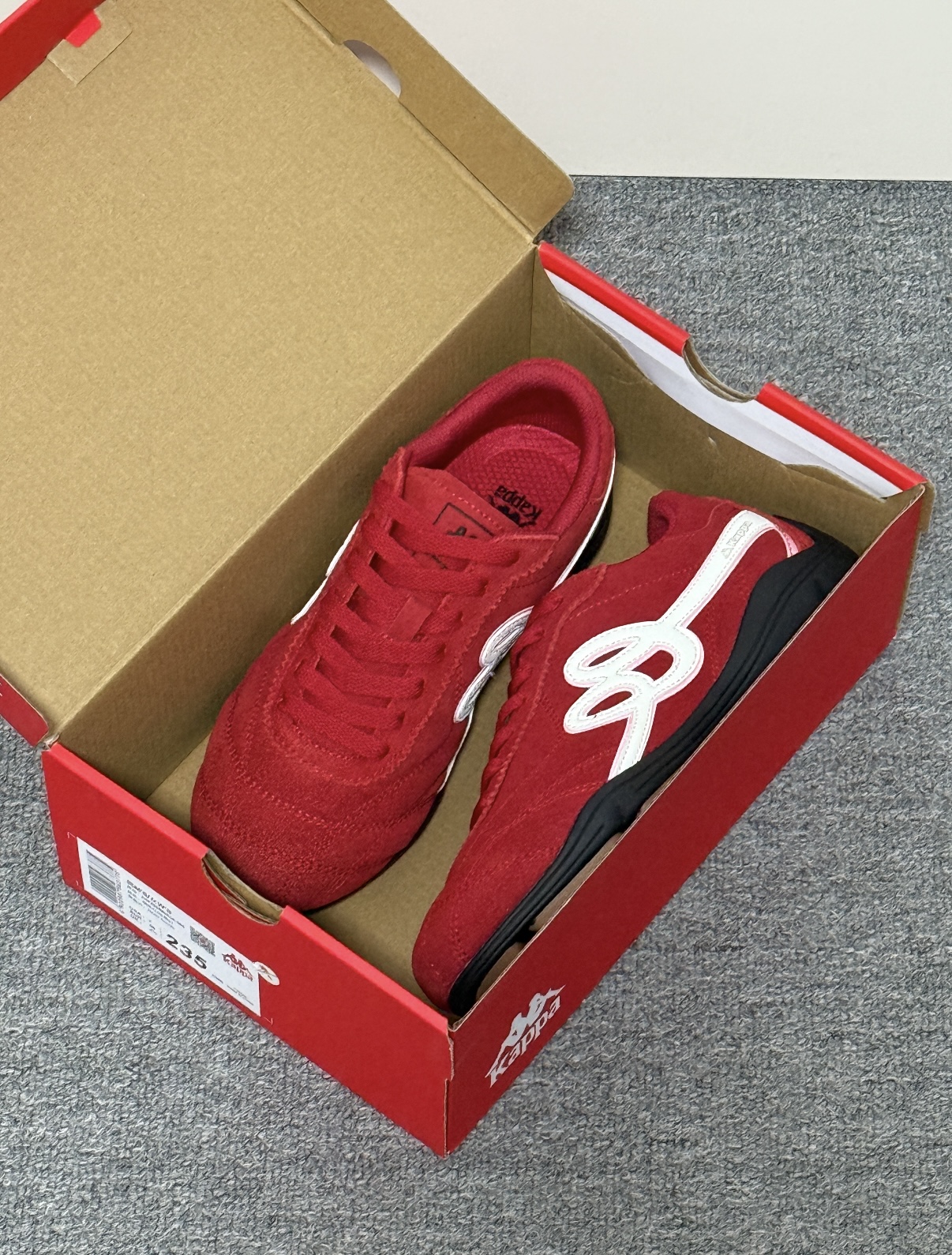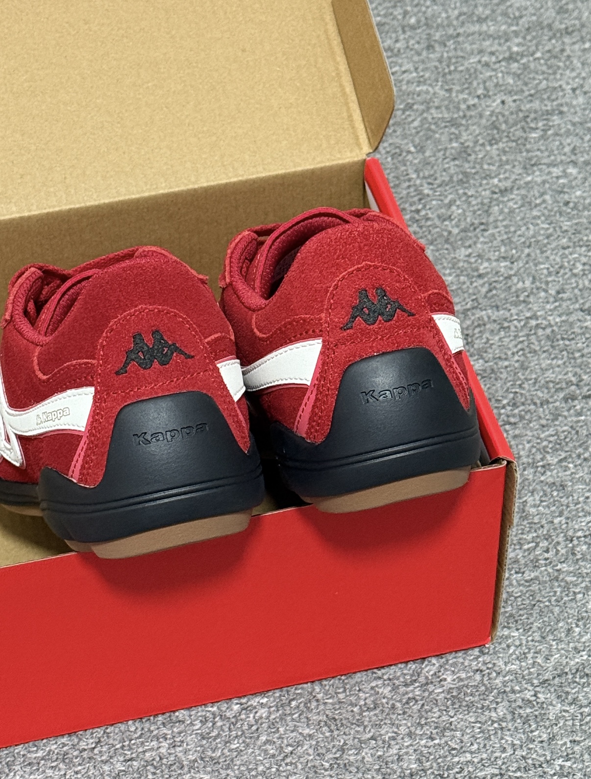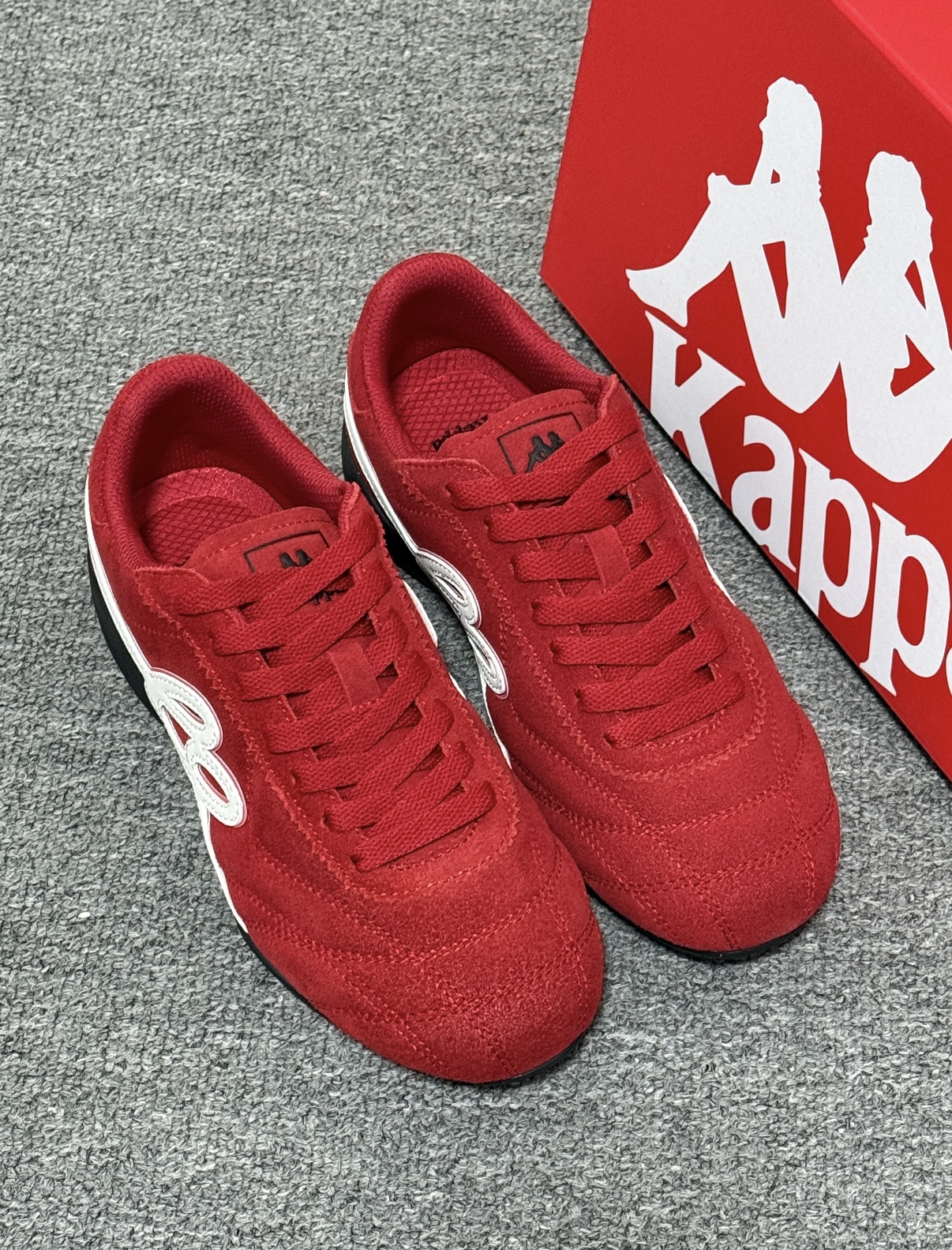 新入手的介双 Kappa 红色赛车鞋 尊滴太有节日氛围啦 帅帅的风格板正得很 做工很精细细节满分 绒面很柔软😎 超级百搭 搭配休闲裤 牛仔裤都阔以 平时逛街旅游穿都没问题