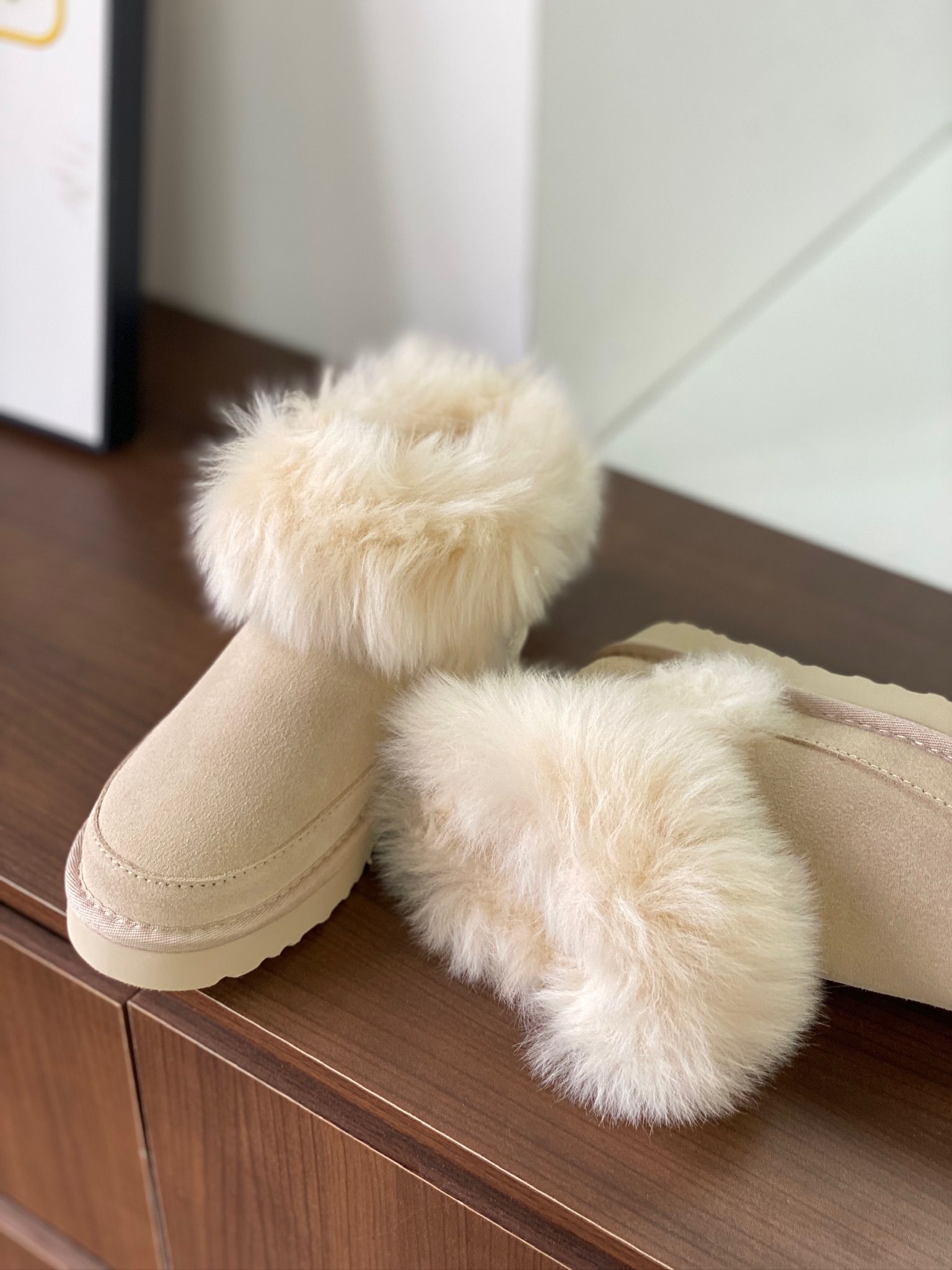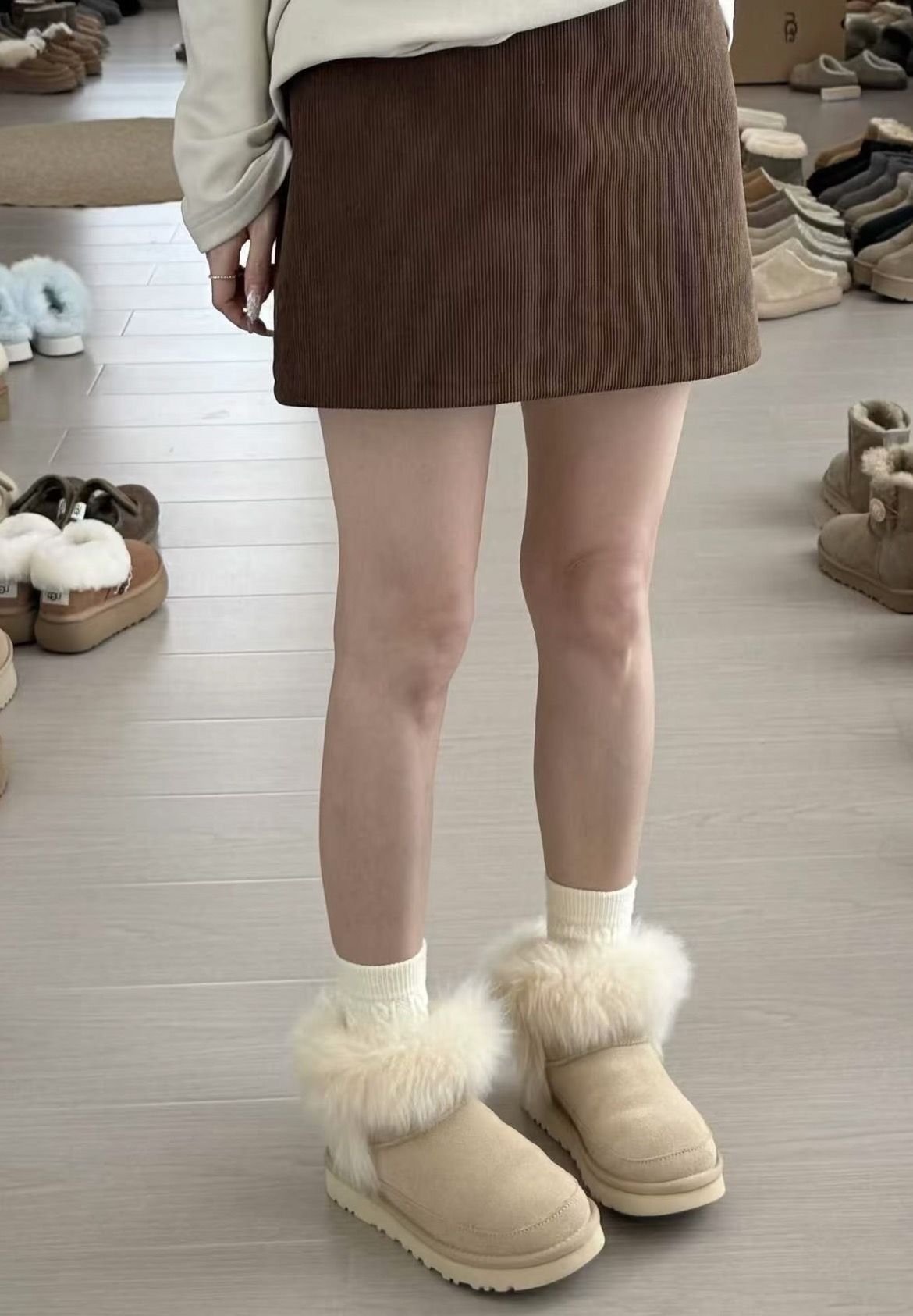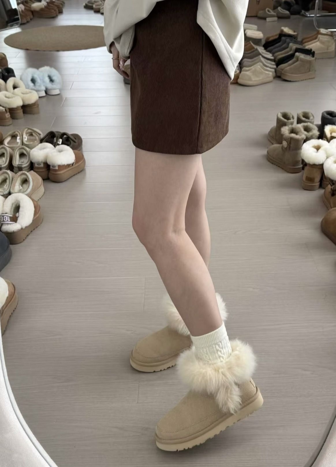 米白色很正,是一种温润的奶油感,比纯白耐脏,又比深色轻盈。鞋口那一圈丰盈蓬松的长毛是点睛之笔,一下子打破了雪地靴固有的笨拙感,反而有种美式休闲的慵懒时髦。我让店员拿了她的码,实物比图片更有质感。进口牛反绒的鞋面细腻柔软,EVA大底大概有3厘米厚,掂在手里分量适中。