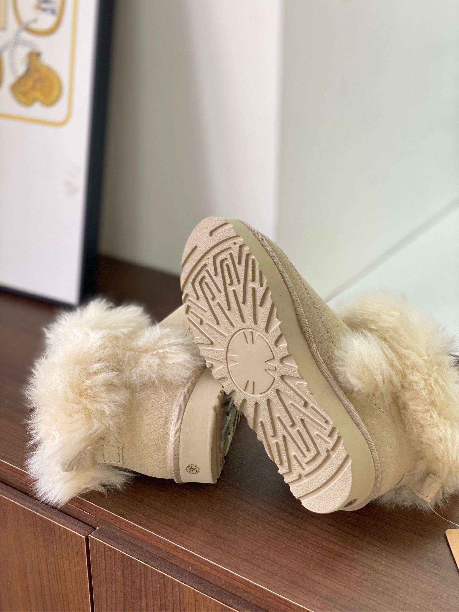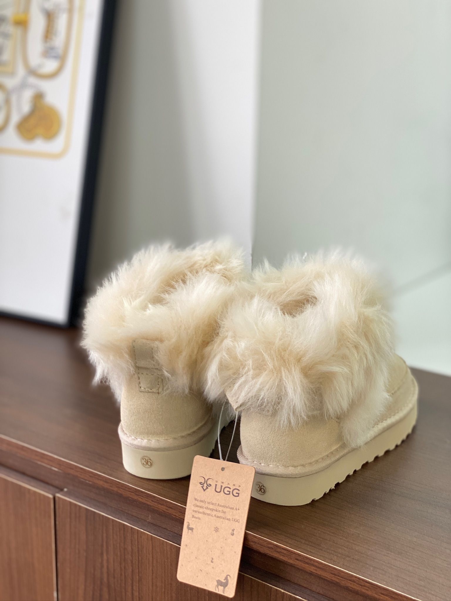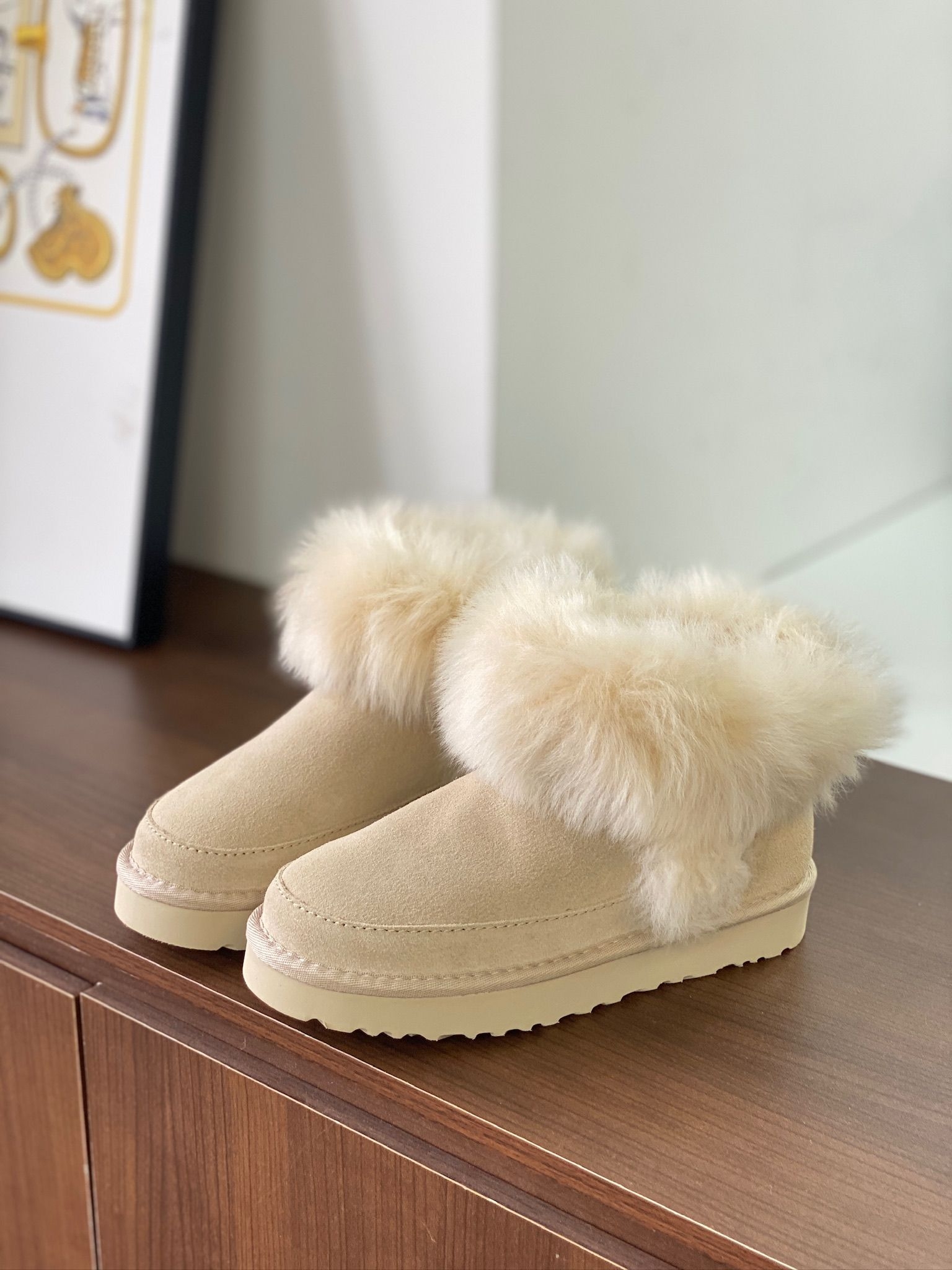 米白色很正,是一种温润的奶油感,比纯白耐脏,又比深色轻盈。鞋口那一圈丰盈蓬松的长毛是点睛之笔,一下子打破了雪地靴固有的笨拙感,反而有种美式休闲的慵懒时髦。我让店员拿了她的码,实物比图片更有质感。进口牛反绒的鞋面细腻柔软,EVA大底大概有3厘米厚,掂在手里分量适中。