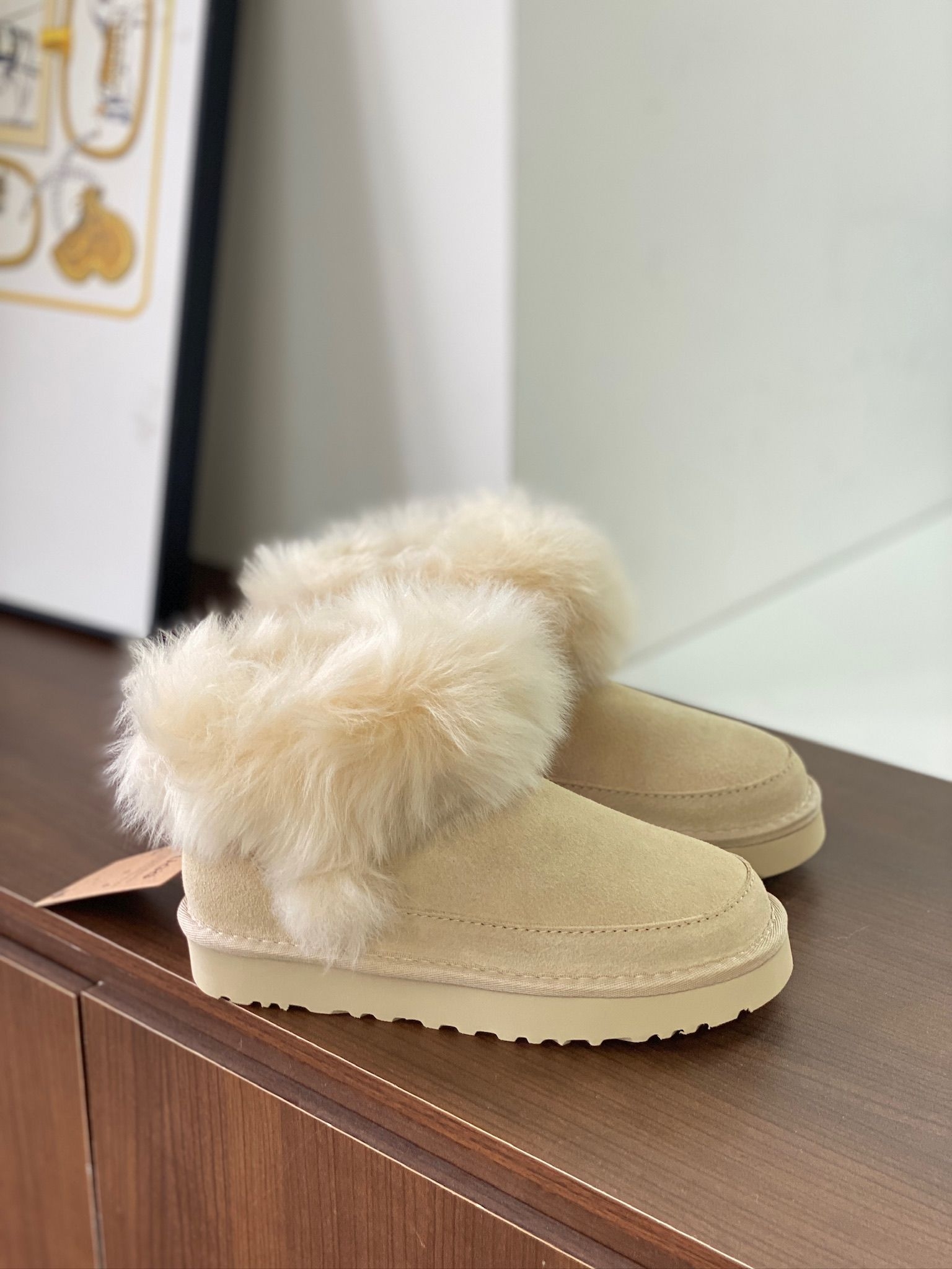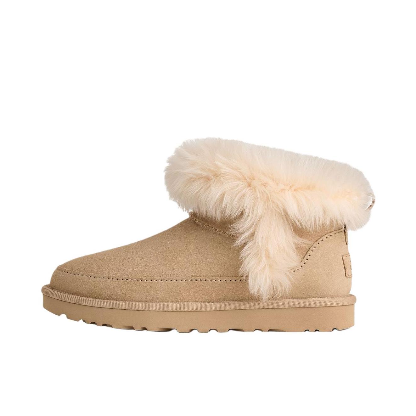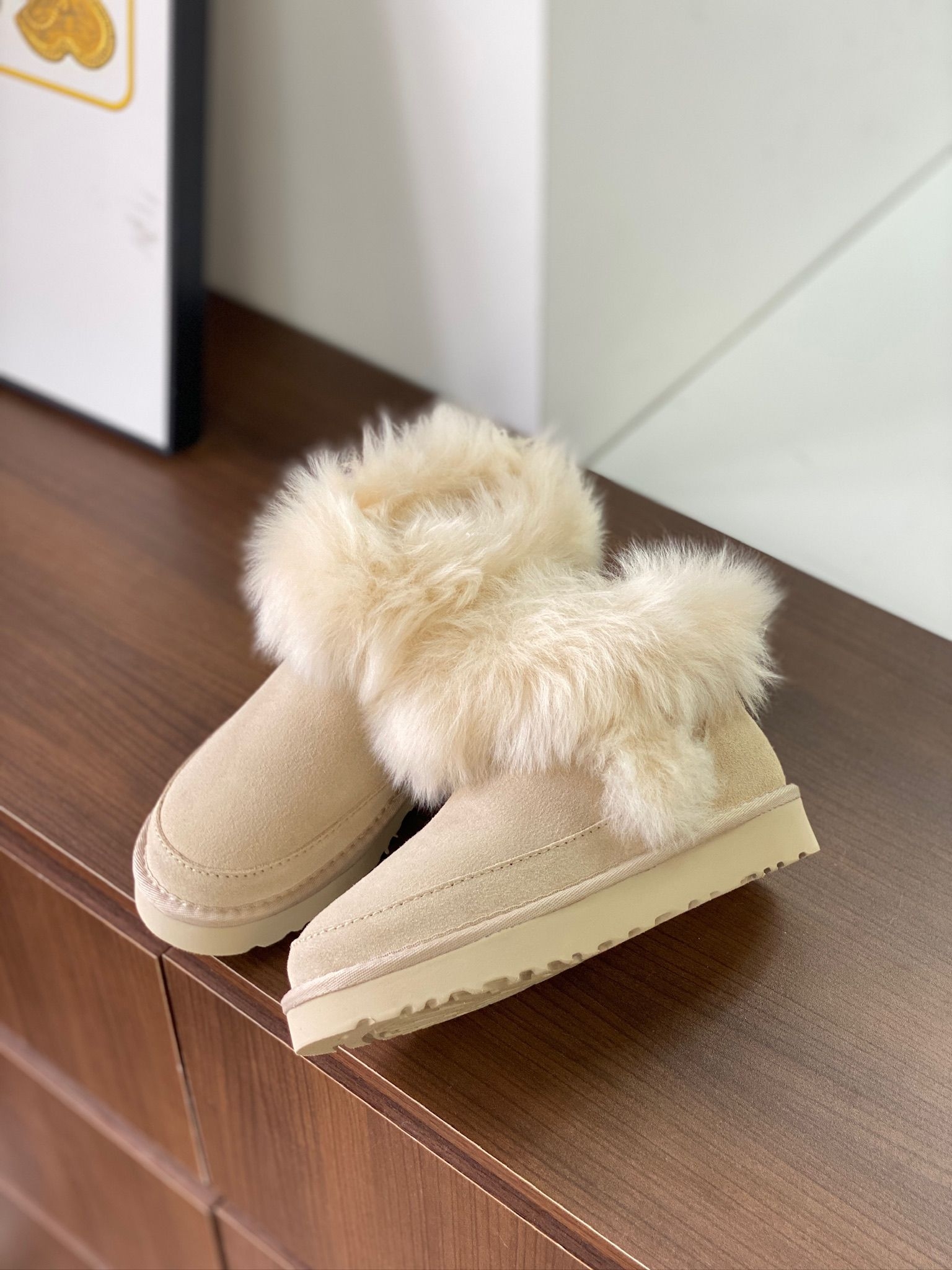 我的要求很明确:保暖是第一纪律,但不能笨重得像熊掌;好看是基本礼貌,得配得上她行李箱里的那些漂亮衣服。做了一圈功课,目标锁定了UGG的经典长毛款。在店里看到这双米色的Classic Novelty时,我觉得就是它了。