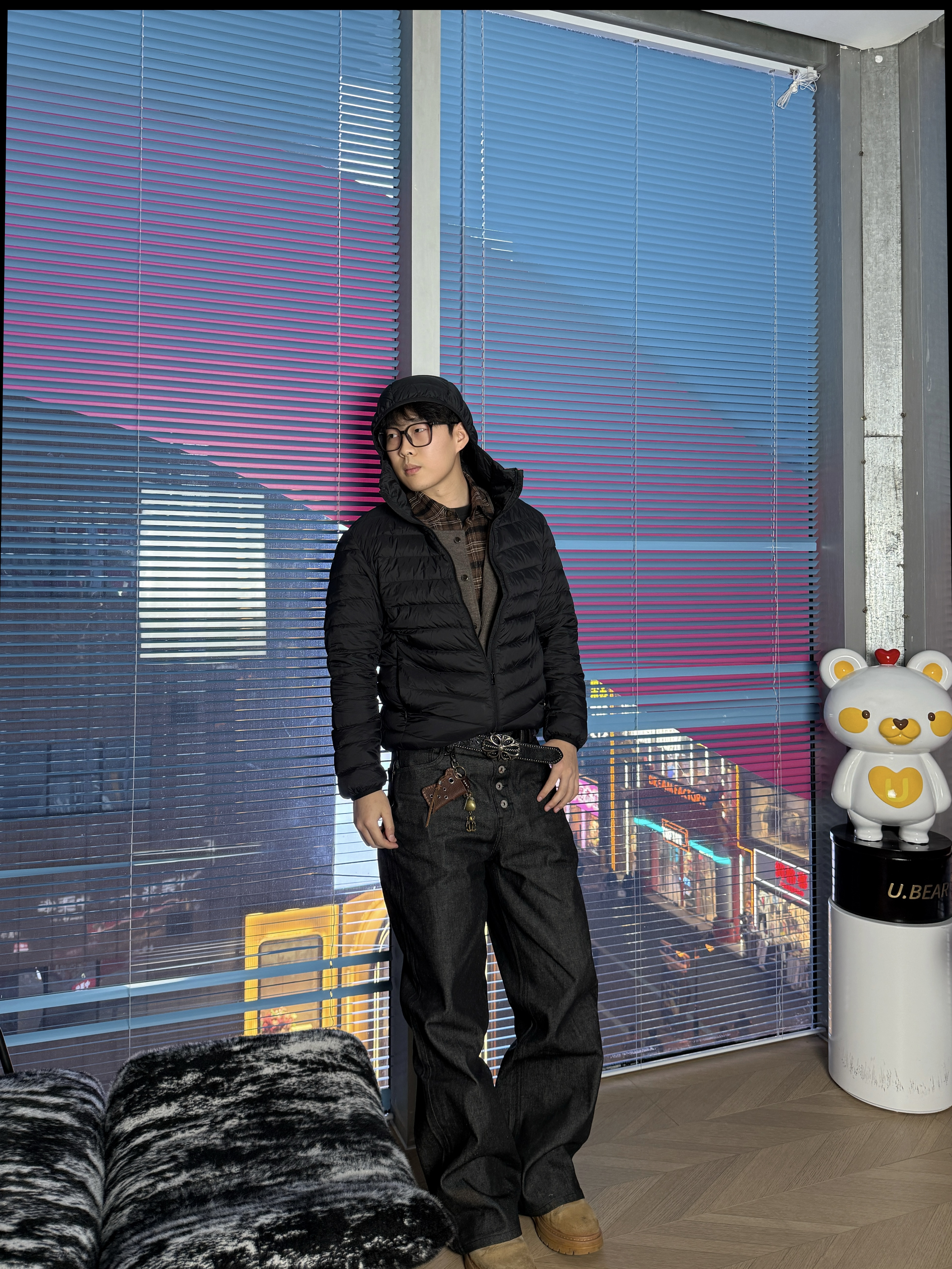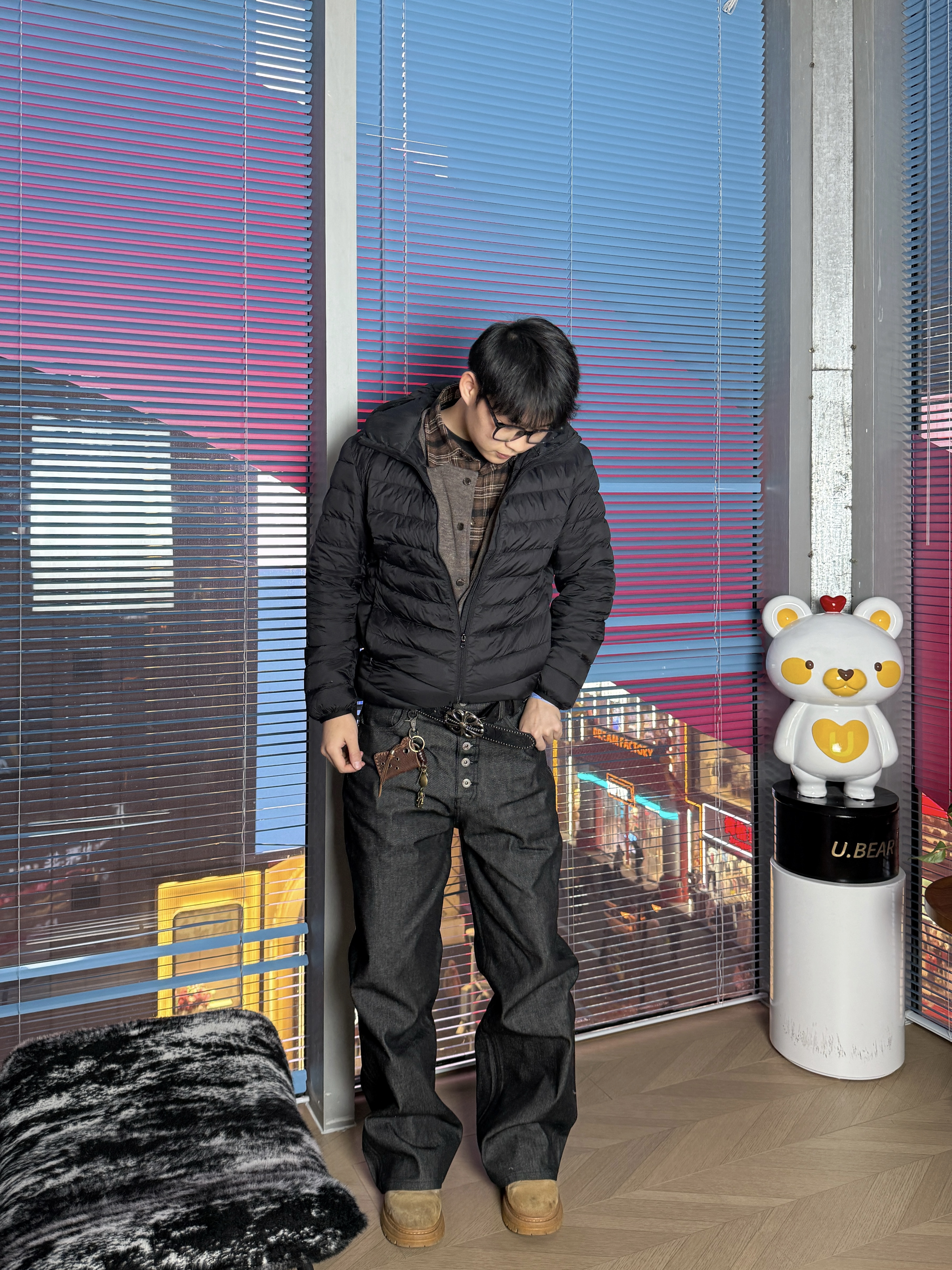 短款羽绒服可以很好修饰身材比例额 裤子有堆叠感 而且对退粗的兄弟很友好 鞋子是大黄靴 这样穿挺好看