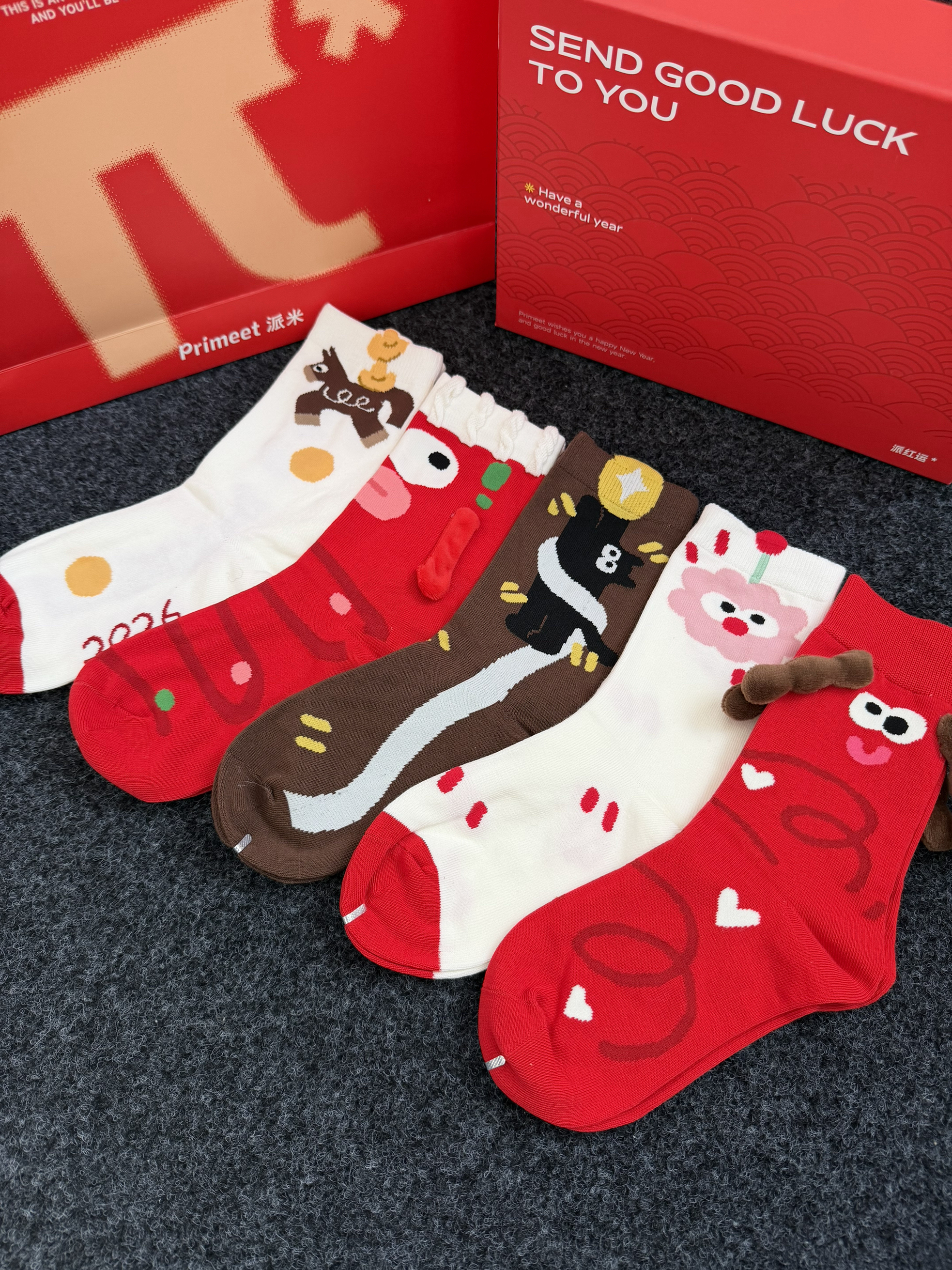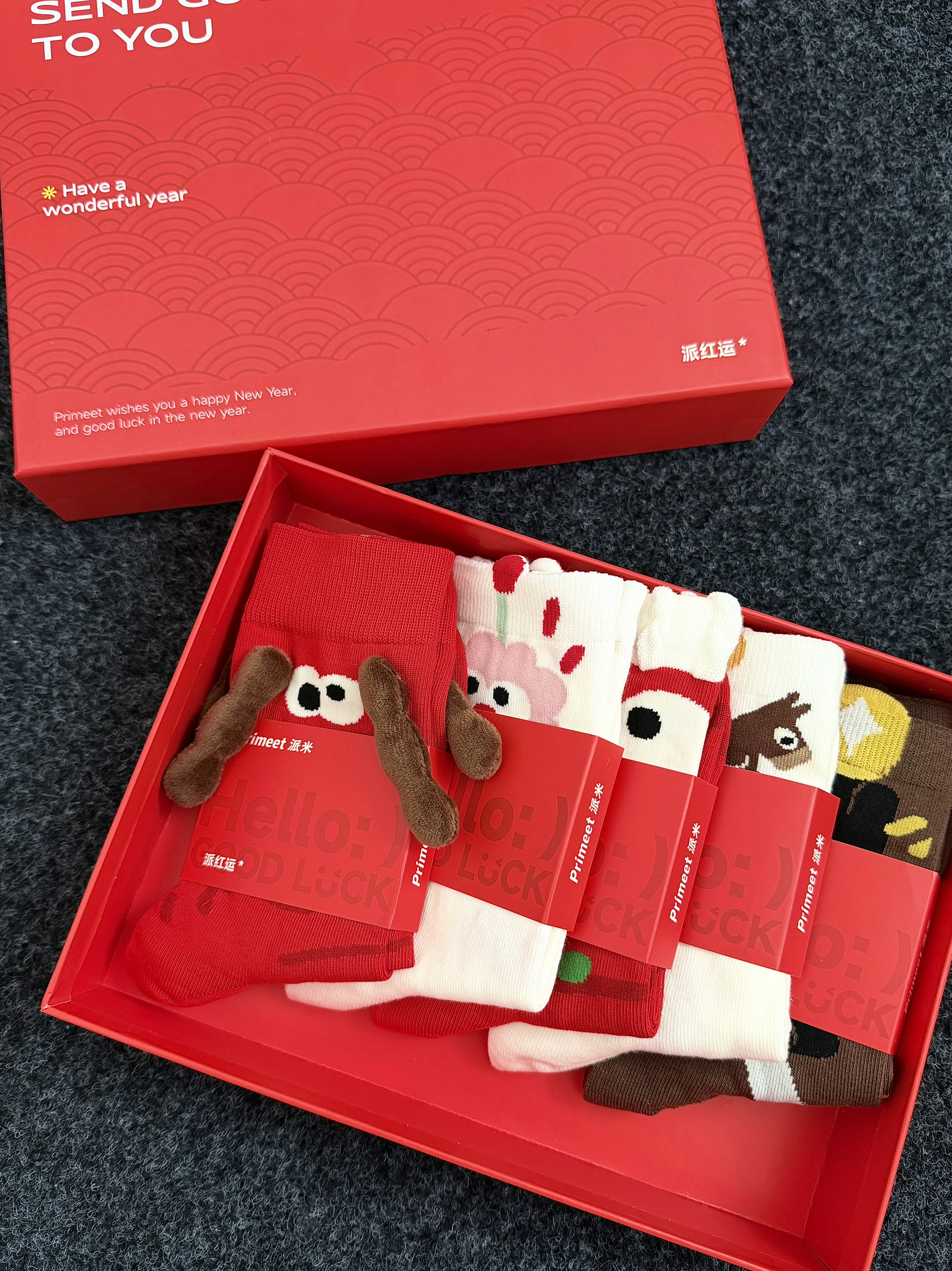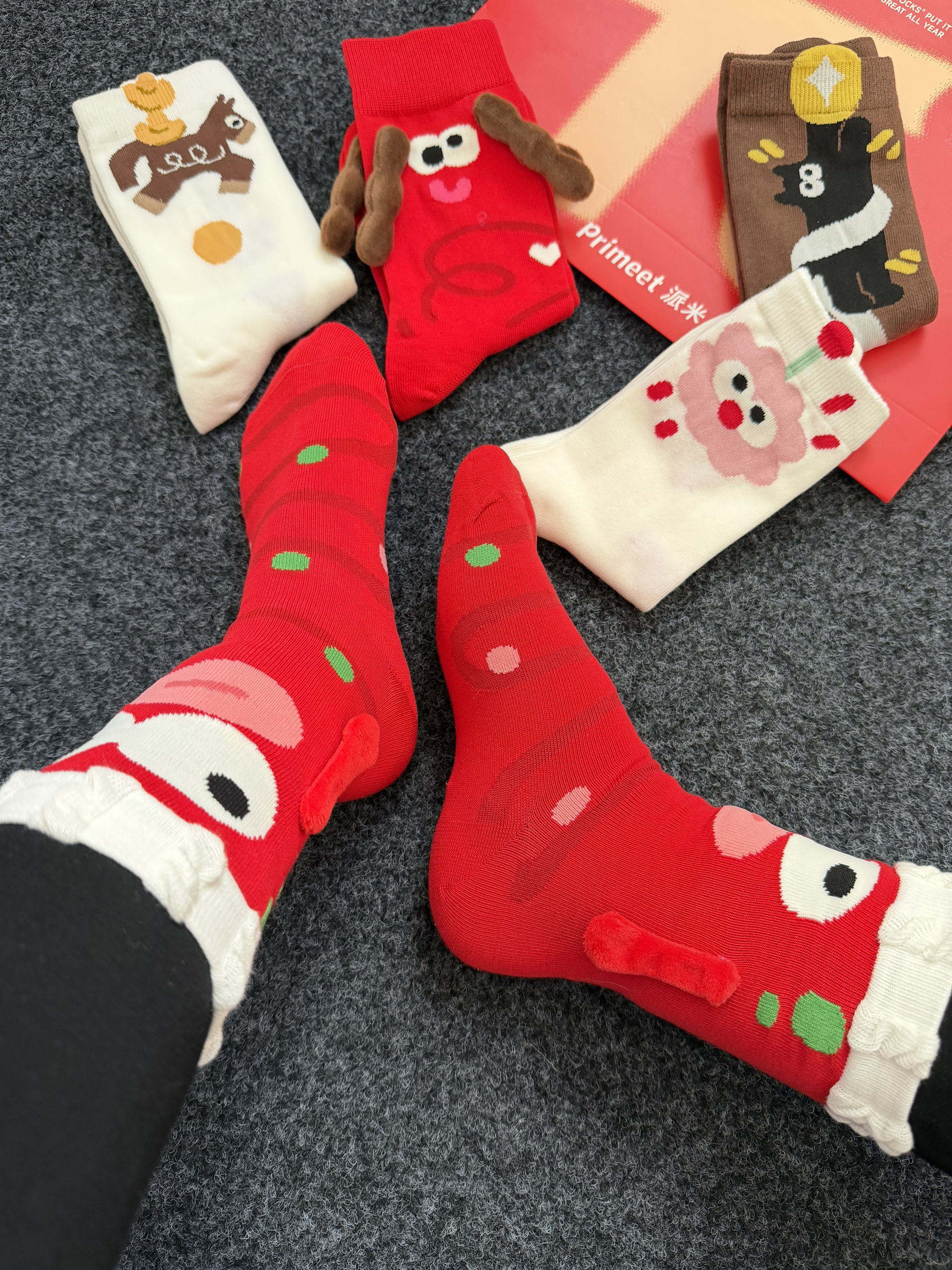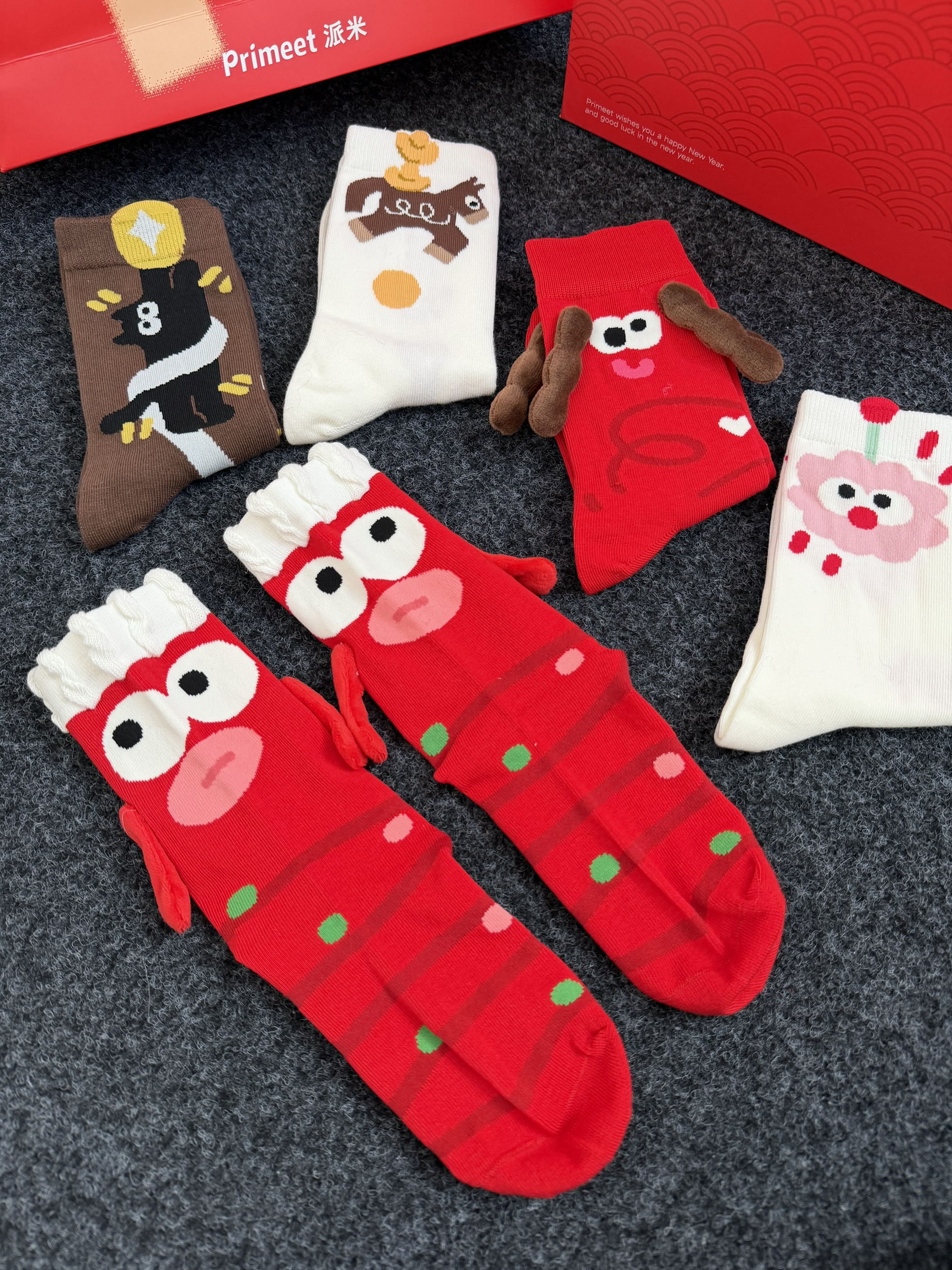 派米的这个礼盒袜子好有新年氛围感啊~ 俗话说新年就要穿红色的红红火火的🧨 这个袜子是新疆棉材质的吸汗力不错还透气亲肤~ 中高筒版型贴合腿部包裹性不错不松垮 走路久了也不掉跟柔软不磨脚好舒适的 每个都好可爱好有设计感🫶 红色的那双丑萌丑萌里面还有吸铁石可以拉手手~ 不仅是新年穿日常穿也完全没问题👌