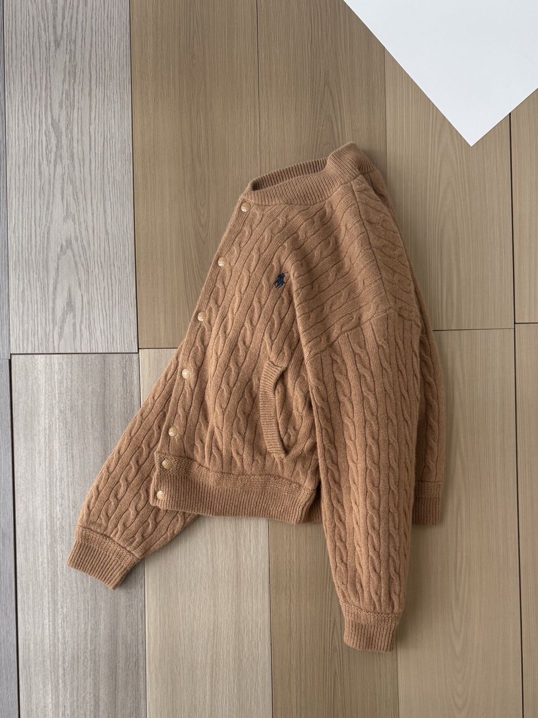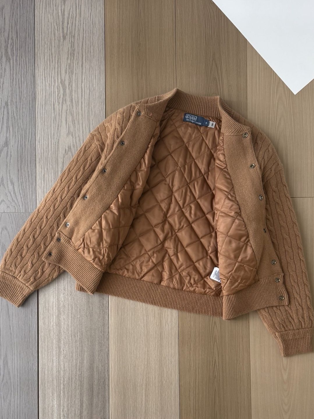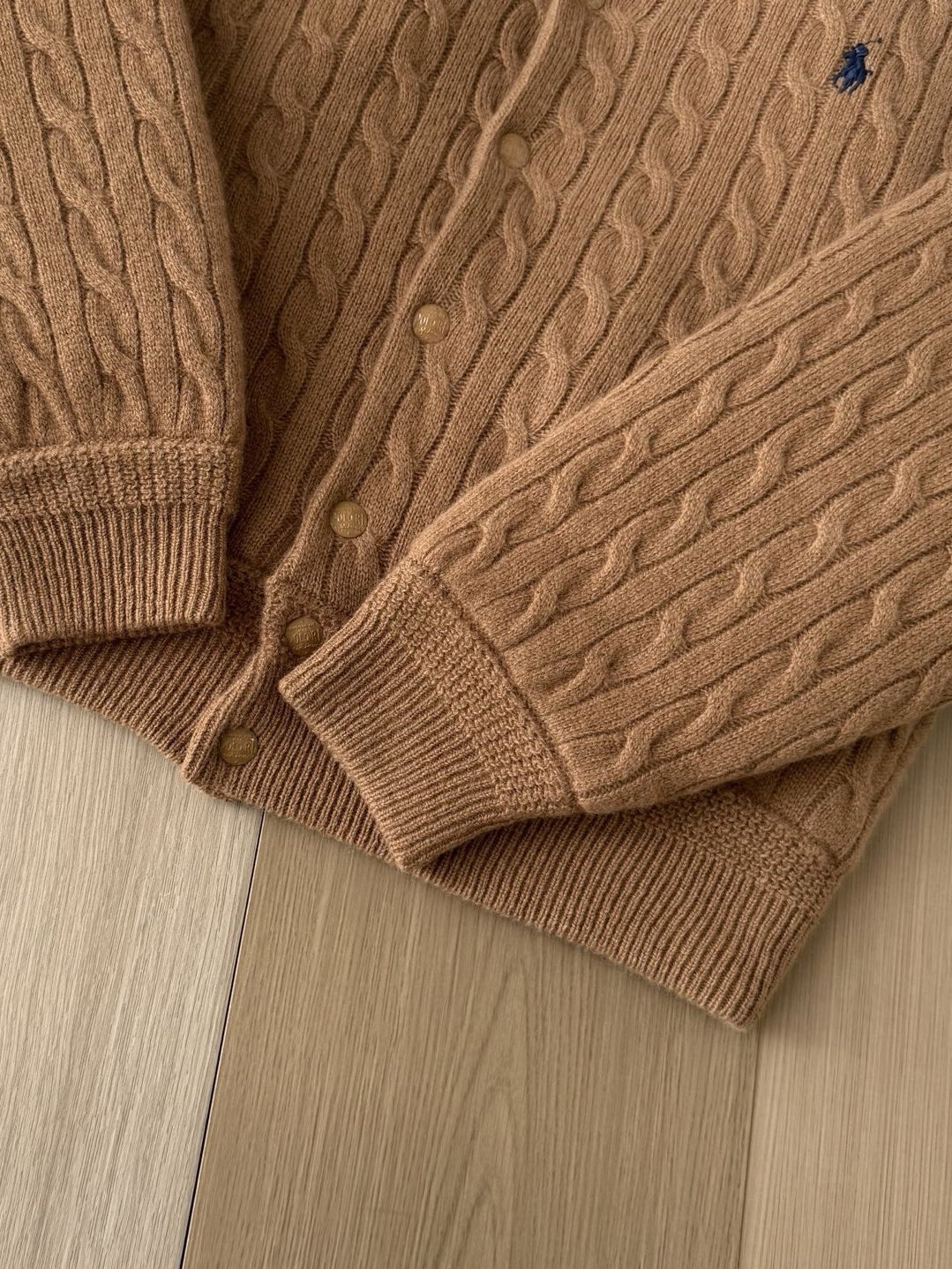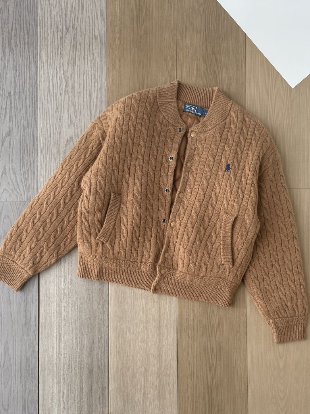 我让店员拿了一件卡其色。上手的第一感觉是厚实柔软,90%羊毛和10%羊绒混纺的粗针绞花,织出了清晰的立体纹理,触感温暖。最打动我的是它的结构:棒球领和灯笼袖的休闲基因,被规整的绞花针织和精致的菱格绗缝内里重新“驯化”,呈现出一种松弛的秩序感。左胸上那个小小的蓝色Polo Pony刺绣,像一句优雅的署名。立体的模压徽标按扣,每一次开合都带有扎实的“咔嗒”声,充满仪式感。