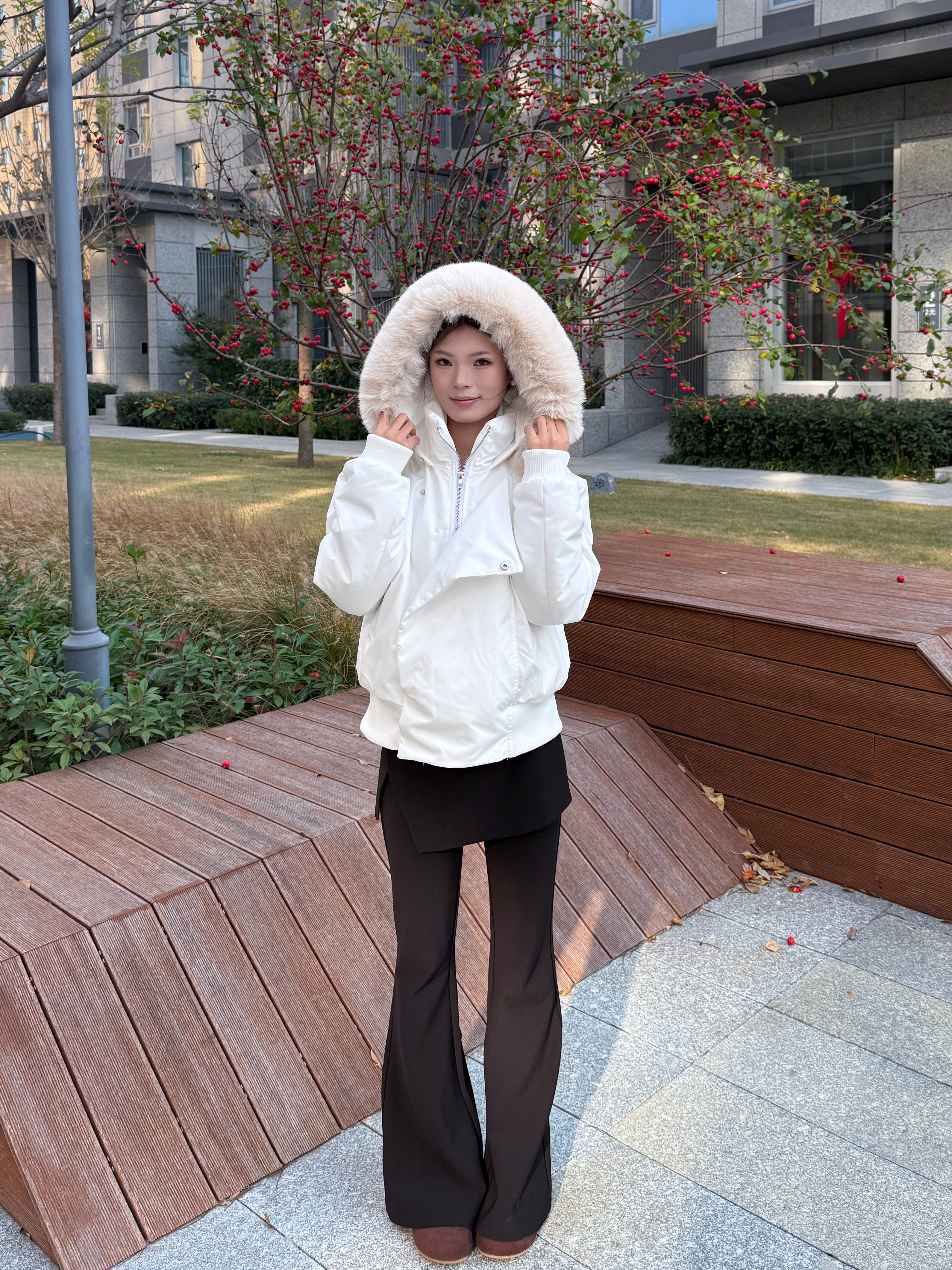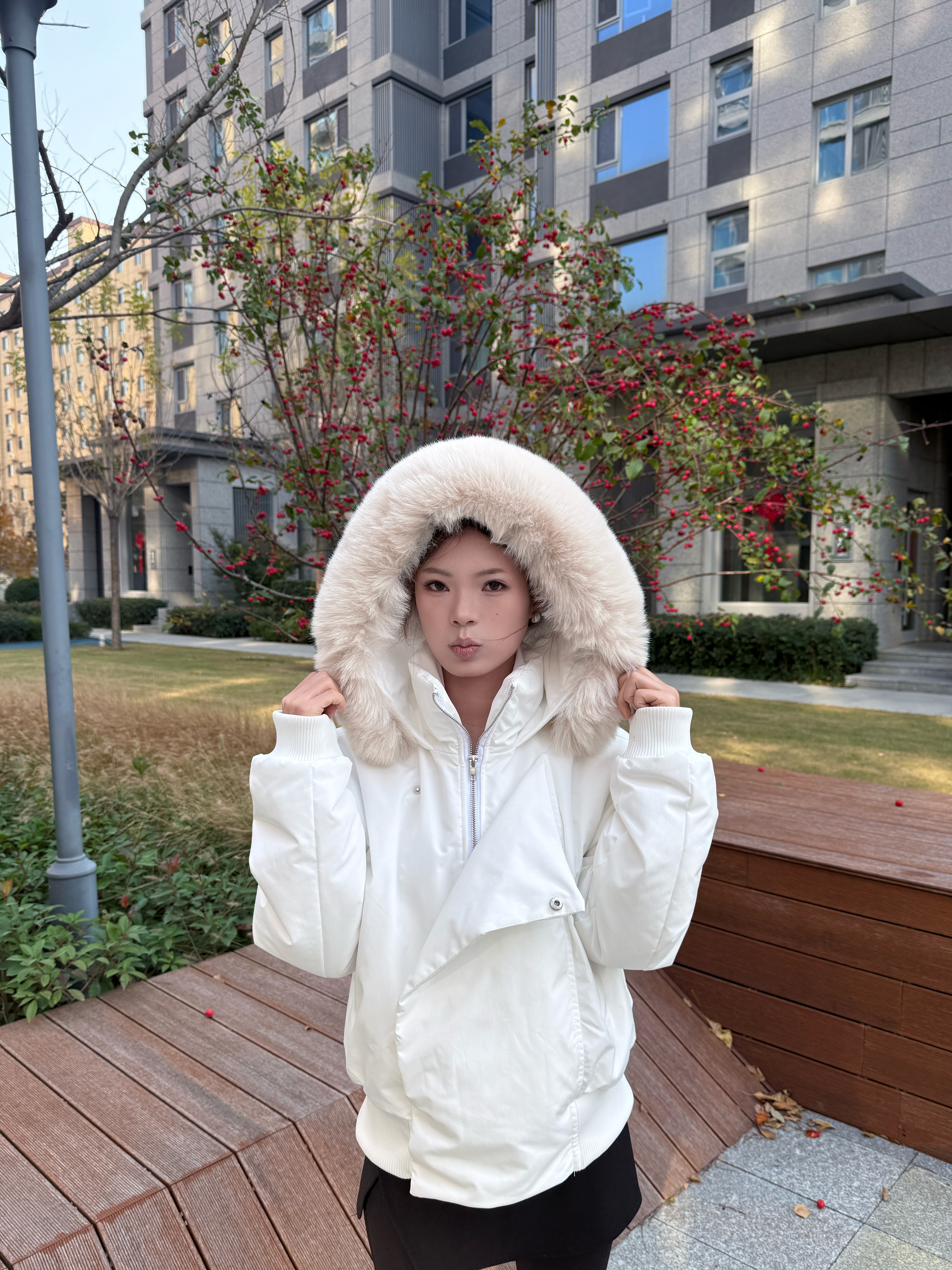 当寒风开始肆虐,一件蓬松柔软的白色羽绒服就是冬日里的时尚救赎。毛领蓬松又显贵,把脸藏进去瞬间被暖意包裹,仿佛把云朵戴在了头上~ 简洁的白色衣身是冬日的“百搭画布”,配黑色裤子利落又高级,哪怕只是在小区的海棠树旁随手一拍,都像把冬日的清新与温柔穿成了画报 它不只是保暖的“铠甲”,更是让你在冷冽里依旧明媚的时尚单品,穿上它,去拥抱属于你的每一个温暖又时髦的冬日吧~😍
