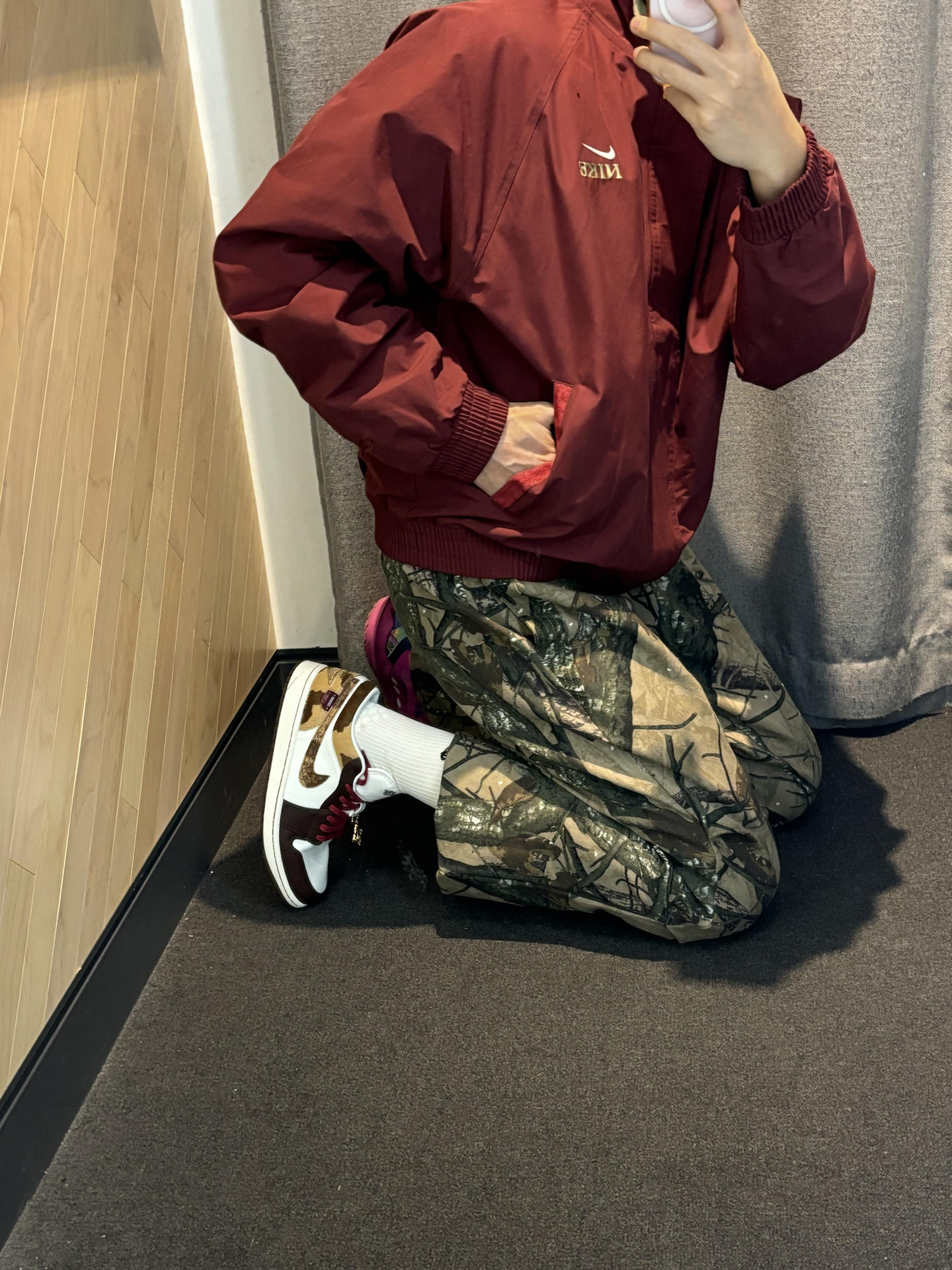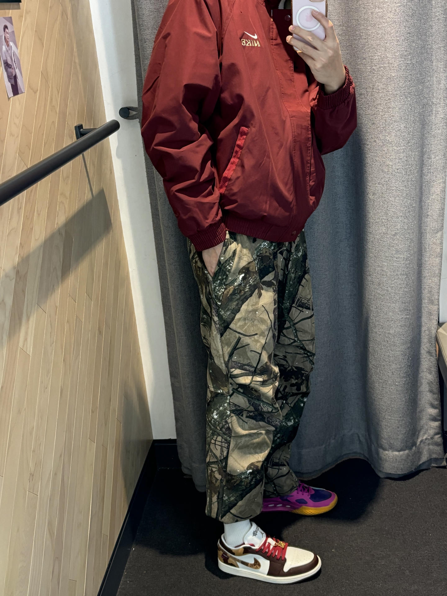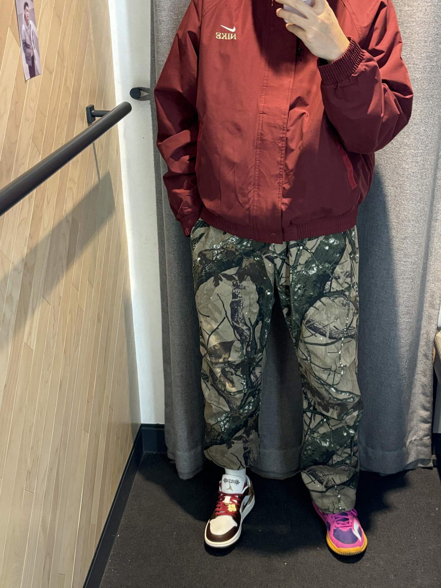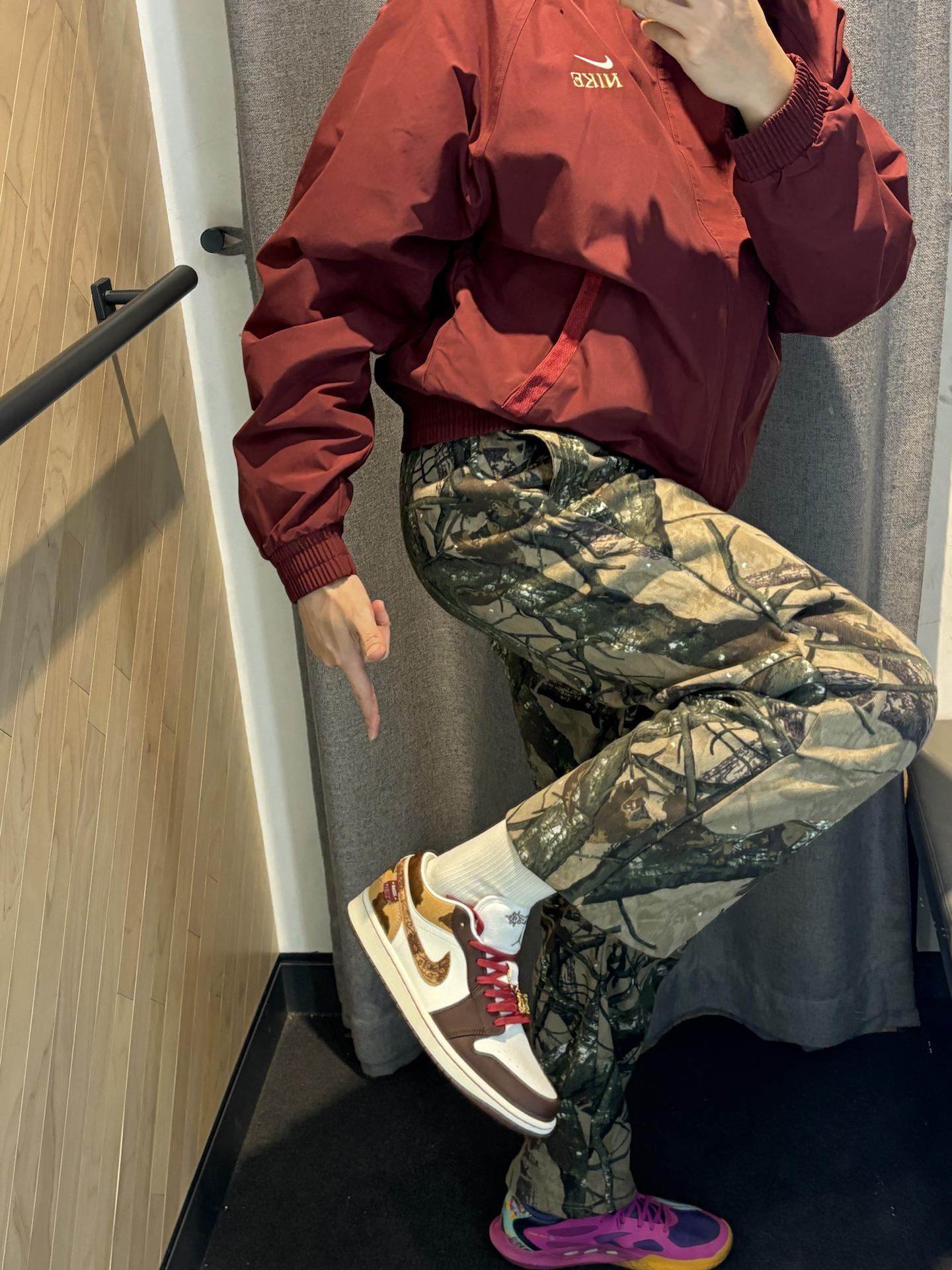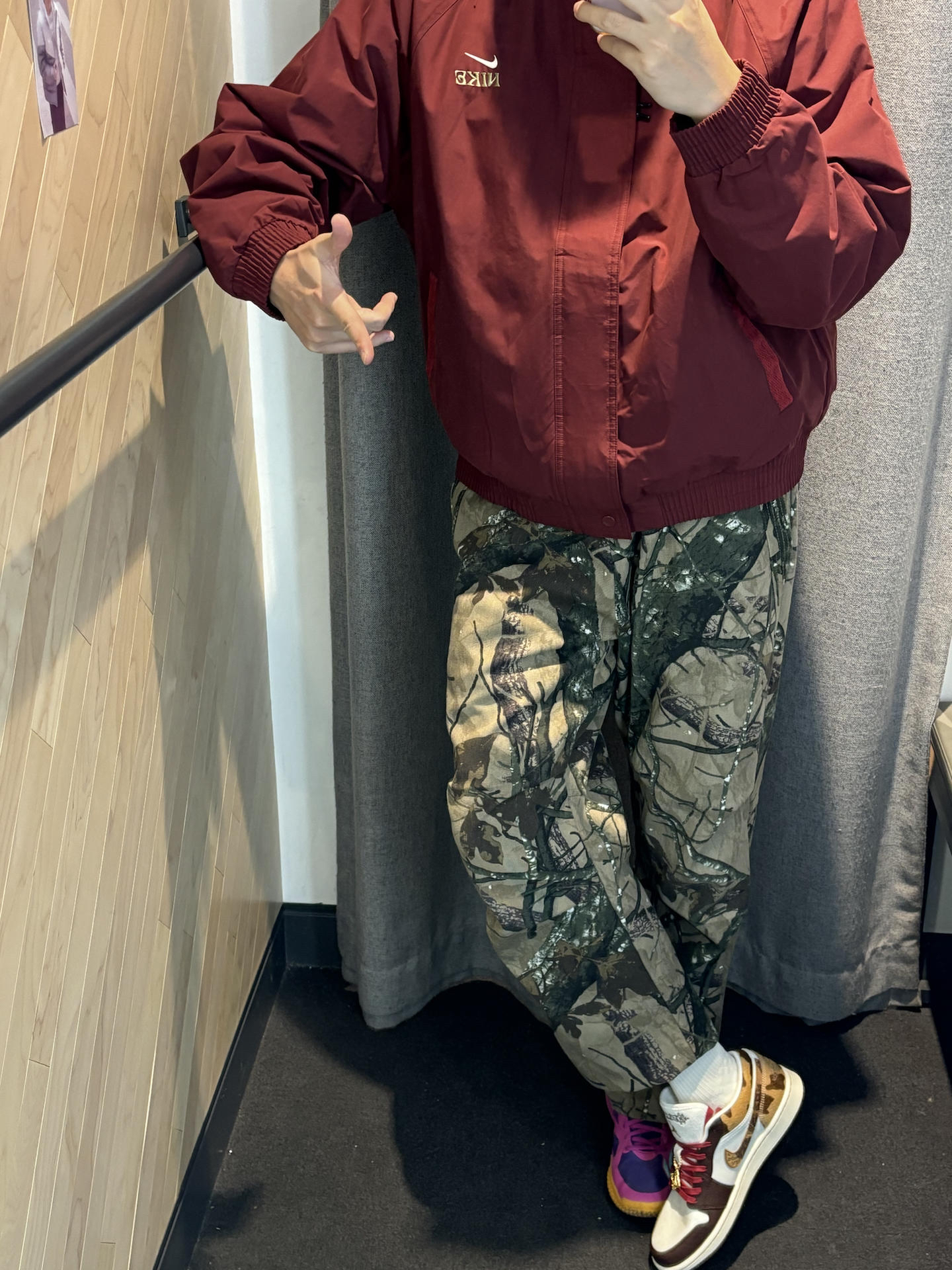 #不露腿更时髦 这一套寒假直接出街抄作业就行了 暗红色很好驾驭男女都可以 这件外套很力挺里面还加厚绒还是高领设计 搭配条直通牛仔裤 今年很流行直筒的版型里面加个保暖裤就行 搭配一双马年限定aj1 暗红色这一套呼应很有质感还高级 👟aj1马年限定 👔nike马年限定外套 👖uzis迷彩