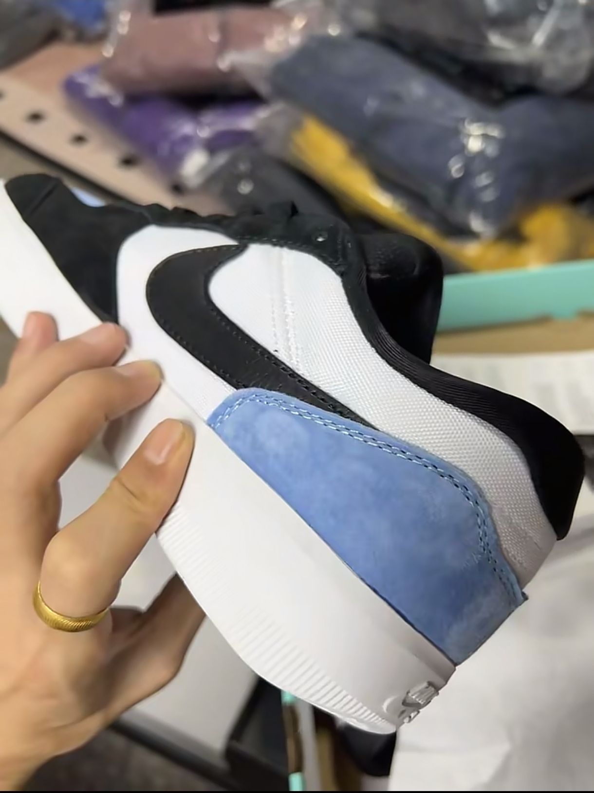 实物比图片还要有质感! 蓝色的麂皮鞋面摸起来软糯又扎实 黑色的勾子和内衬做撞色点缀 上脚后包裹感和支撑性都不错 日常通勤或者滑板运动穿都很合适 性价比和颜值双在线的一双鞋~