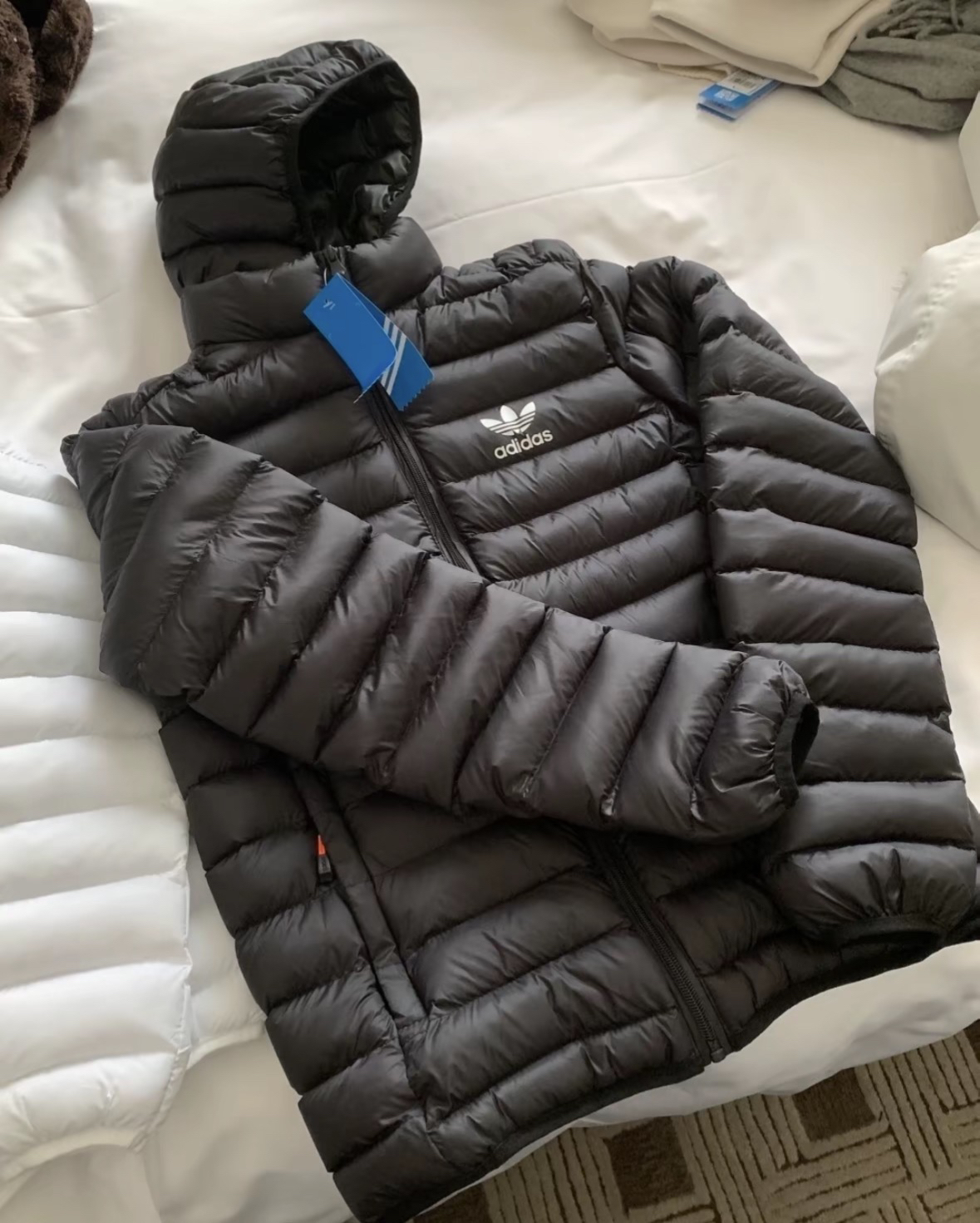 adidas这件轻薄羽绒太实用了,竖纹绗缝看着就平整,完全没负重感。黑白两色经典,三叶草logo点缀刚好。面料防风,帽子带抽绳很细节。关键是收纳特别方便,叠起来就巴掌大。通勤塞包里或者搭卫衣穿都行,轻便又暖和