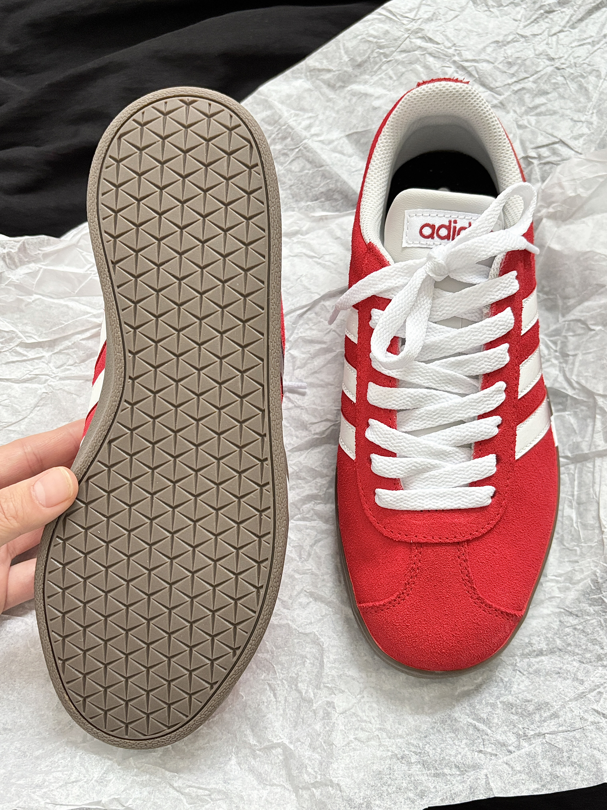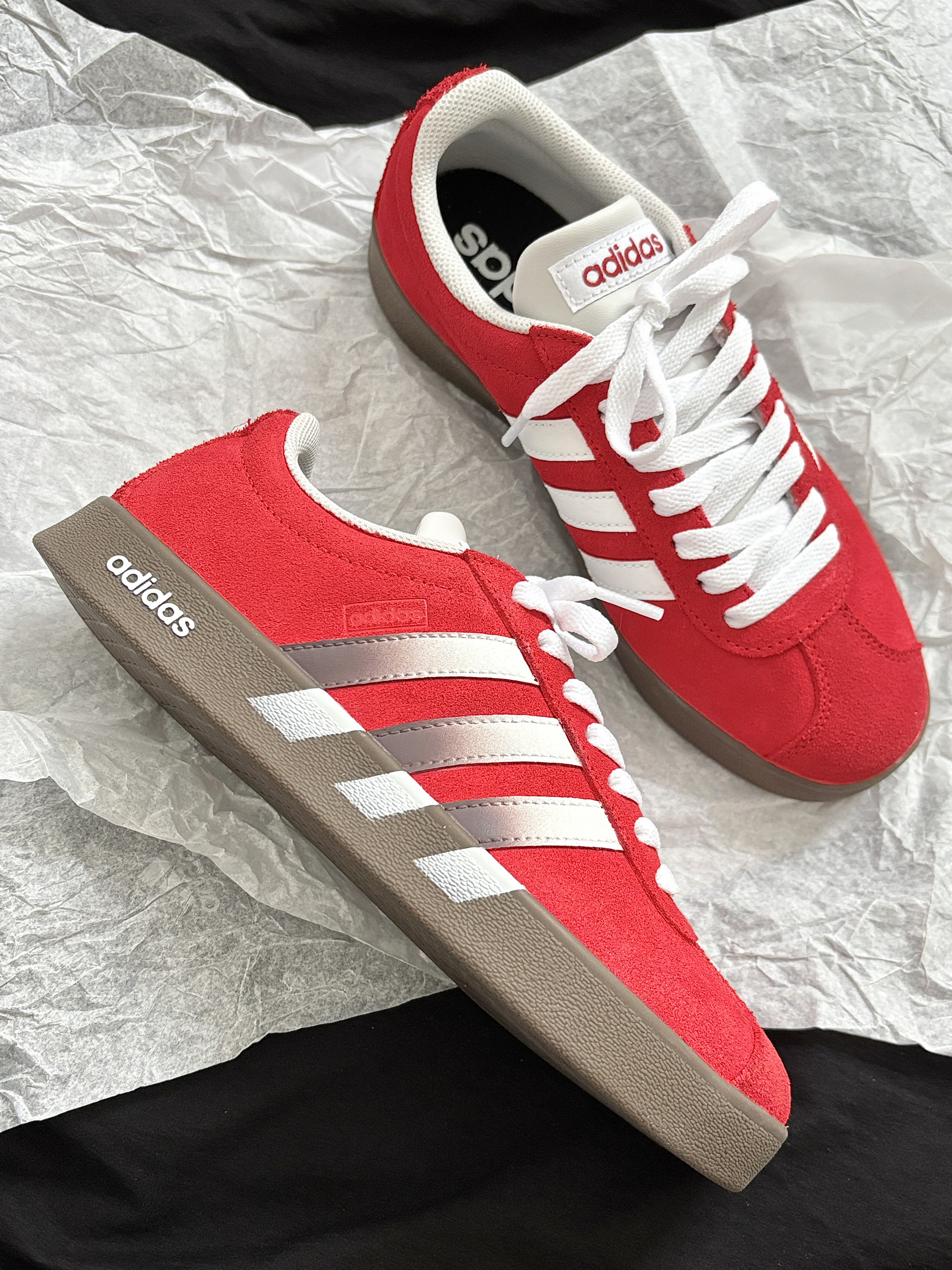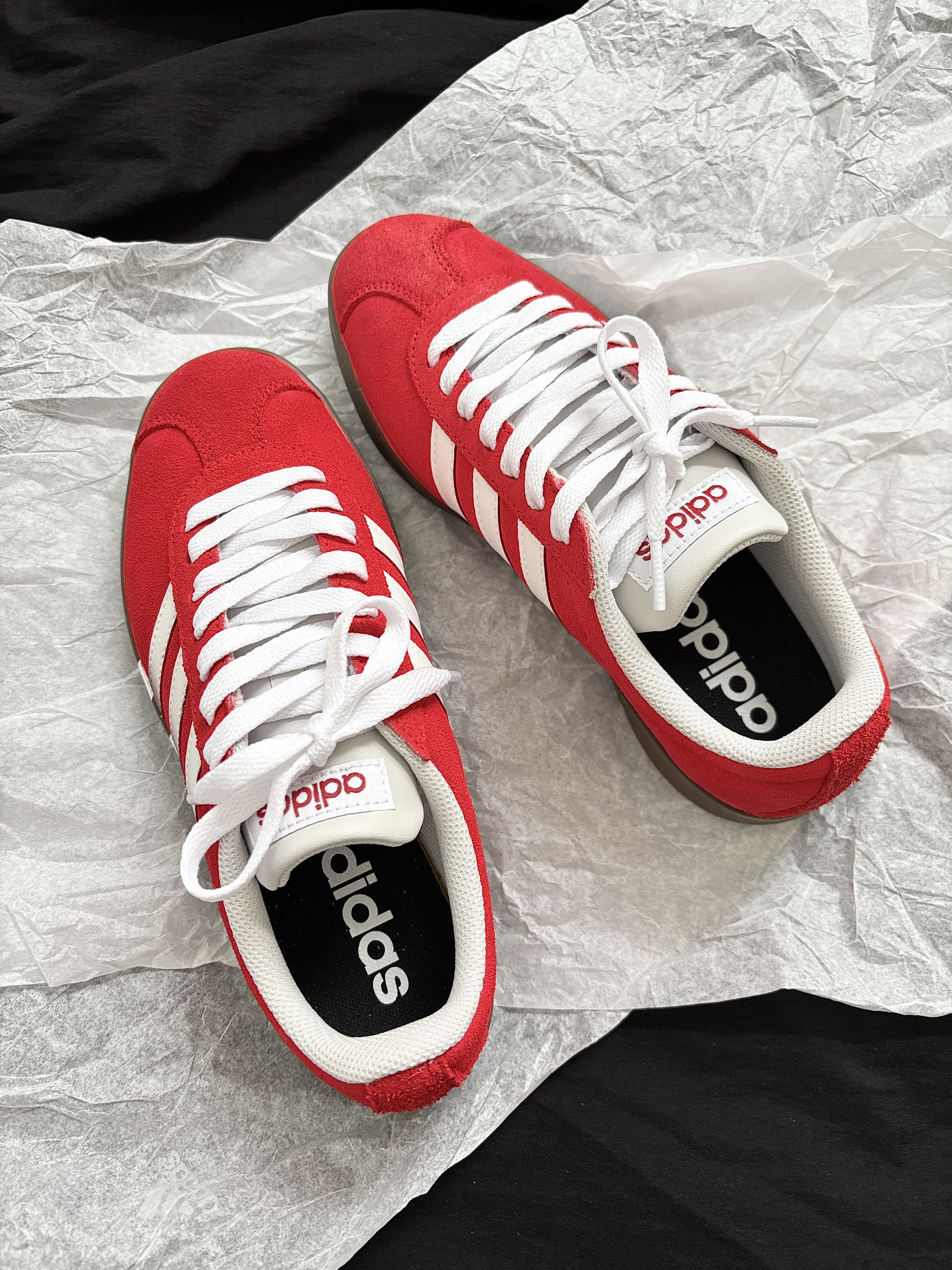 整点双旦氛围感 那就要整点红色啊! adidas 这双定制鞋子不要忒合适~ 板鞋上脚舒适柔软摸起来也是软软的 低帮芭蕾风设计还挺特别的 翻毛皮的材质质感很欧克👌 配牛仔裤、小裙子都很搭日常出街舒服又吸睛 忒爱这种不费力就能穿出时尚感的小东西哎~