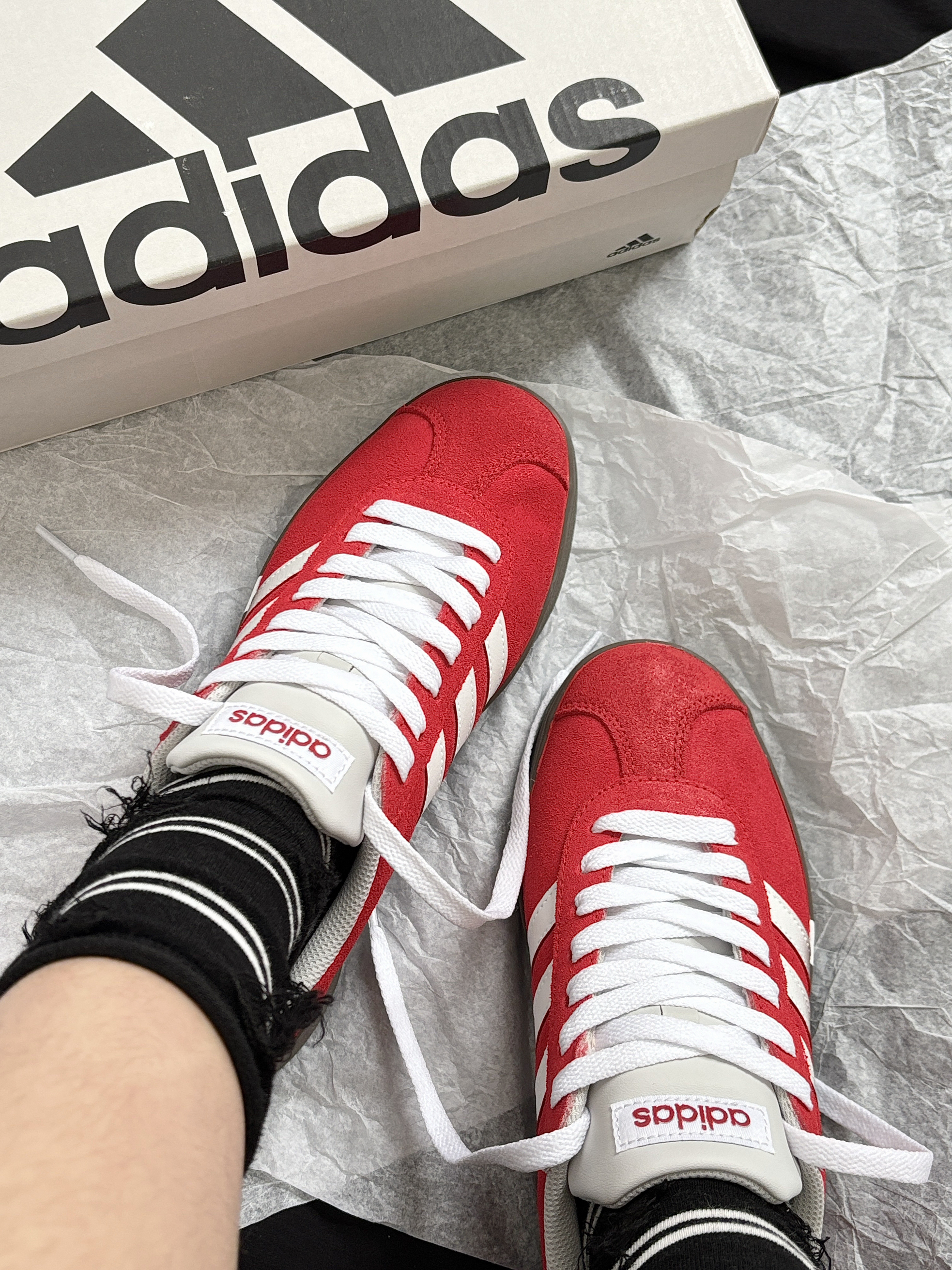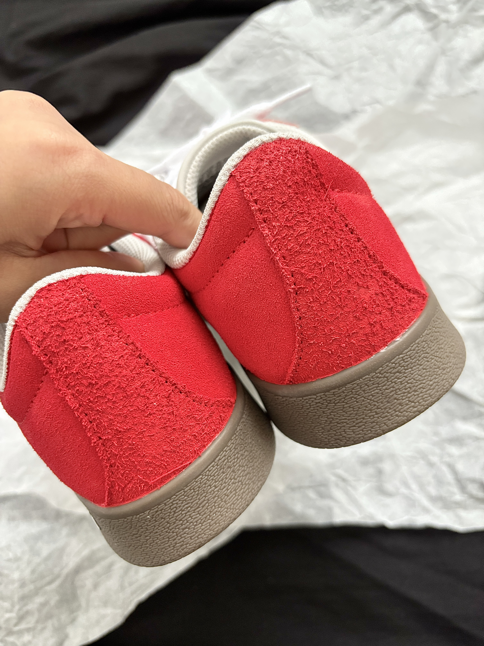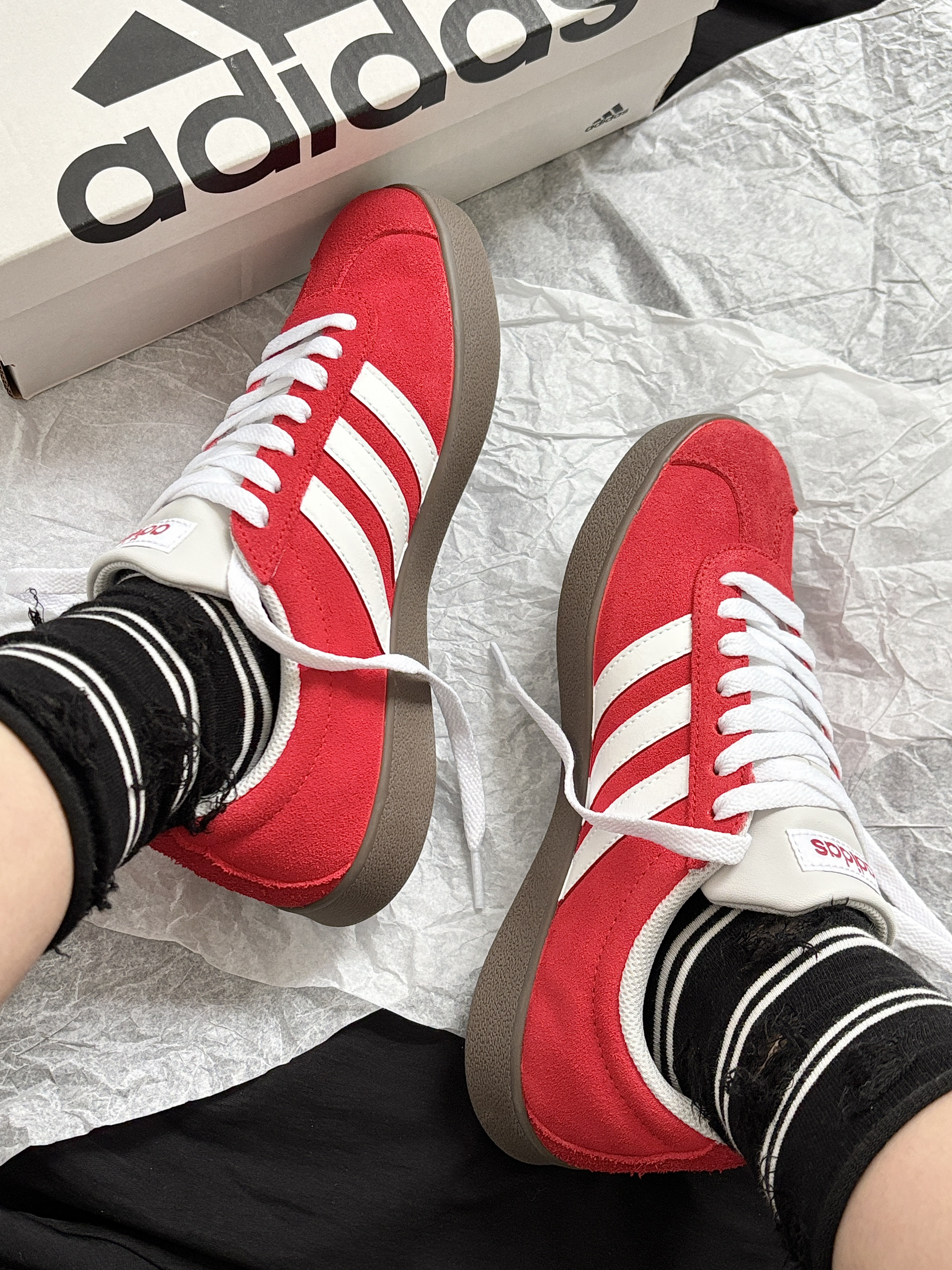 整点双旦氛围感 那就要整点红色啊! adidas 这双定制鞋子不要忒合适~ 板鞋上脚舒适柔软摸起来也是软软的 低帮芭蕾风设计还挺特别的 翻毛皮的材质质感很欧克👌 配牛仔裤、小裙子都很搭日常出街舒服又吸睛 忒爱这种不费力就能穿出时尚感的小东西哎~