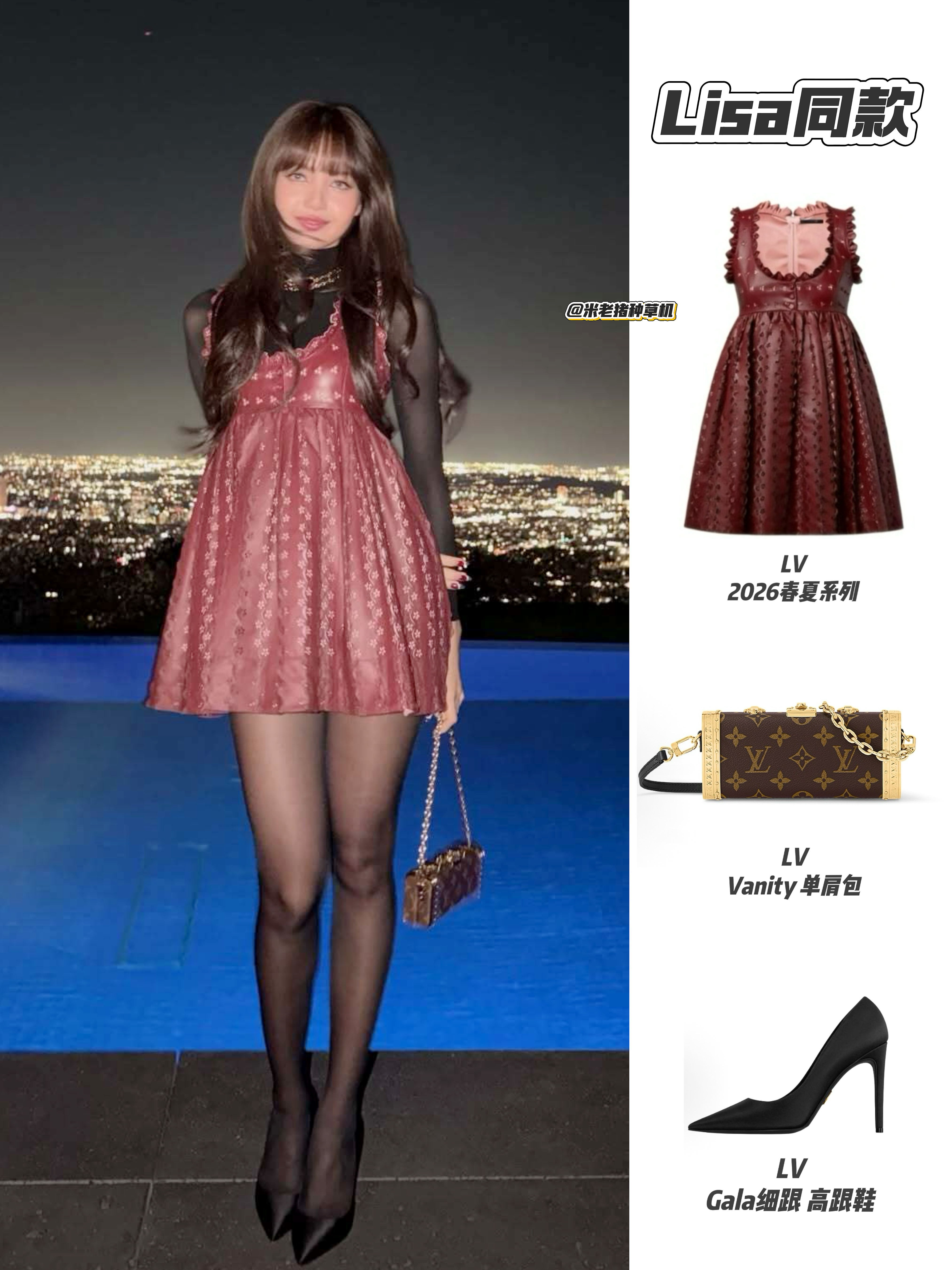 这套穿搭以LV 2026春夏系列酒红色连衣裙为主,搭配黑色内搭和丝袜,既保留了甜美元素,又通过深色内搭平衡了甜度,显得高级又不失活泼。 搭配同品牌的经典手袋和高跟鞋,造型精致统一,非常适合Lisa的甜美又带点小性感的风格。