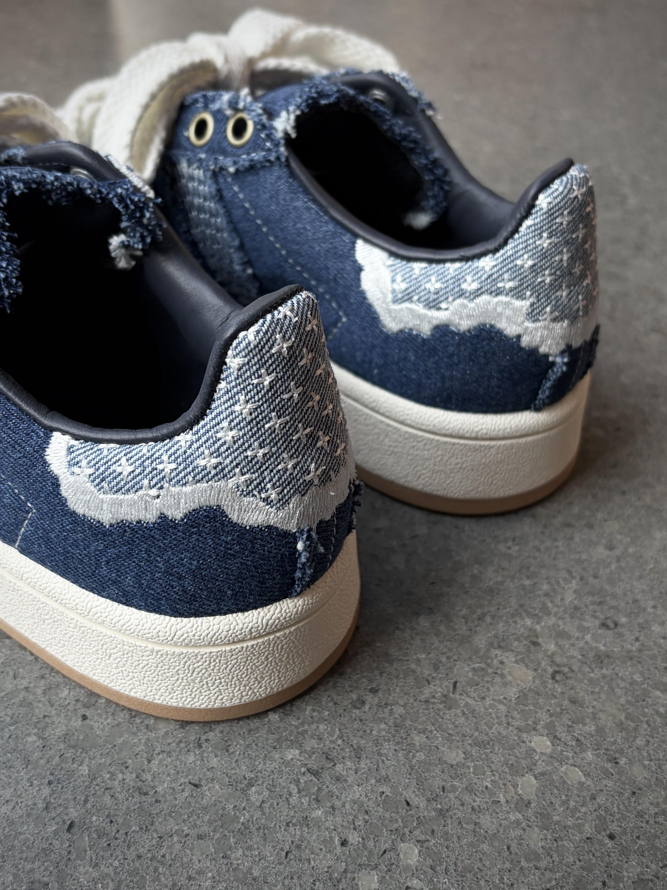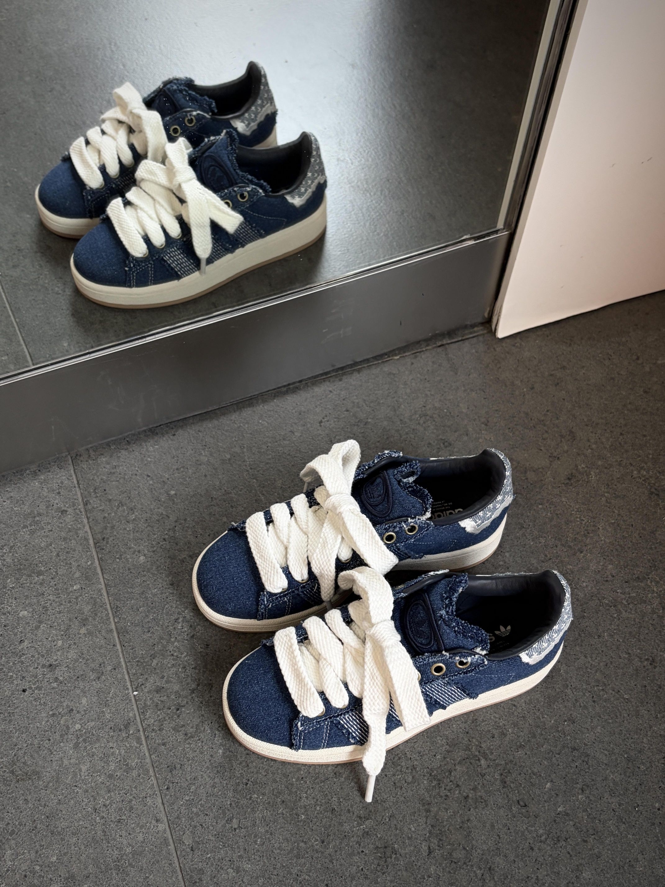 蓝牛仔面料质感👍🏻 鞋后跟的蕾丝细节太戳我了!粗粗的白鞋带配金属鞋带孔,复古那味儿一下就上来了~😎 做旧毛边缝线三条纹又多了几分随性的时髦感😏