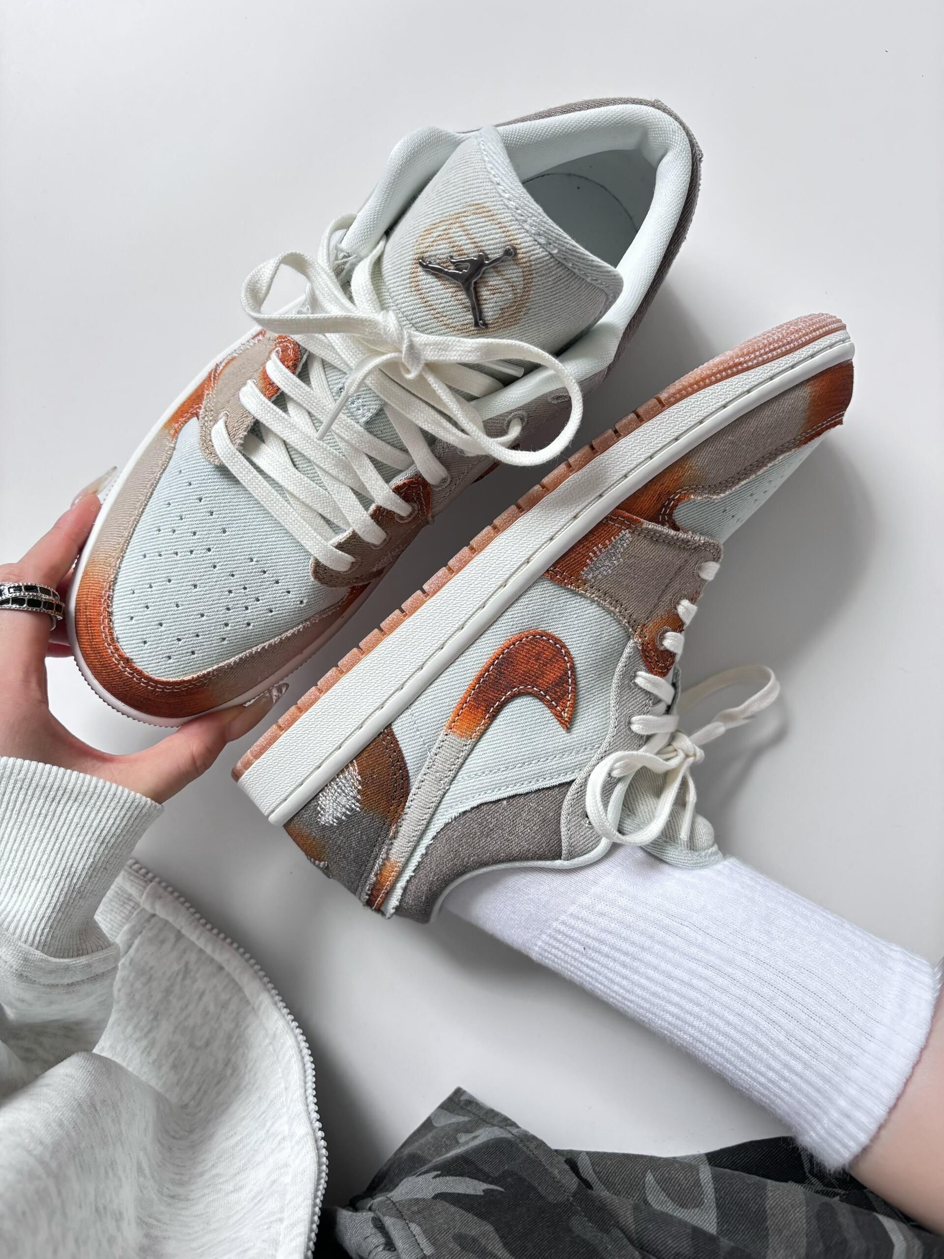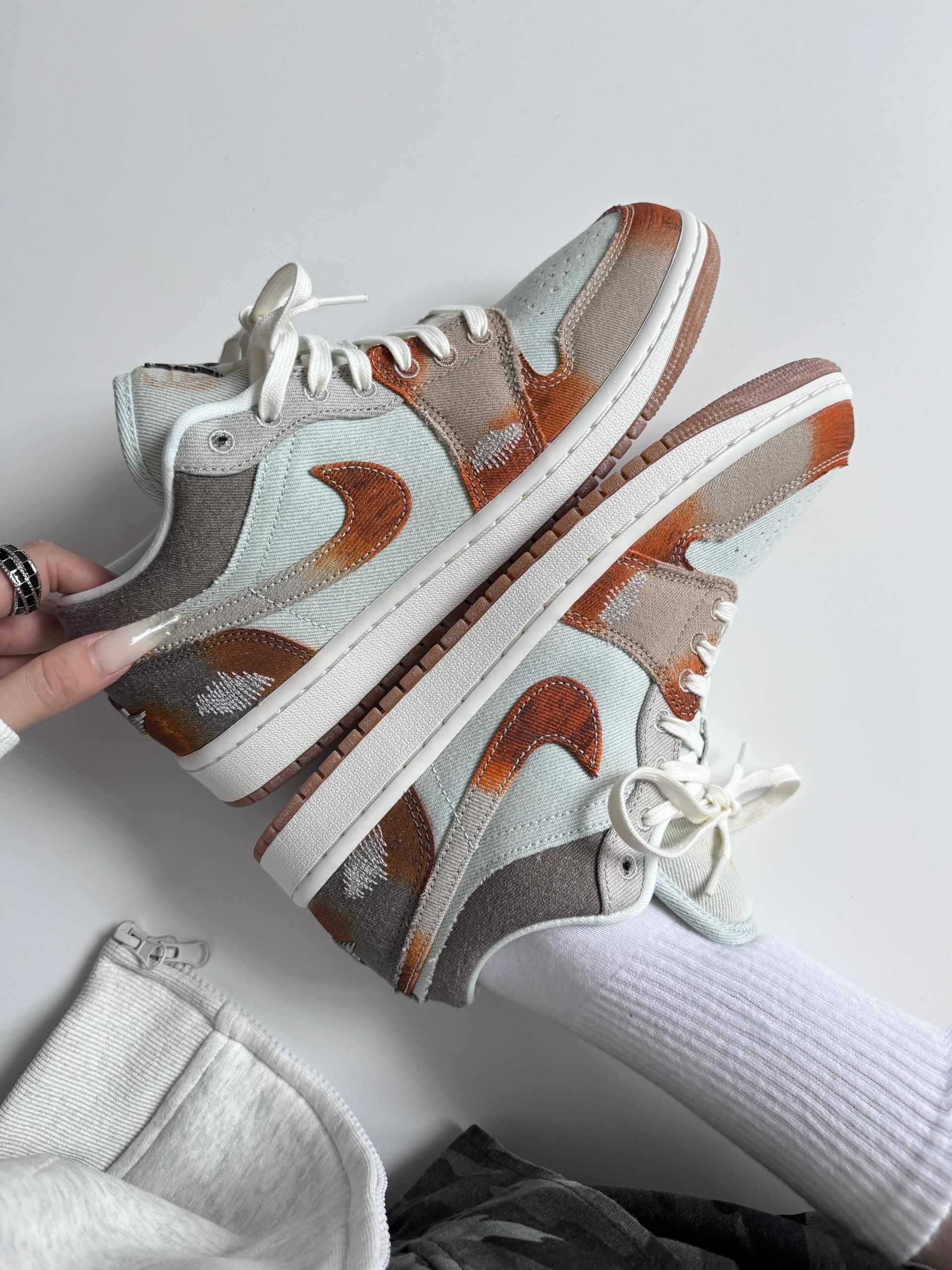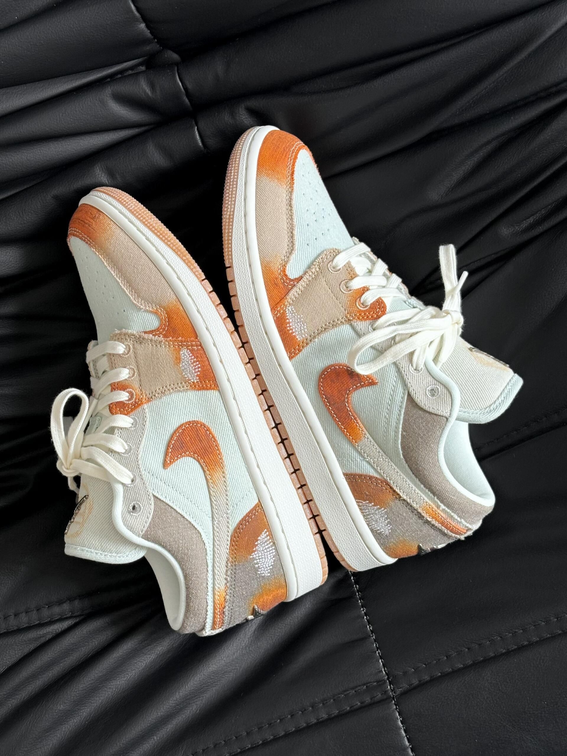 👟这双AJ1 Low SE“做旧牛仔”配色,浅蓝、卡其、棕色水洗牛仔布拼接,复古感满满!鞋舌和后跟金属飞翼Logo+小飞人标志,细节超有辨识度✨。低帮设计,日常通勤、街头穿搭都OK,牛仔裤、工装裤随便搭。牛仔布透气耐磨,做旧纹理每双都独一无二,生胶做旧鞋底,复古又实用,秋冬穿超有氛围感🍂。