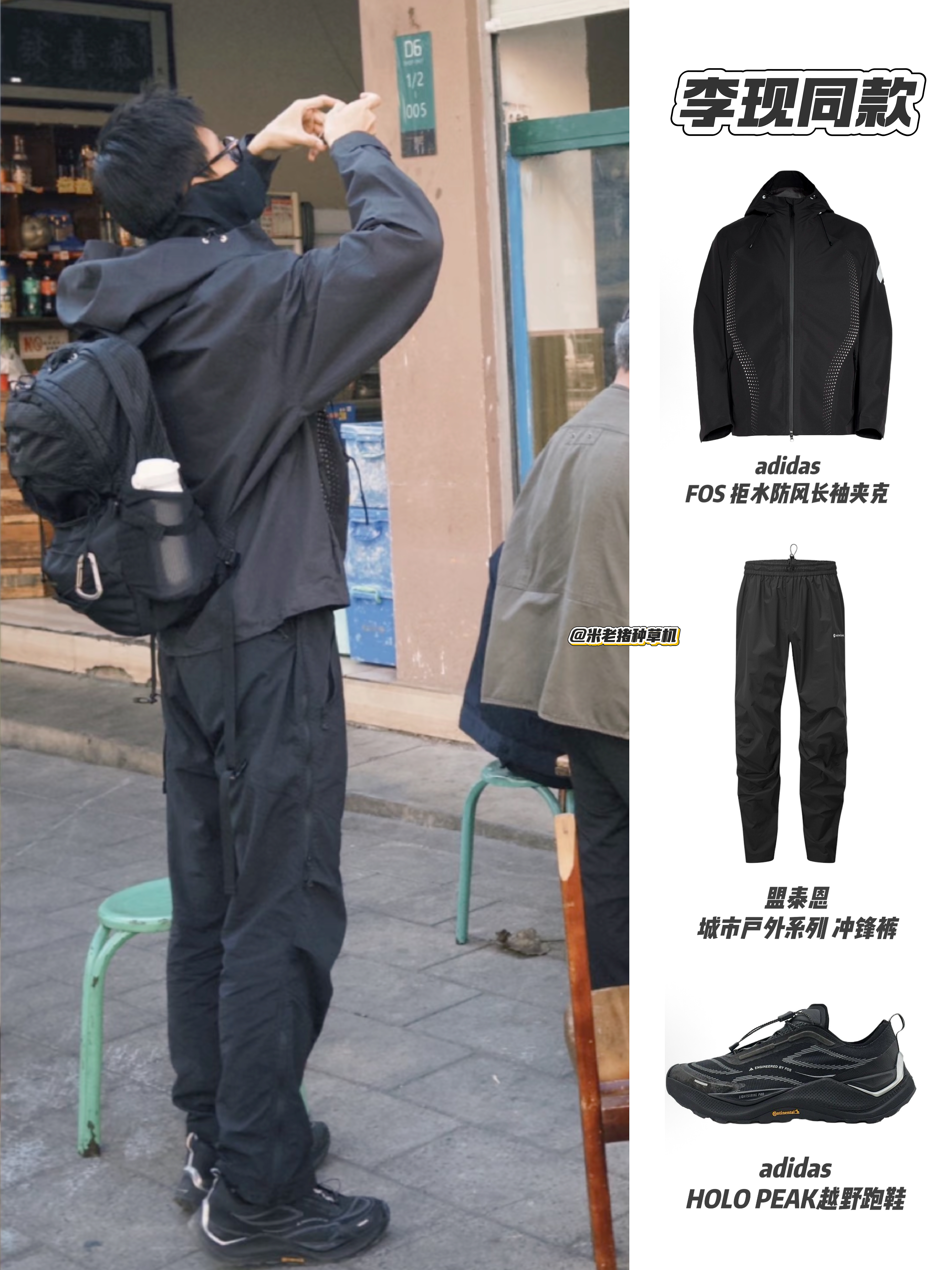 全黑也能穿出层次感!李现的户外穿搭太会了👍🏻 adidas拒水防风夹克搭配盟泰恩冲锋裤,面料兼顾透气性与功能性,满印冲孔设计和反光细节暗藏巧思。搭配阿迪越野跑鞋,整体造型利落干练,既适合城市通勤应对多变天气,也能轻松解锁轻户外场景,是秋冬男生闭眼入的穿搭模板~