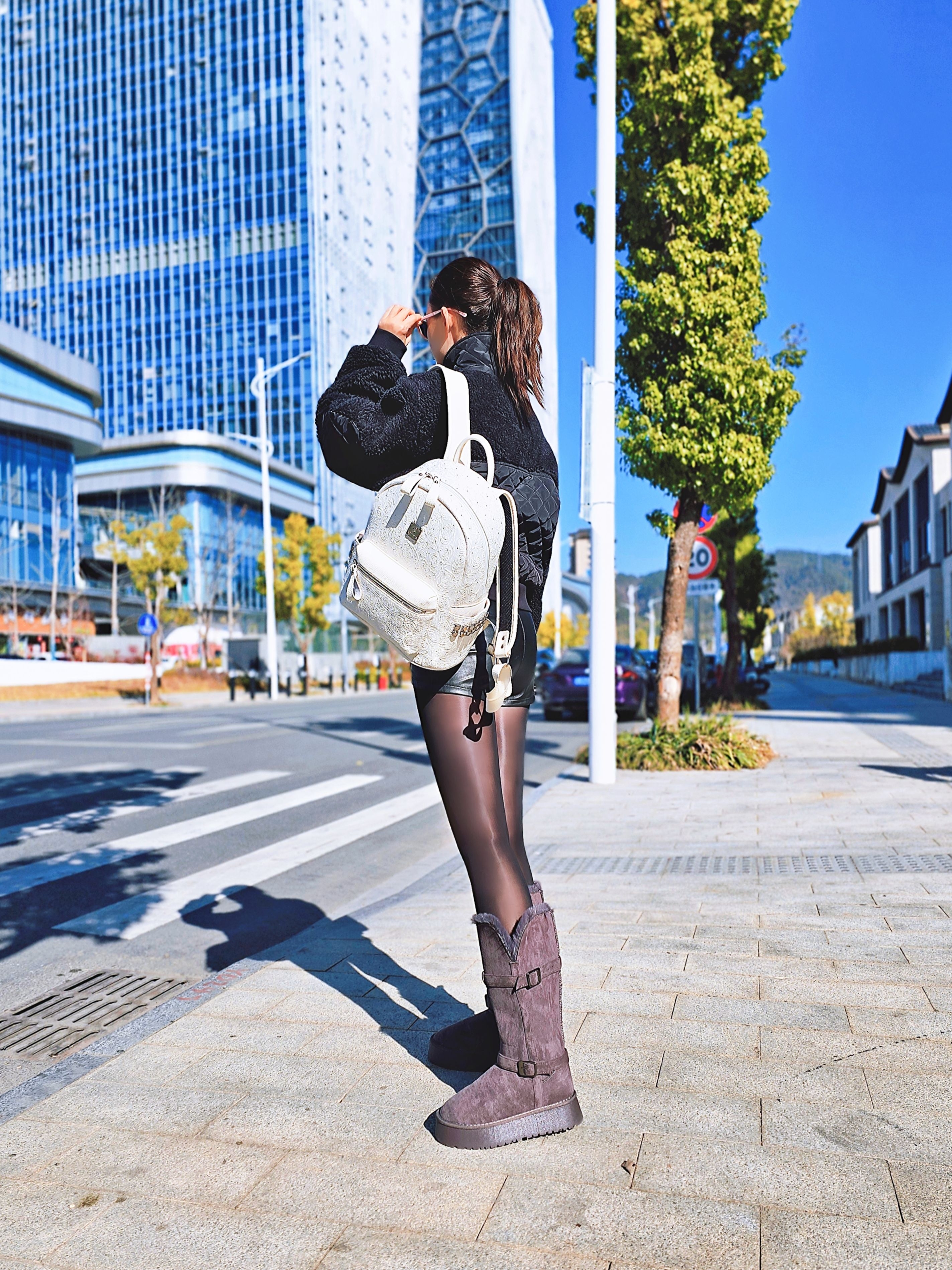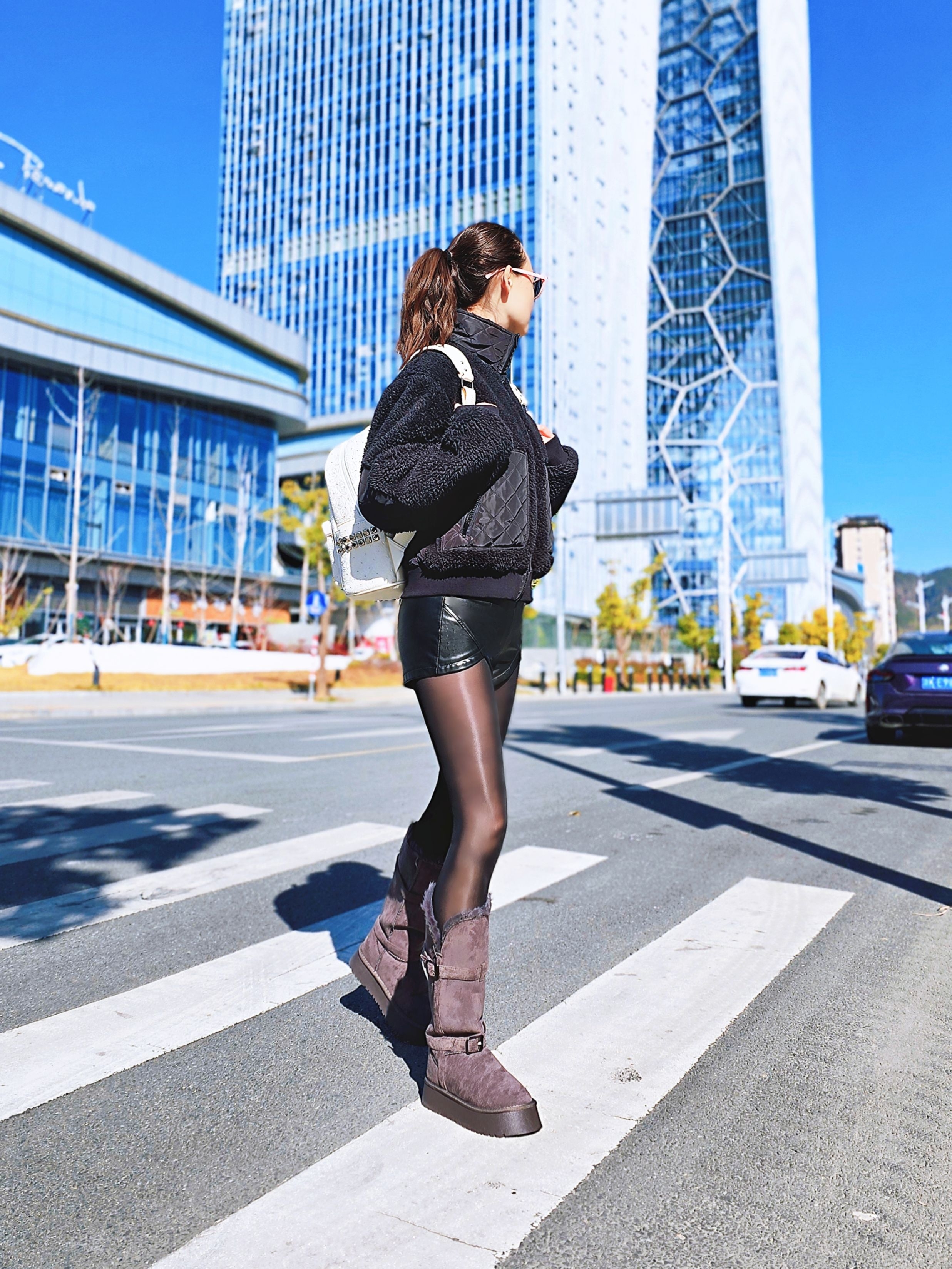 alo yoga SHERPA EDGE BOMBER纯色立领拉链休闲无帽绒感外套~ 搭配皮短裤+黑色马油丝袜+雪地靴! →_→好出片啊!