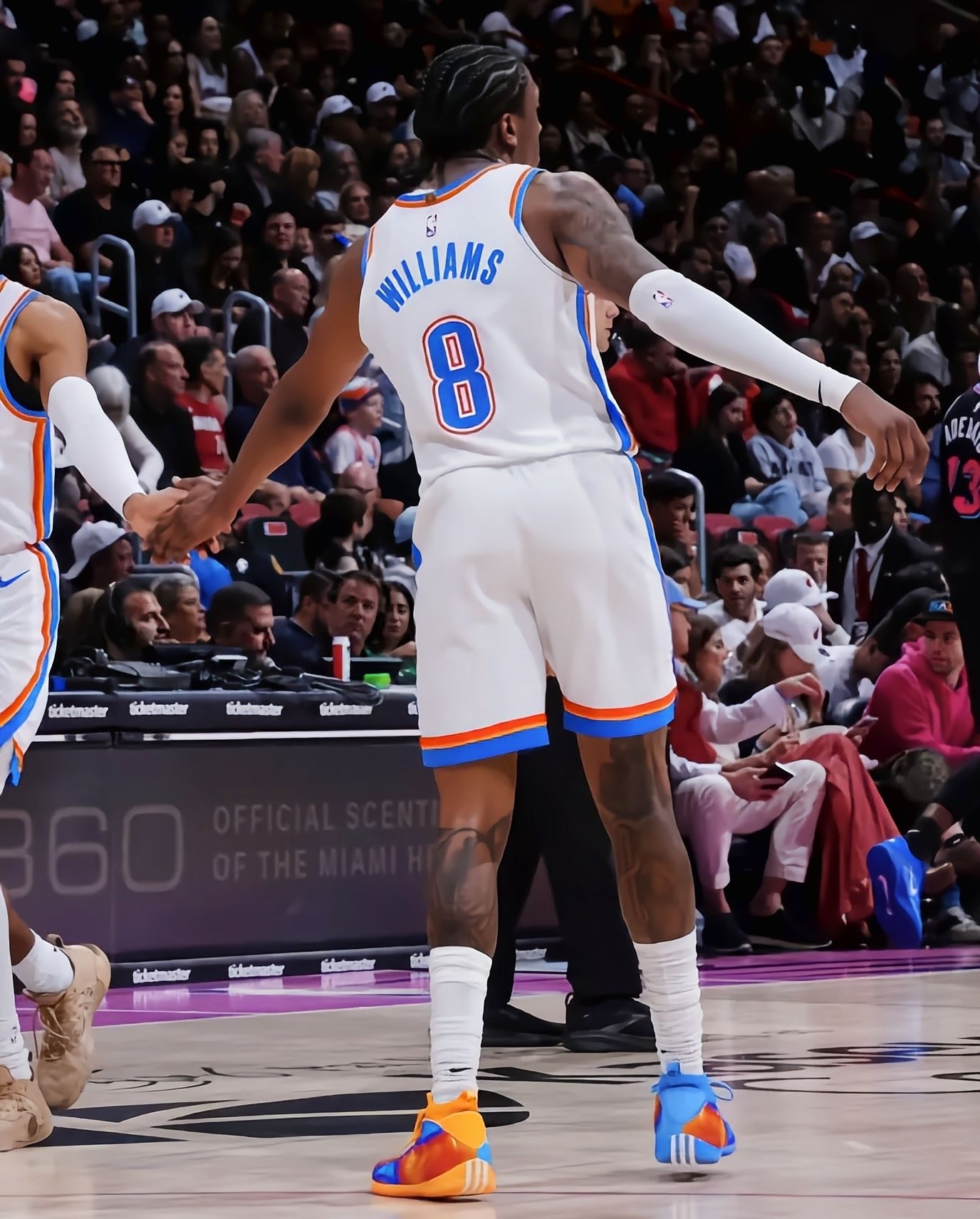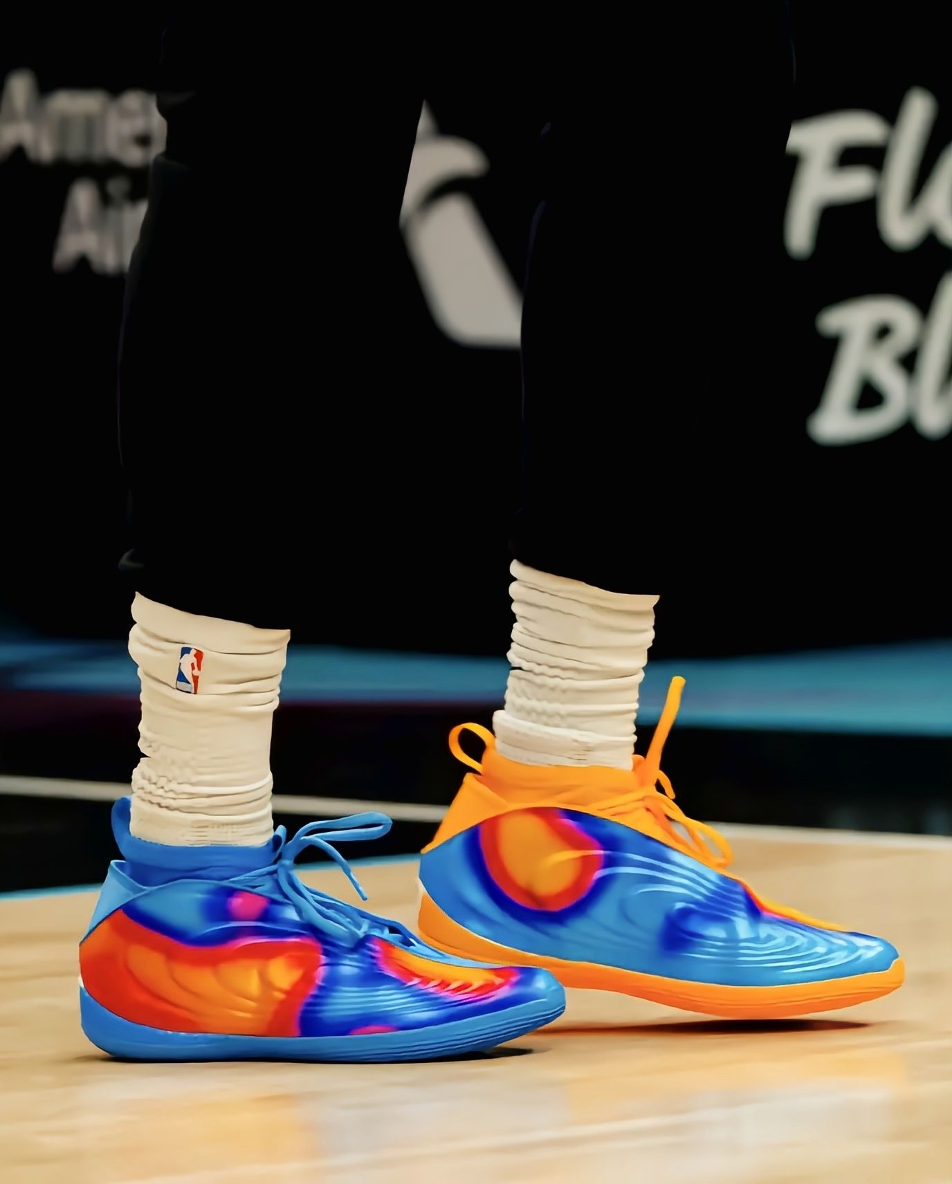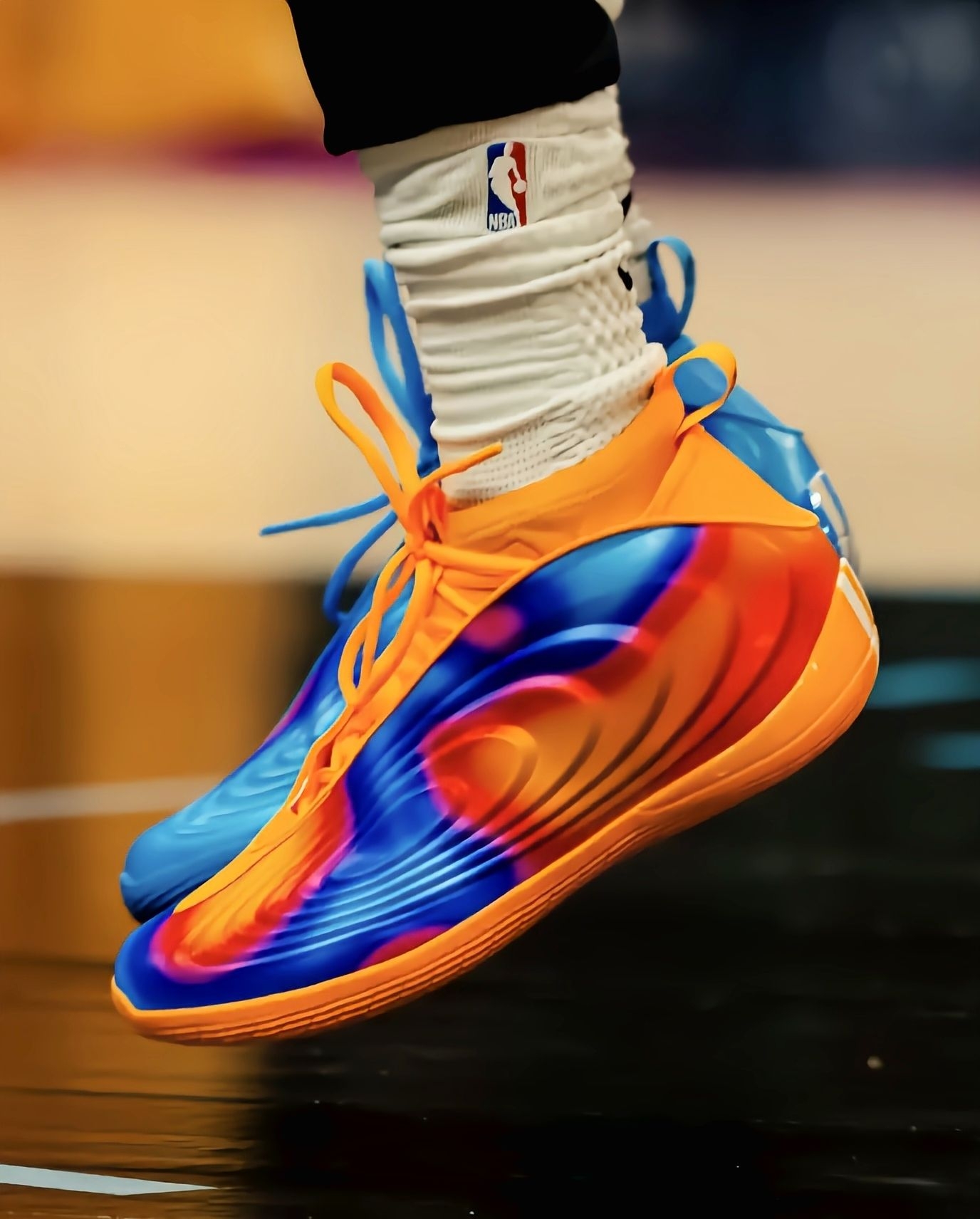 雷霆客场挑战热火的比赛里,杰伦·威廉姆斯上脚了这双超吸睛的个人专属配色adidas Harden Vol.10 “Weatherman” PE。 蓝橙鸳鸯的设计直接呼应了雷霆队的主题色,鞋面的渐变纹理像极了气象图里的冷暖锋交汇,视觉冲击力拉满。可惜的是,他只打了14分钟就因为右大腿酸痛提前退场,拿到8分3篮板3助攻后就没能再穿着它继续表现。 这双鞋是阿迪为他打造的专属PE版本,市售可能性很...