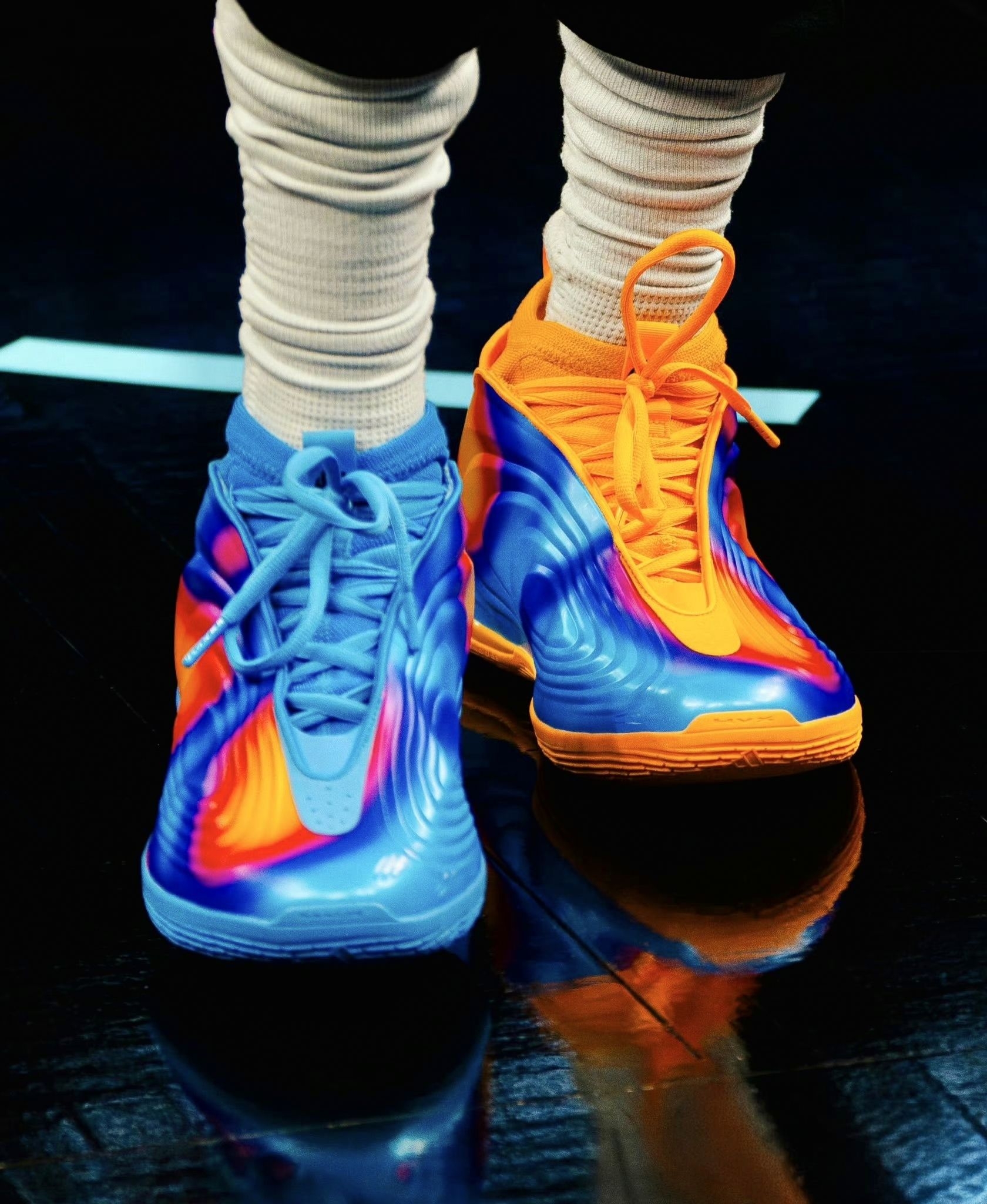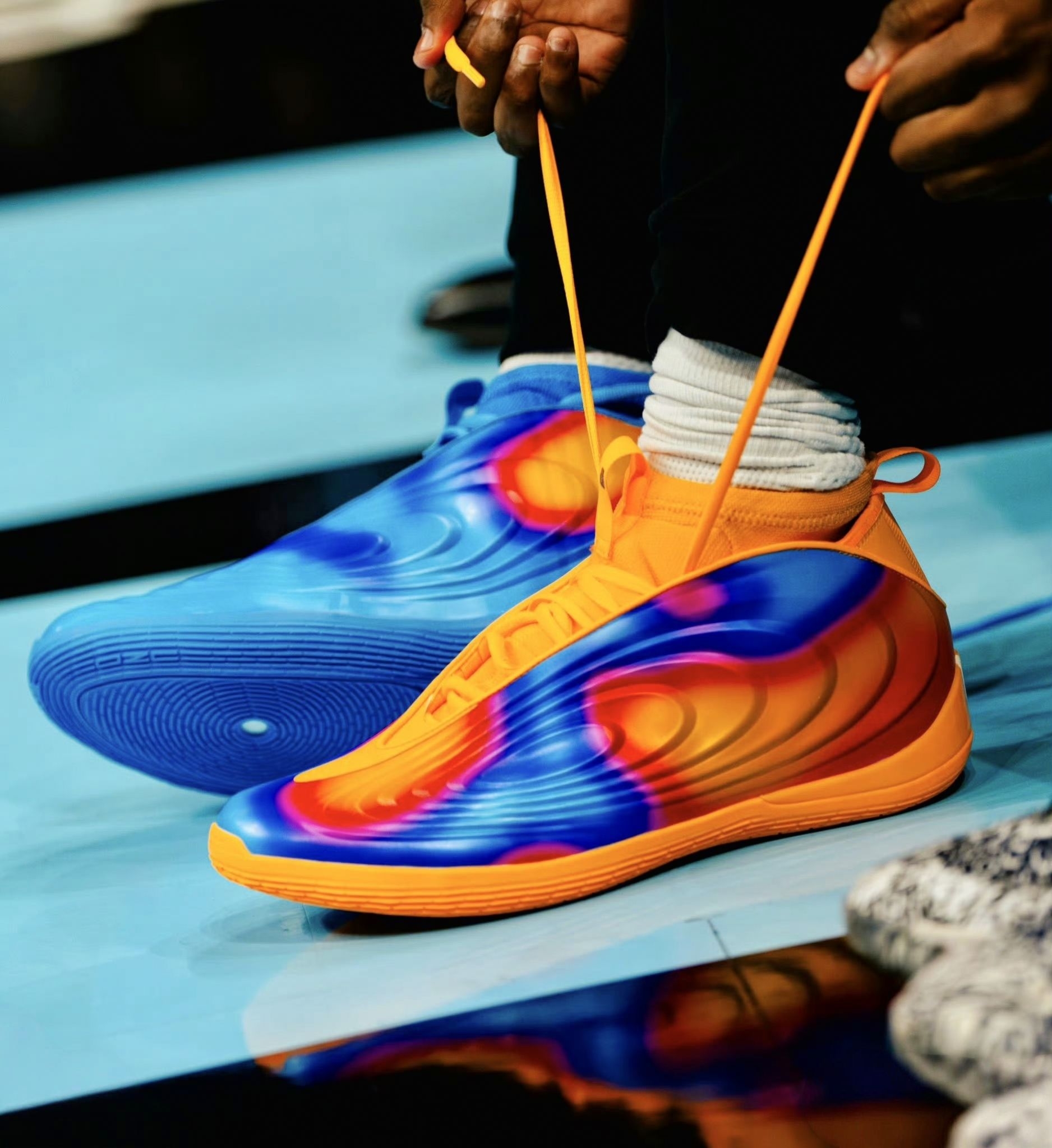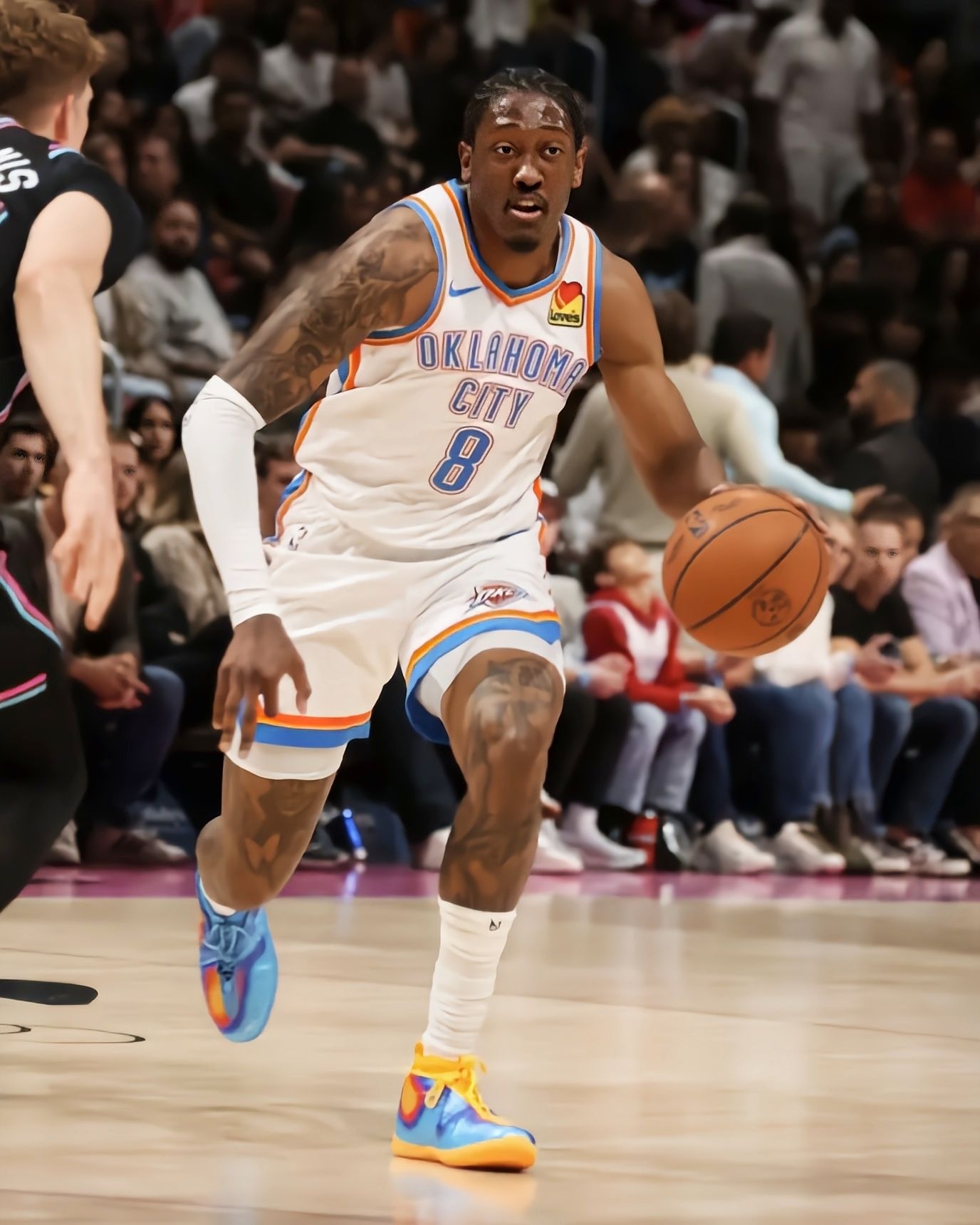 雷霆客场挑战热火的比赛里,杰伦·威廉姆斯上脚了这双超吸睛的个人专属配色adidas Harden Vol.10 “Weatherman” PE。 蓝橙鸳鸯的设计直接呼应了雷霆队的主题色,鞋面的渐变纹理像极了气象图里的冷暖锋交汇,视觉冲击力拉满。可惜的是,他只打了14分钟就因为右大腿酸痛提前退场,拿到8分3篮板3助攻后就没能再穿着它继续表现。 这双鞋是阿迪为他打造的专属PE版本,市售可能性很...