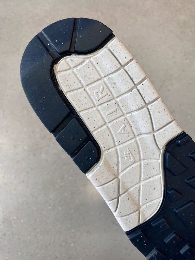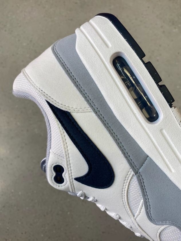 我印象里,Air Max 1身边没有太多人穿,大街上也不那么多,倒是在欧美很受欢迎 鞋后跟的刺绣Logo质感很不错,鞋面的配色也很简洁,除了麂皮是雾霾蓝的感觉以外,黑Logo白鞋面的组合很百搭