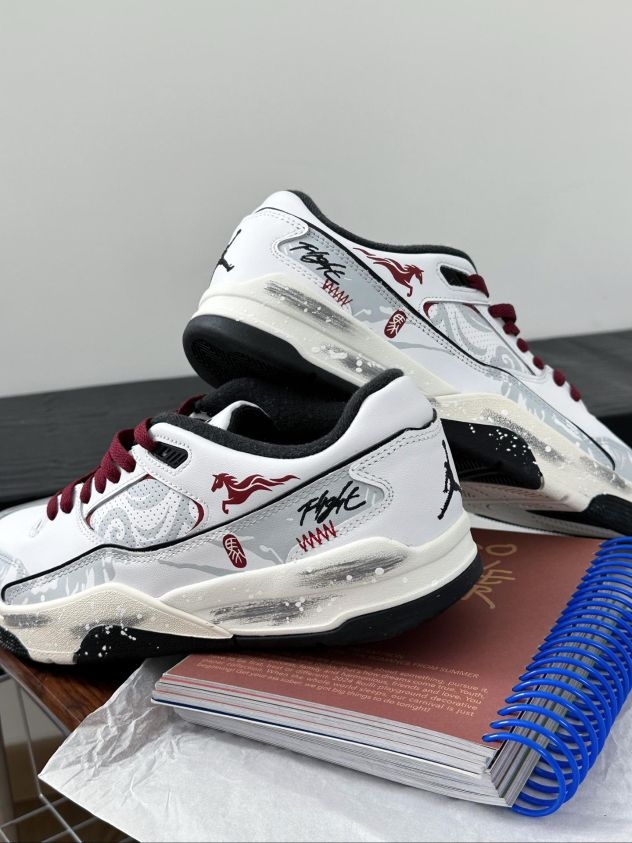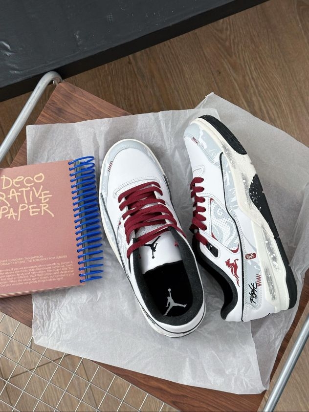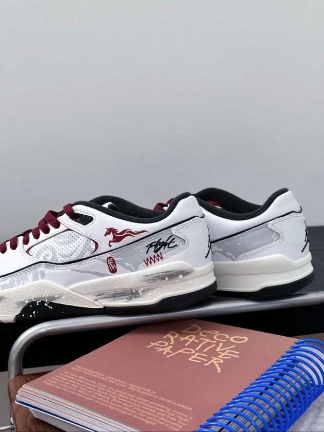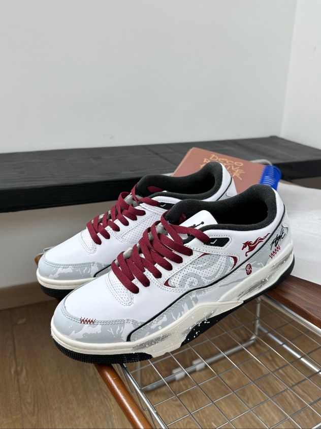 白鞋配酒红鞋带,灰调暗纹带点泼墨随性,小马标和签名细节刚好戳中潮感,日常穿也能悄悄出挑。