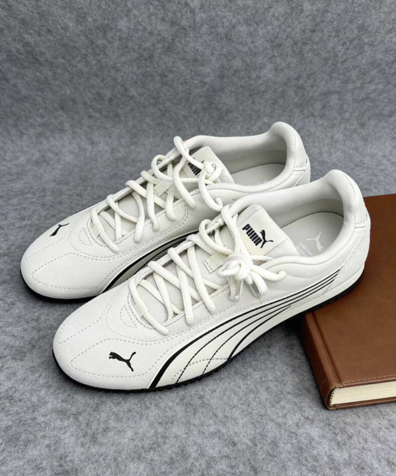 这双PUMA穿了快两周,鞋面带点绒感,摸着还行,就是鞋头太爱沾灰,穿一天就得擦。脚感中等偏硬,上班走万步虽然不硌脚,但鞋底偏薄,踩到硬井盖能明显感觉到震,久站还是会累。鞋型偏窄,我正常脚刚好,宽脚记得买大半码。侧面线条确实好看,但黑边容易蹭出印子,不太好打理。不过它配牛仔裤、运动裤都很顺,日常通勤完全够用,就是一个比较酷且百搭的款!👟⚠️