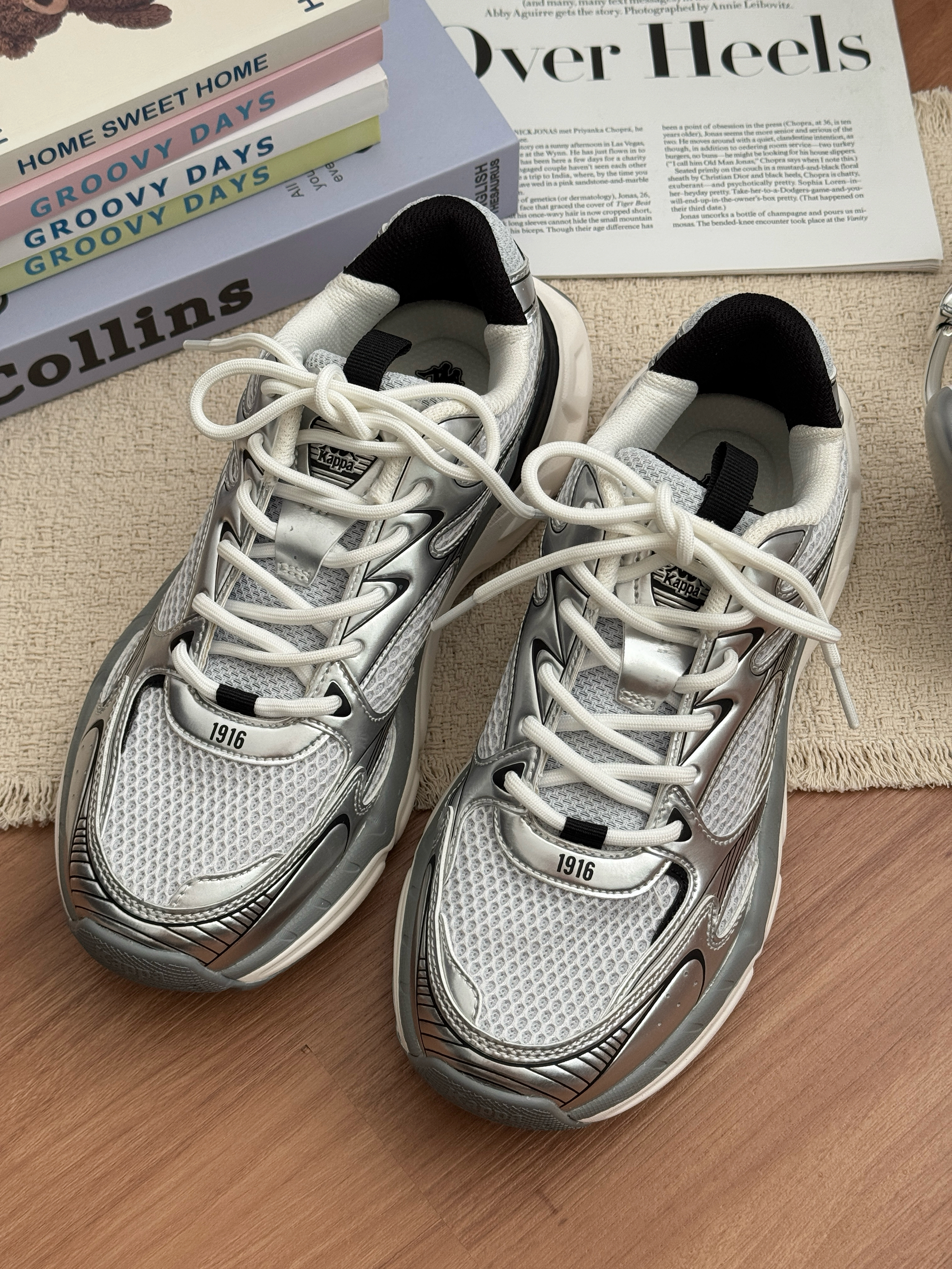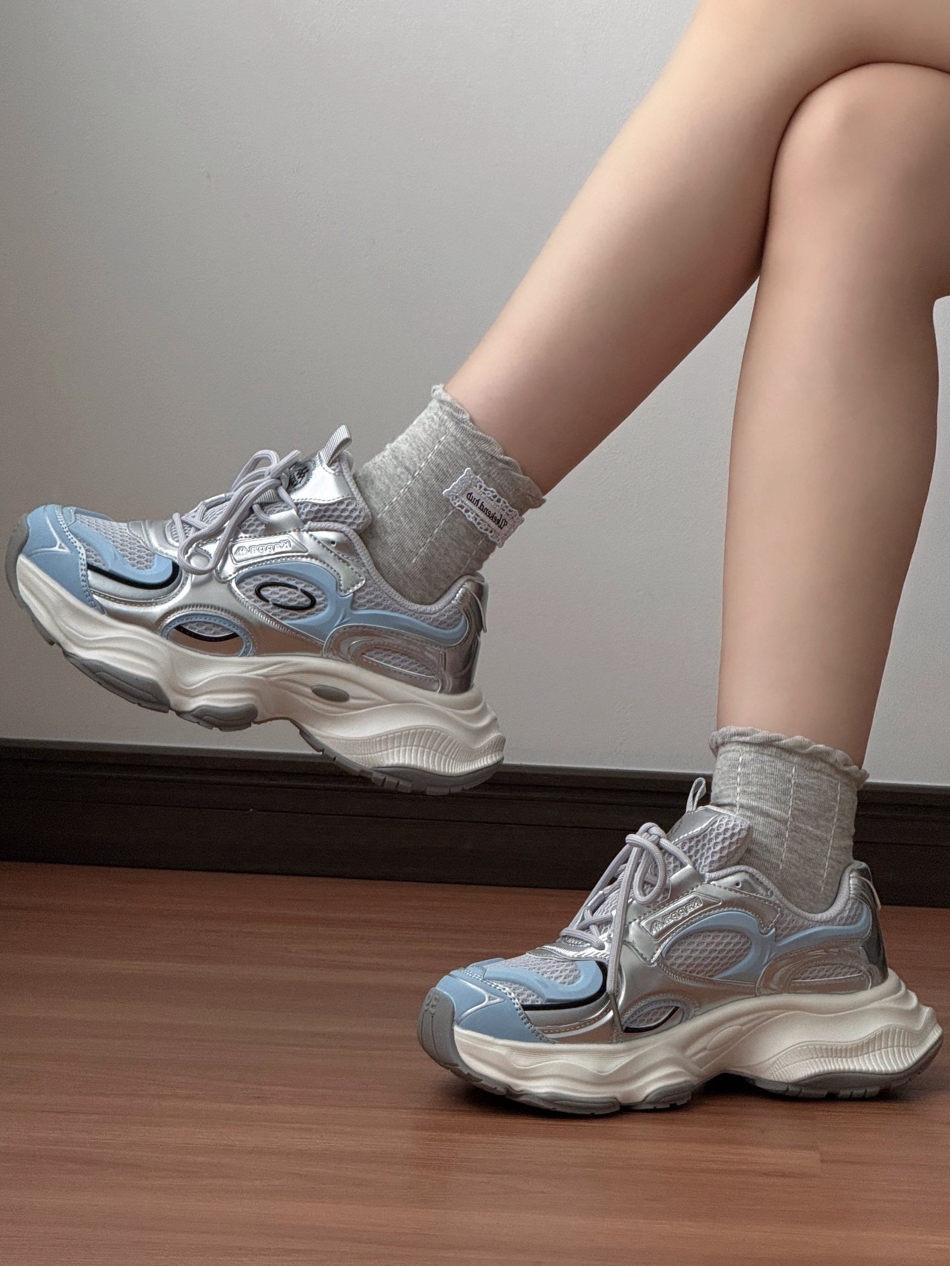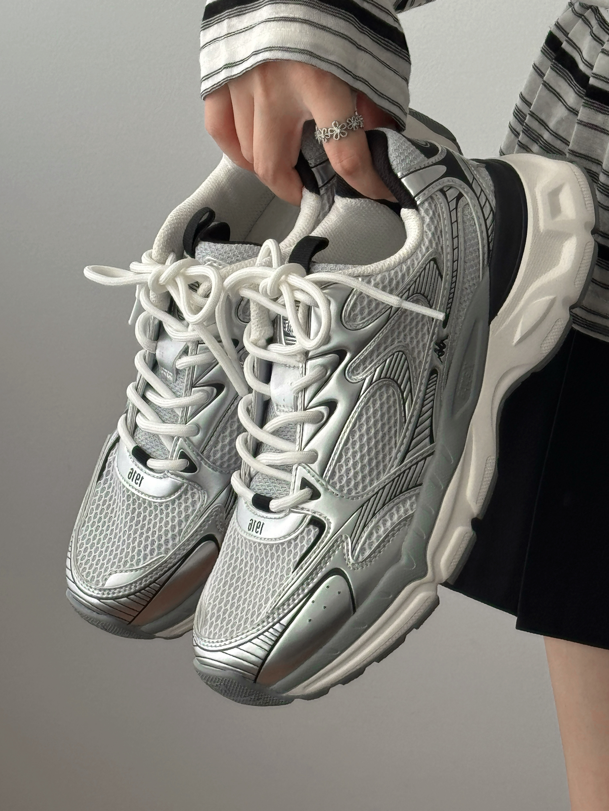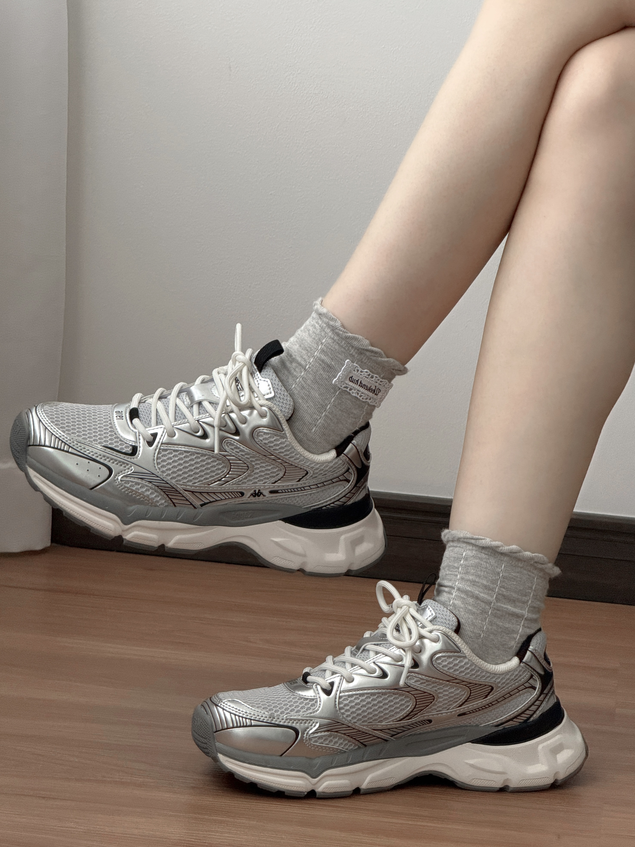 今日的ootd~ 这双银色老爹鞋简直长在我的审美点上 金属色光泽,把未来感拿捏得刚刚好✨ 网面透气又轻便,暴走一整天都不闷脚~ 搭配同色系袜子直接解锁甜酷风 近期出街都喜欢穿它,舒适又百搭~ 还悄悄增高,小个子狂喜💗