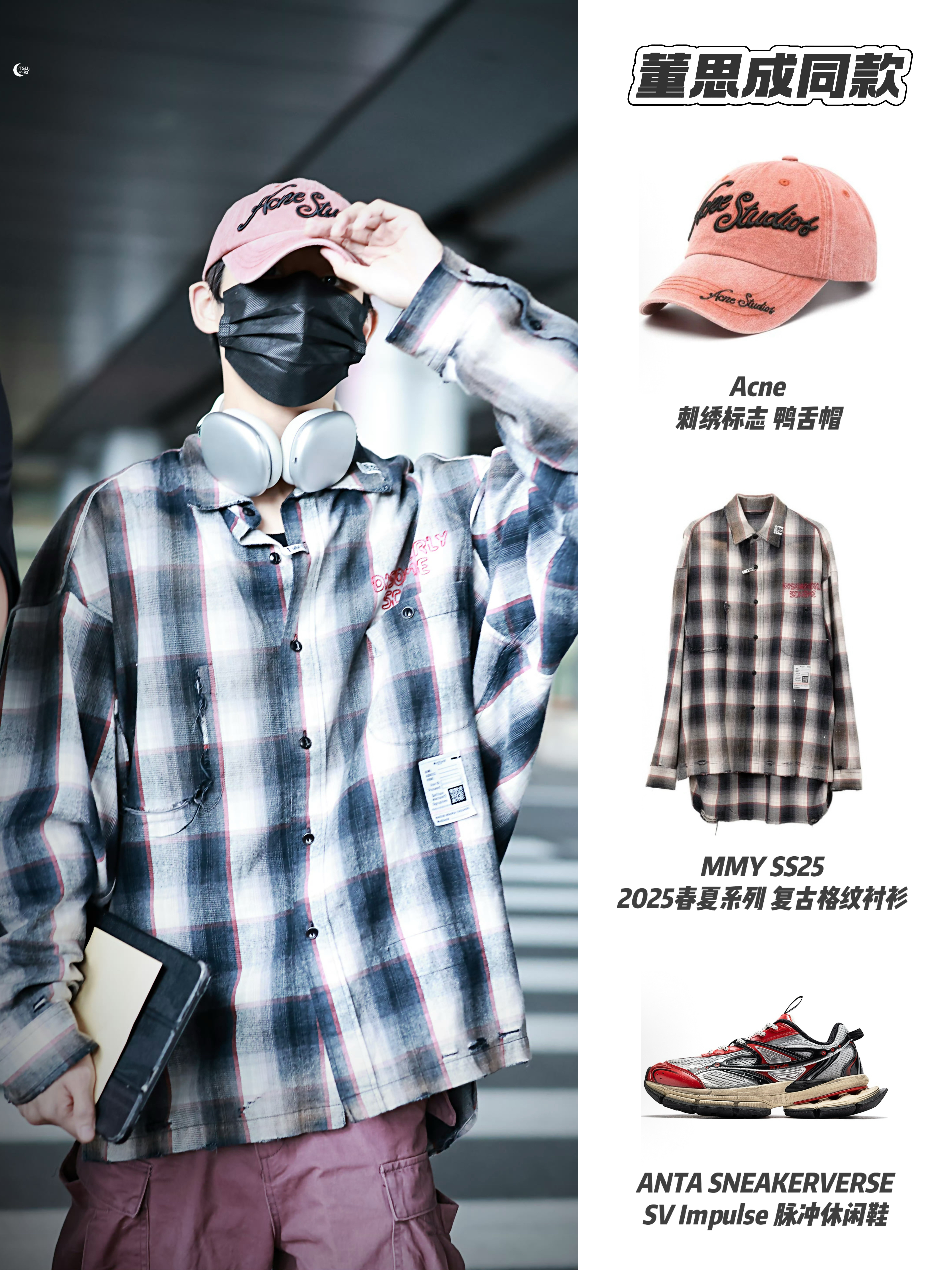 董思成机场这套穿搭将美式复古与街头松弛感完美融合~ MMY复古格纹衬衫宽松随性,Acne粉色棒球帽与裤子色彩呼应,细节感拉满。安踏脉冲鞋红黑撞色个性潮酷,整体造型舒适又不失层次,是机场出街的高分示范💯