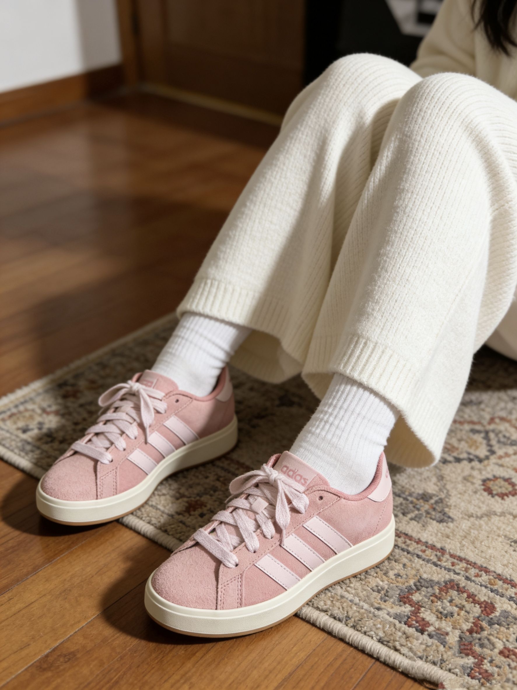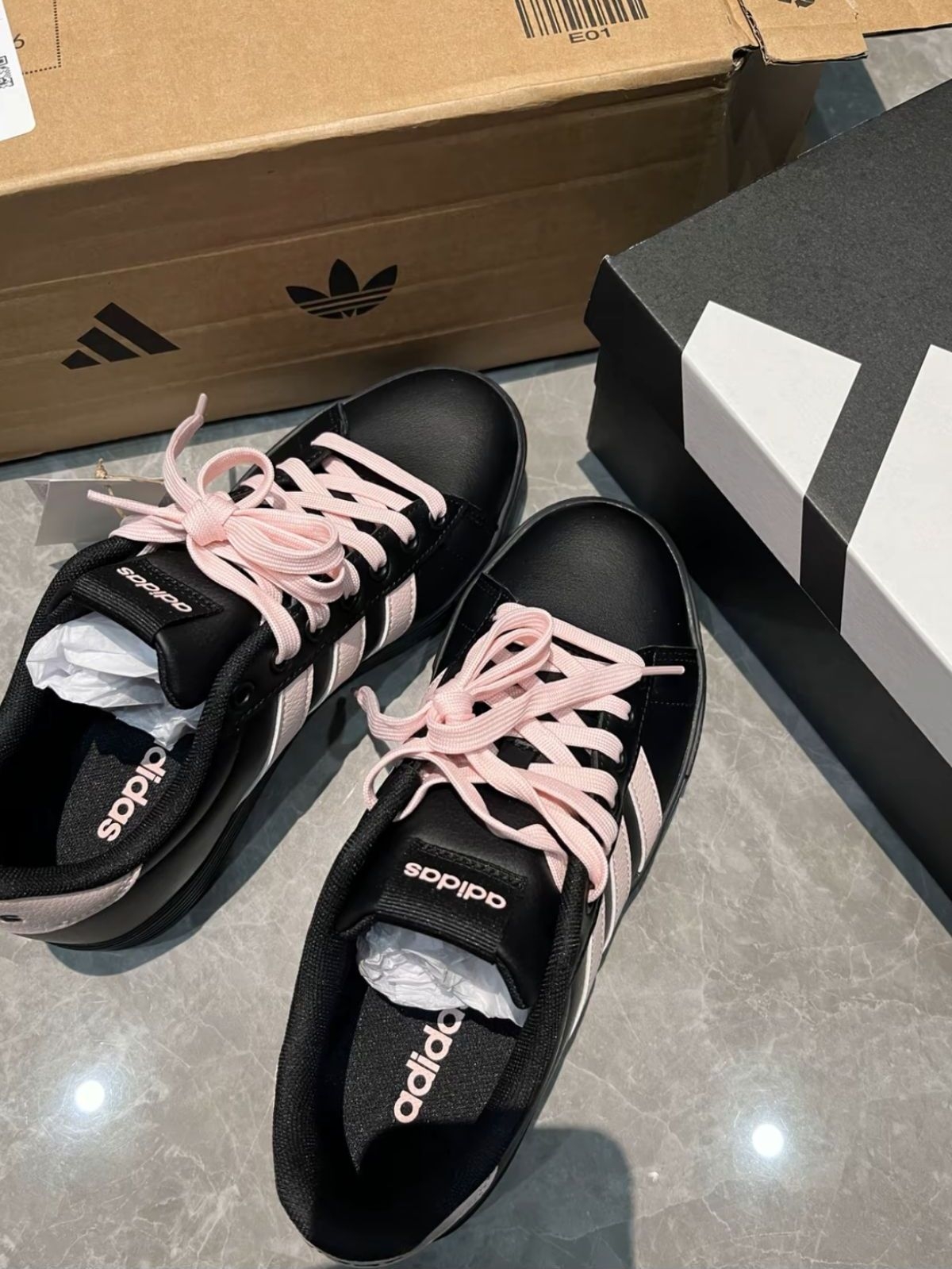 入手这双阿迪贝壳头有段时间了,说说真实上脚感受😌 我脚偏宽,选的时候特意拿大了半码,上脚前掌处不挤脚,鞋头的贝壳头设计不会压脚趾,日常走路脚感还算舒展。黑蓝配色很低调,搭配牛仔裤或者运动裤都不突兀,鞋身皮质摸着手感还可以,打理起来也省心。