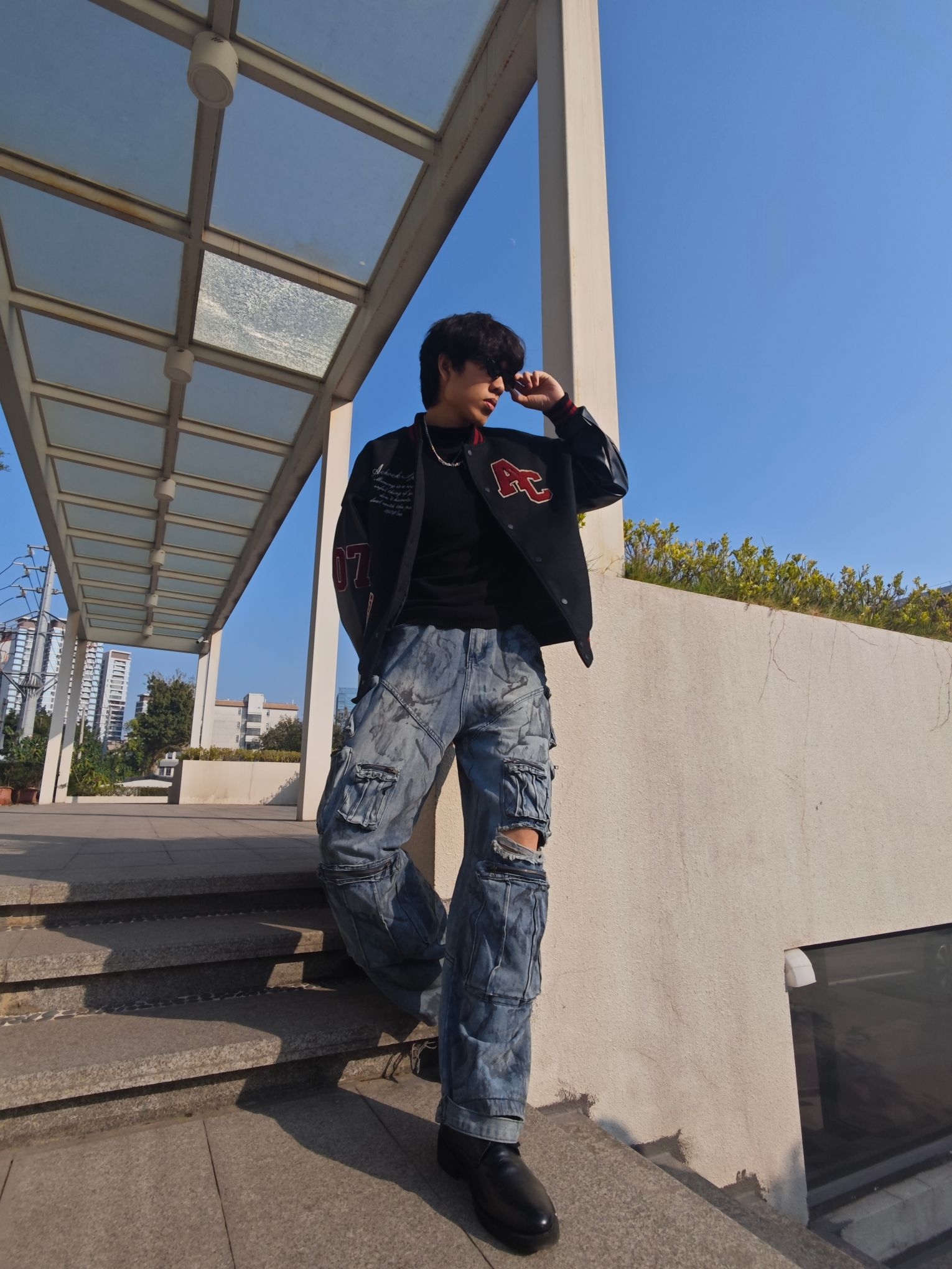 分享今日穿搭之 上衣黑色皮革棒球夹克 质感硬朗,红色字母与刺绣细节精致 内搭的黑色简约T恤😍😍😍 突出了夹克的设计重点 下装水洗蓝工装牛仔裤 做旧纹理与多口袋设计😎😎😎 强化了街头属性 超阔腿版型带来强烈的松弛感 与夹克的硬朗材质形成反差 黑色皮靴硬朗的质感 与夹克的材质完美呼应🥰🥰🥰 也平衡了裤装的宽松感 是美式复古的街头酷感与随性松弛完美融合 这套酷酷的穿搭你get了吗😍😍😍