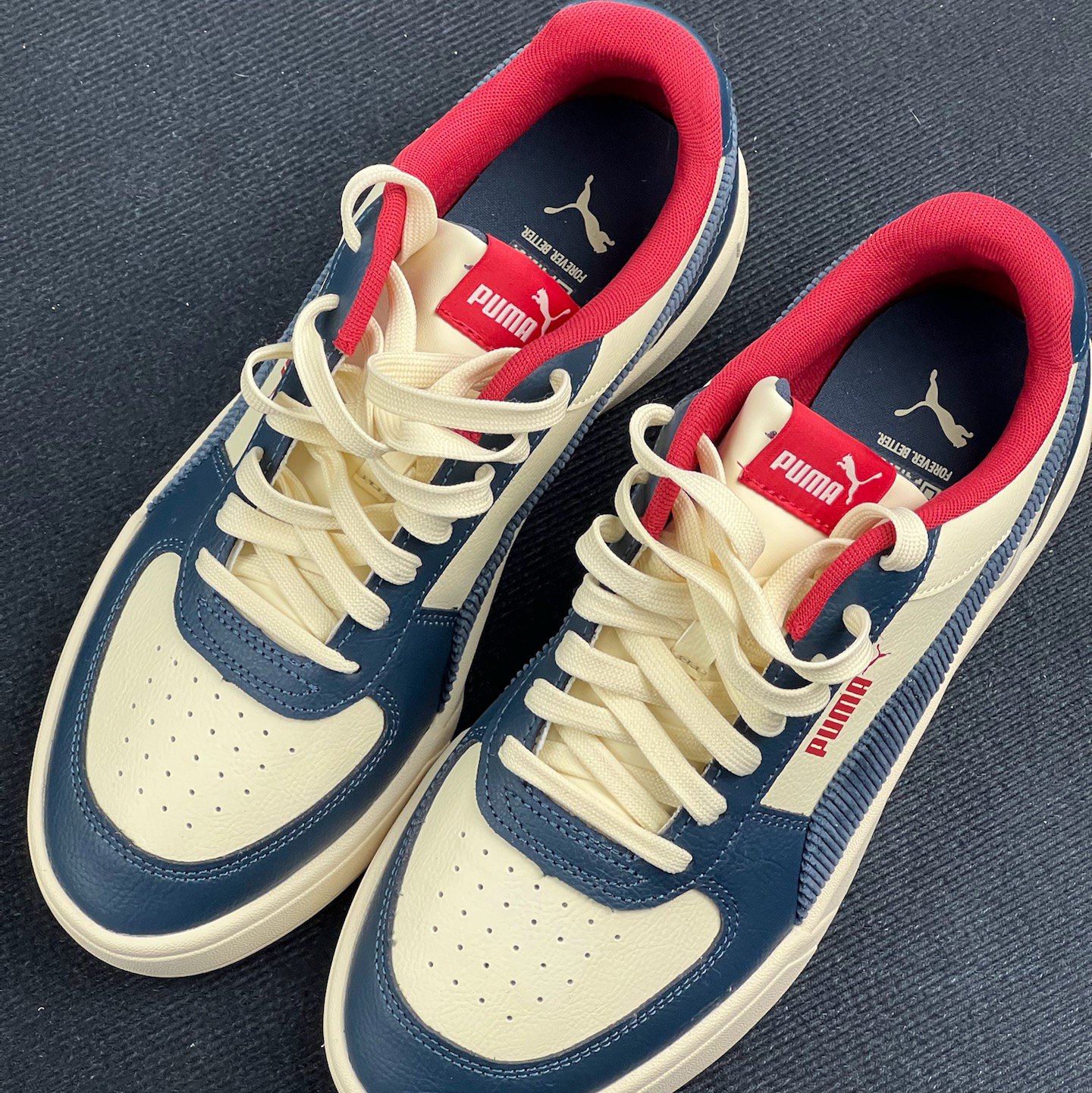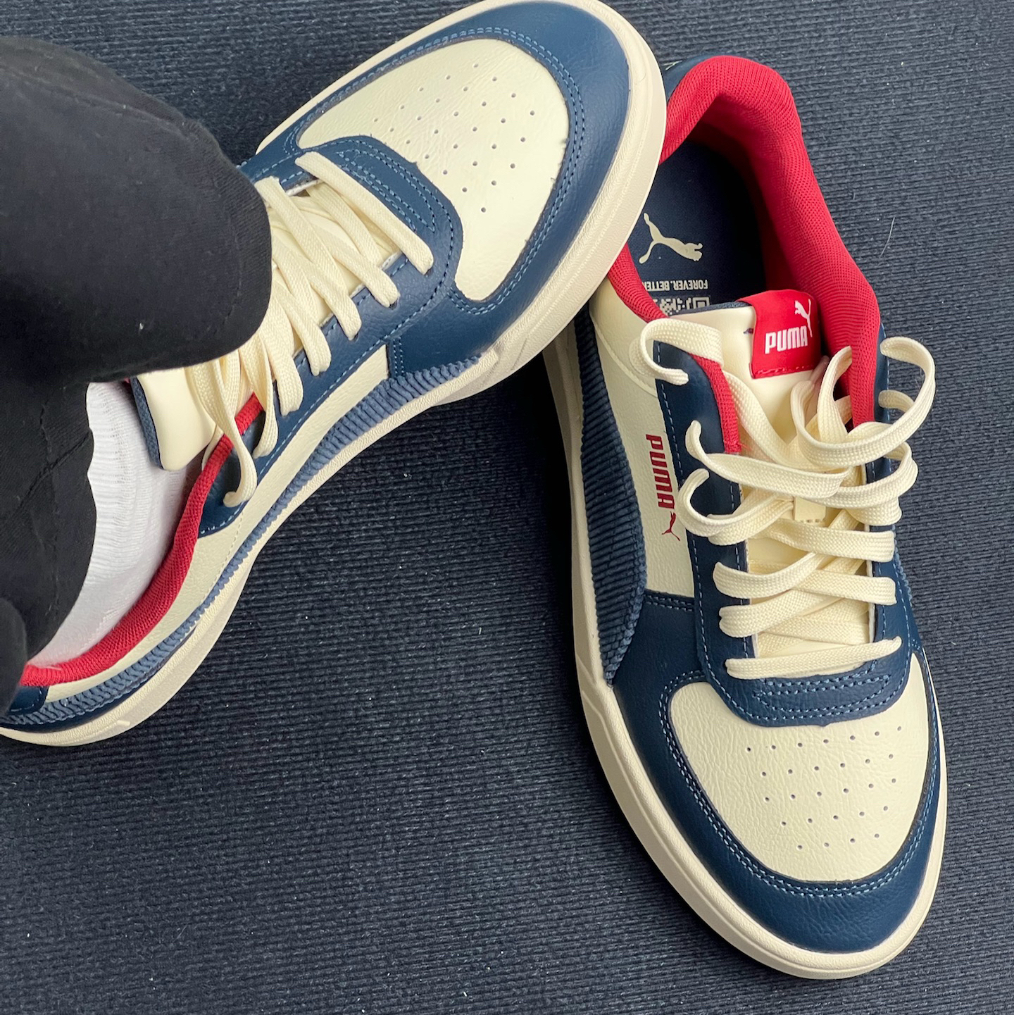 和朋友人手一双 真实体验分享 分享一下最近和朋友一起入的这双PUMA鞋👟。 先说穿着感受,日常走路逛街,脚感还算舒适🥰🥰,但长时间站立或者快走,就会觉得鞋底的支撑性差了点,脚底板会有点累🥲🥲。 外观上,蓝、米、红的配色挺有复古感,不过这种配色搭配衣服有点挑,得花点心思搭配,不然容易显得整体风格很杂乱😶🌫️😶🌫️。 鞋的材质看起来还算结实,但穿了一段时间,鞋头的褶皱有点明显,影响了整体的美观...