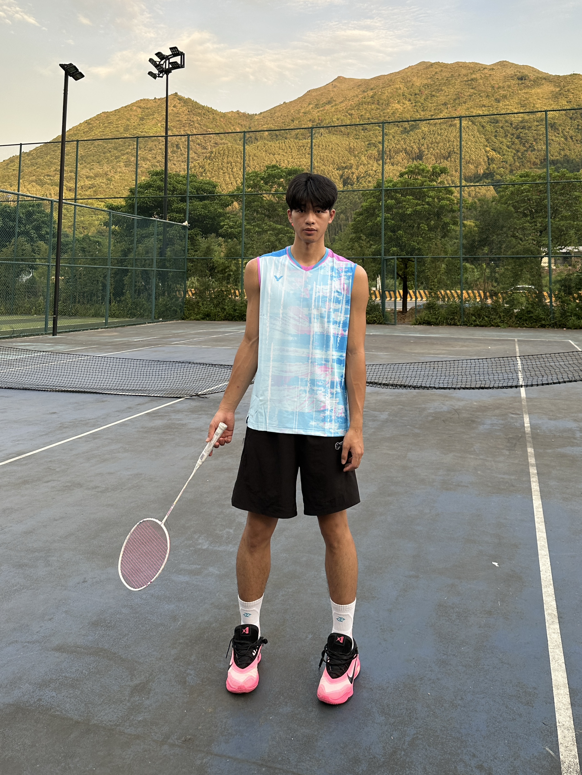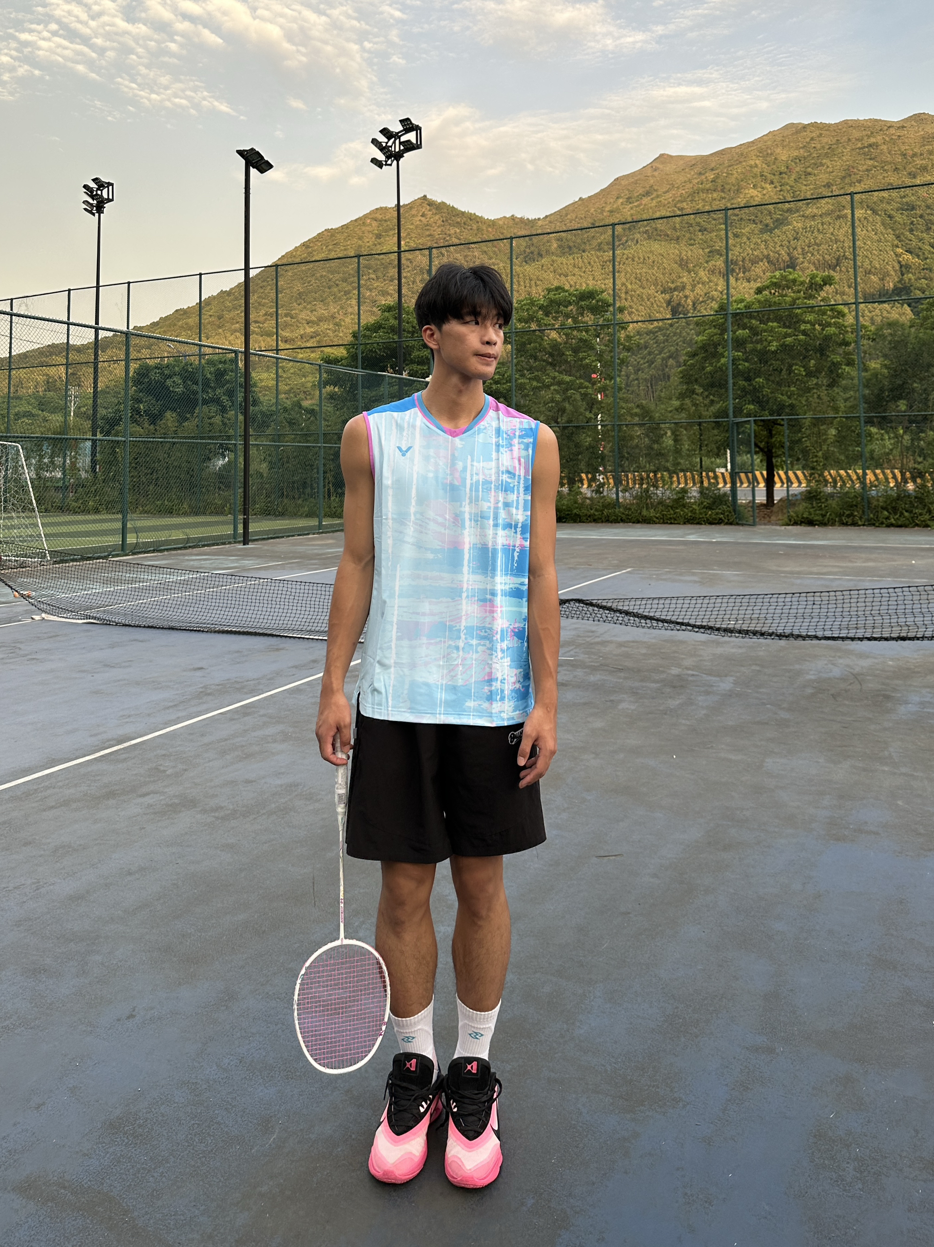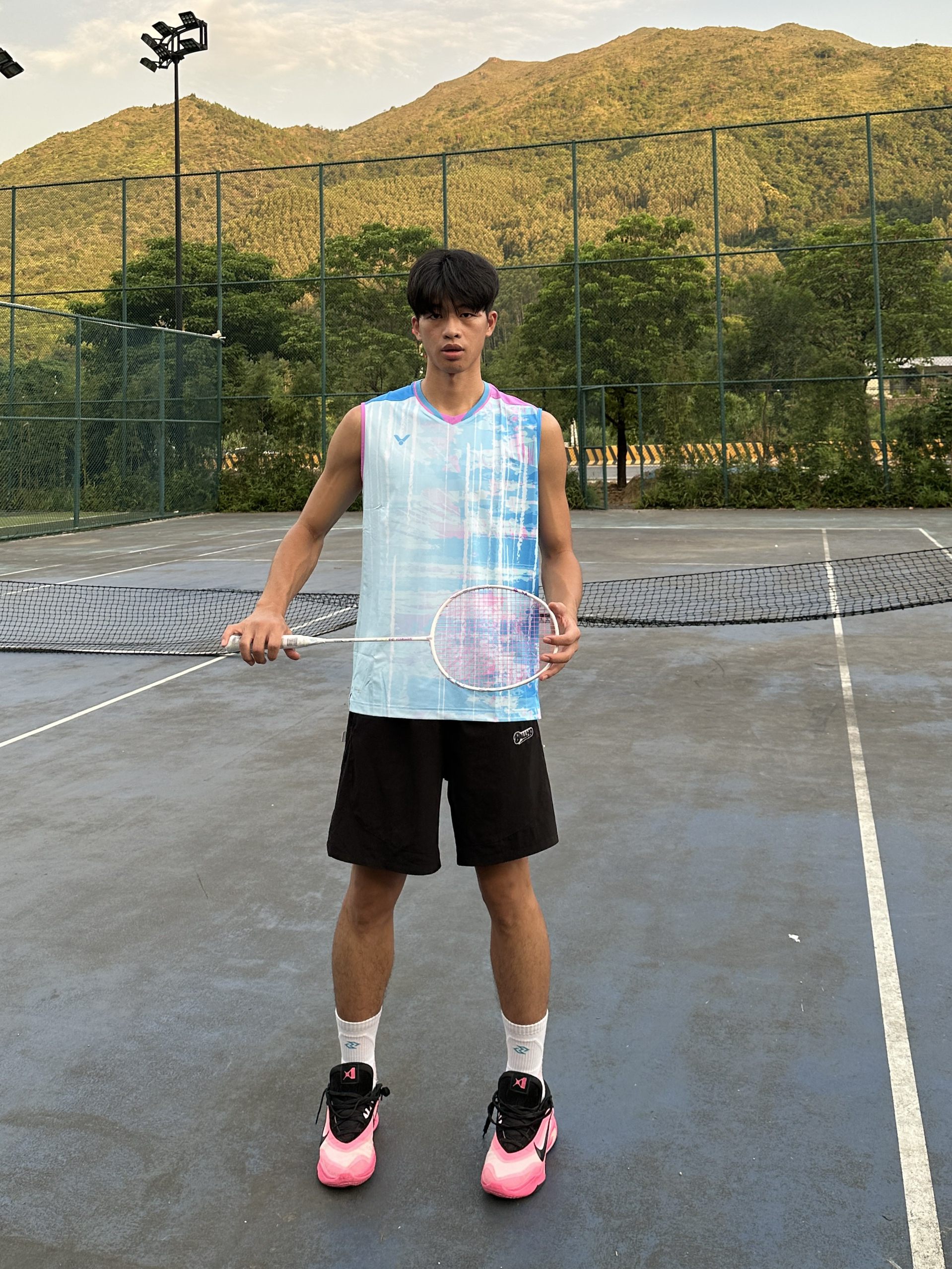 冬天也要好好运动 在广东冬天和夏天一样热 今天分享一套适合运动的穿搭 李梓家同款的羽毛球服上衣 淡蓝色的衣服上身后搭配黑色短裤 给人一种美式的休闲运动感 鞋子搭配一双来自nike的阿贾粉色球鞋👟 这样一身穿搭 尺码选择xxl码
