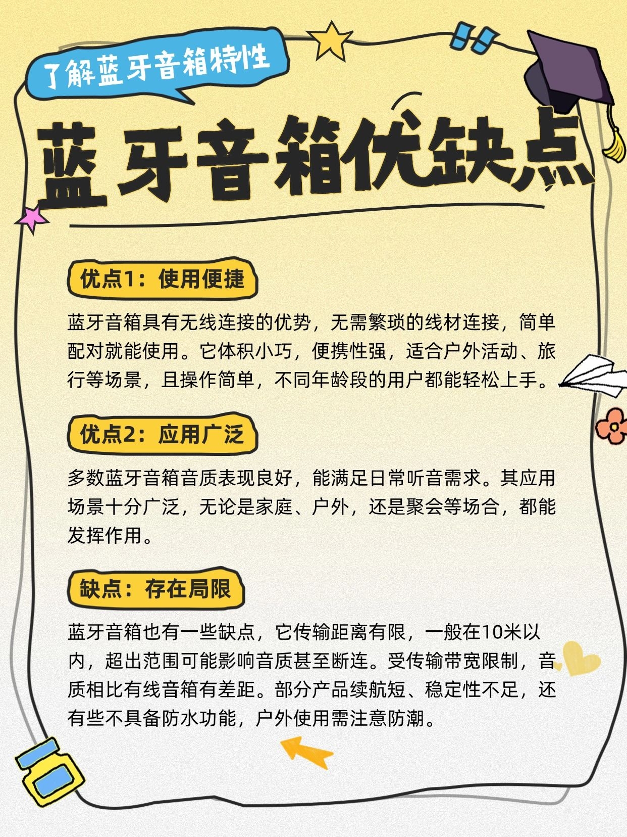 给大家简单分享一下蓝牙音箱的优势 💓1.无线便捷 可通过蓝牙与手机、平板、笔记本等设备配对,无需音频线缆,灵活性和便捷性更高。 💓2.轻巧实用 设计轻巧,便于携带,部分小型款内置电池,户外、旅行使用也无妨。且具备防水防尘、语音助手集成等功能,实用性大增。 💓3.易用兼容 设置和使用简单,简单配对就能连接播放设备,适合各年龄段人群。还能与多种蓝牙设备配对,无需考虑接口和适配器,家庭多设备使用很合适。...