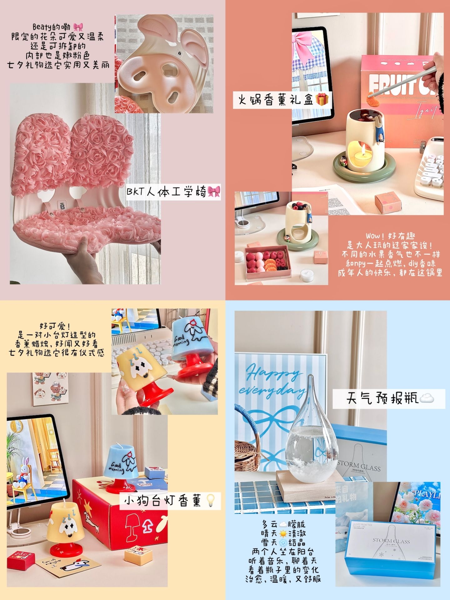 七夕的礼物,肯定要认真对待 分享一些我觉得小预算 也能很有心意又实用的礼物吧 1️⃣bkt限定花朵椅(💰200+) 七夕配上限定款的花朵可爱又温柔 我喜欢它的可拆卸的花朵座套 夏天透气不闷,还方便清洗 甜甜的爱情配甜甜的座椅刚刚好 2️⃣甜蜡匠水果派对(💰100+) 用蜡烛做的水果好逼真 不同的水果香气也不一样 可以按照自己的喜好随便搭配 然后点燃火焰 等待开席 成年人的快乐,都在这锅里 3...