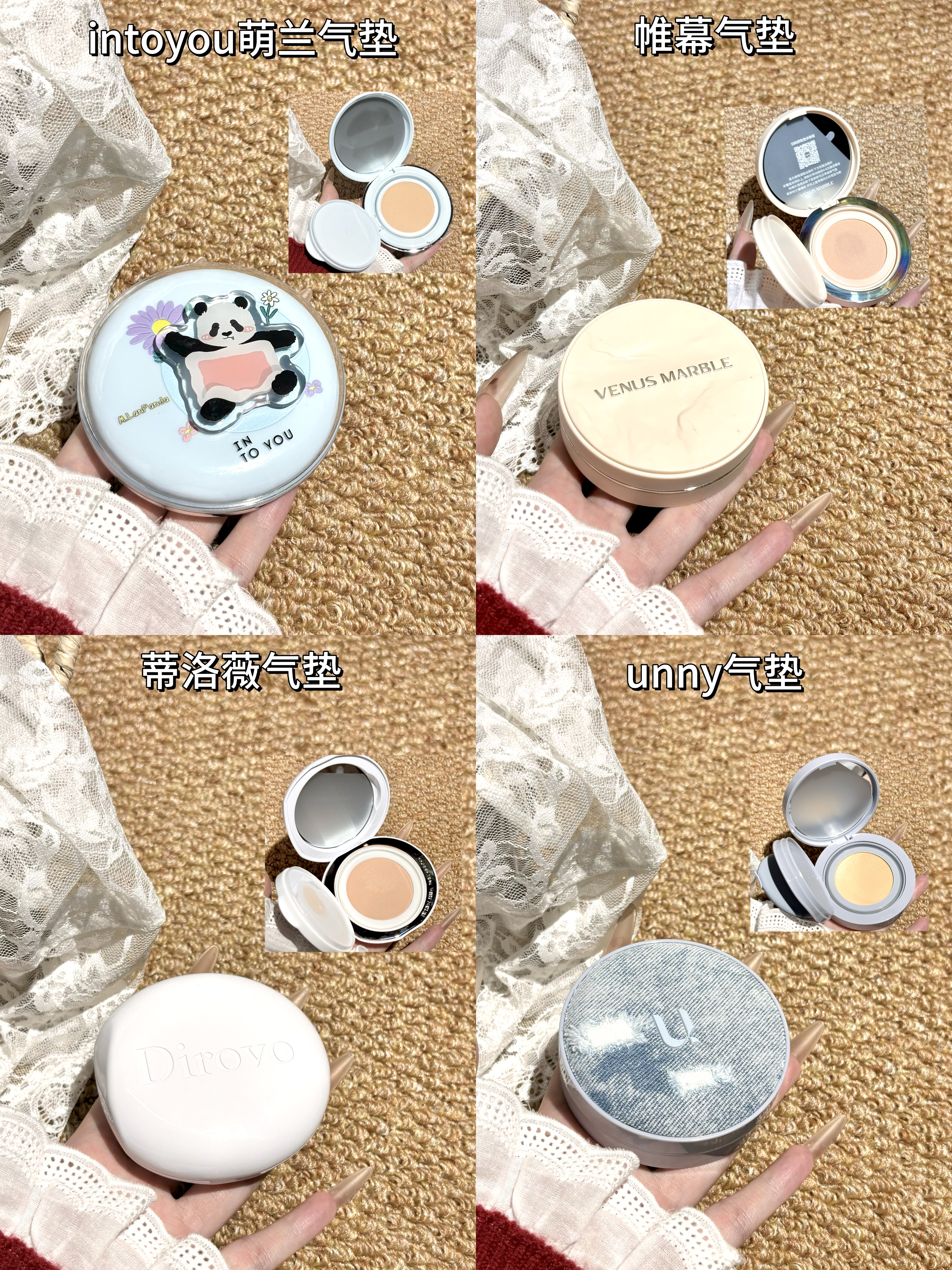 底妆选不对,护肤全白费!👌 今天把我近期爱用的4块气垫拉出来遛遛 无广!纯个人真实使用感受! ▫️ INTOYOU萌兰气垫 萌兰粉必冲的联名款!包装太萌了🐼 奶油肌妆效,上脸是自然的提亮感 干皮秋冬用很润,持妆6小时T区微微出油会更贴肤 缺点是遮瑕力中等,瑕疵皮要叠加遮瑕 ▫️ VENUS MARBLE帷幕气垫 混油皮本命气垫!雾面妆效巨高级 上脸一秒磨皮,遮瑕力在线,红血丝痘印都能遮个七七八...