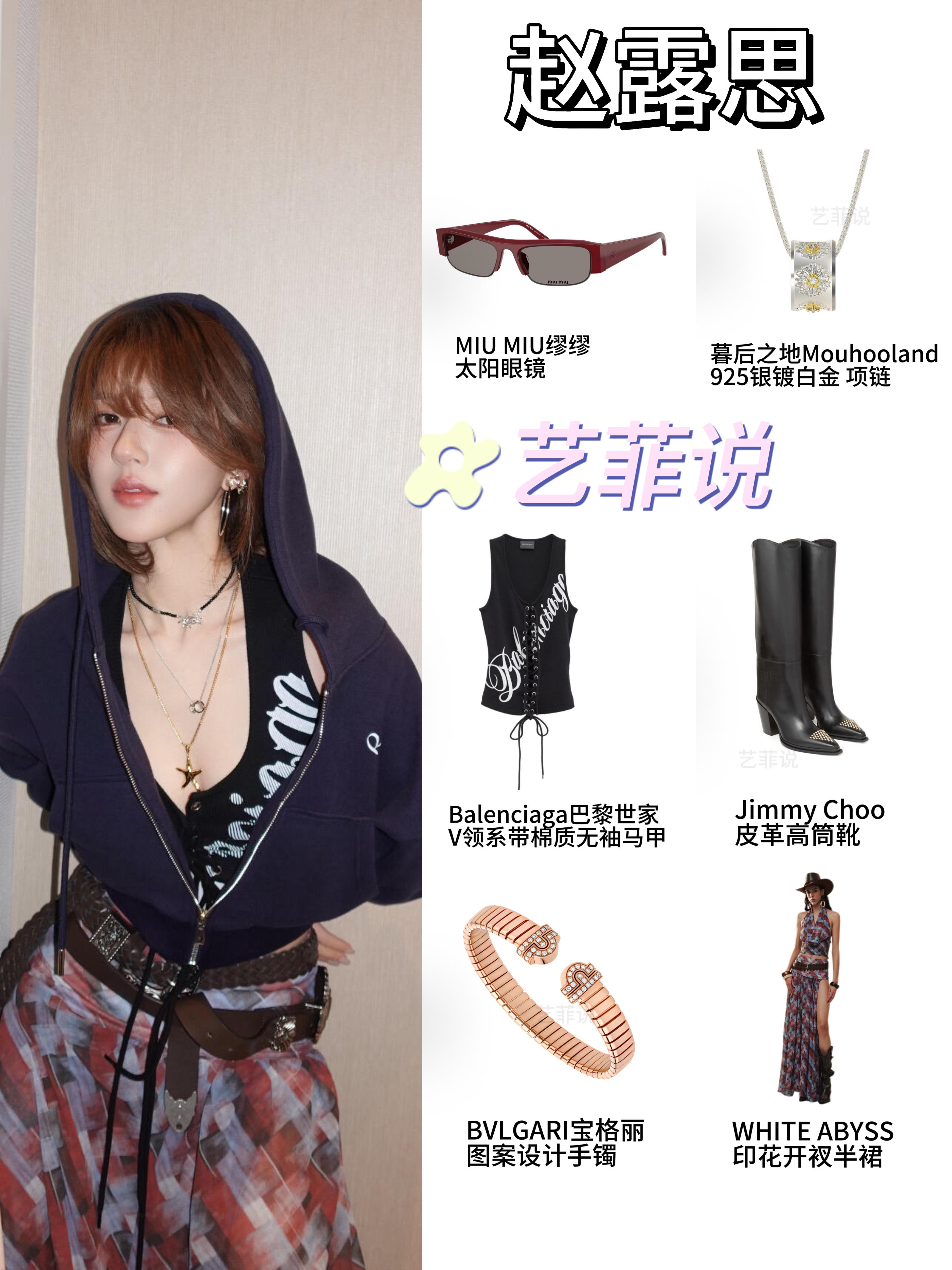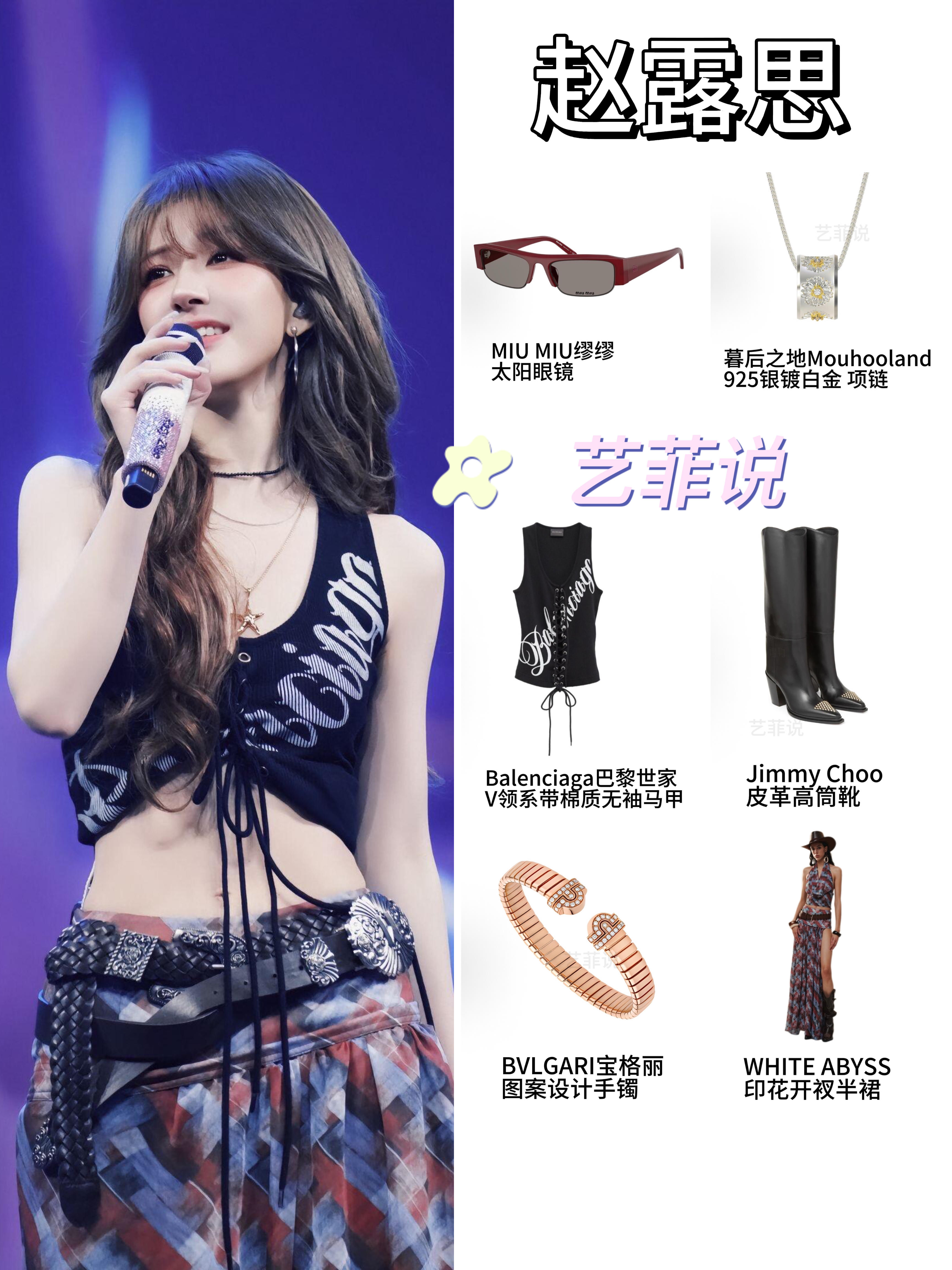 赵露思此次演唱会造型甜酷又吸睛! 简约修身黑色短上衣搭配高腰长裙,勾勒优越身材比例,短款设计露腰显腰线,长裙修饰腿型还带复古感。 上衣和眼镜 Balenciaga 长靴 Jimmy Choo 项链 Mouhooland/暮后之地 手镯 BVLGARI 这套甜酷风穿搭太绝了!你们觉得哪件单品最出彩呢?