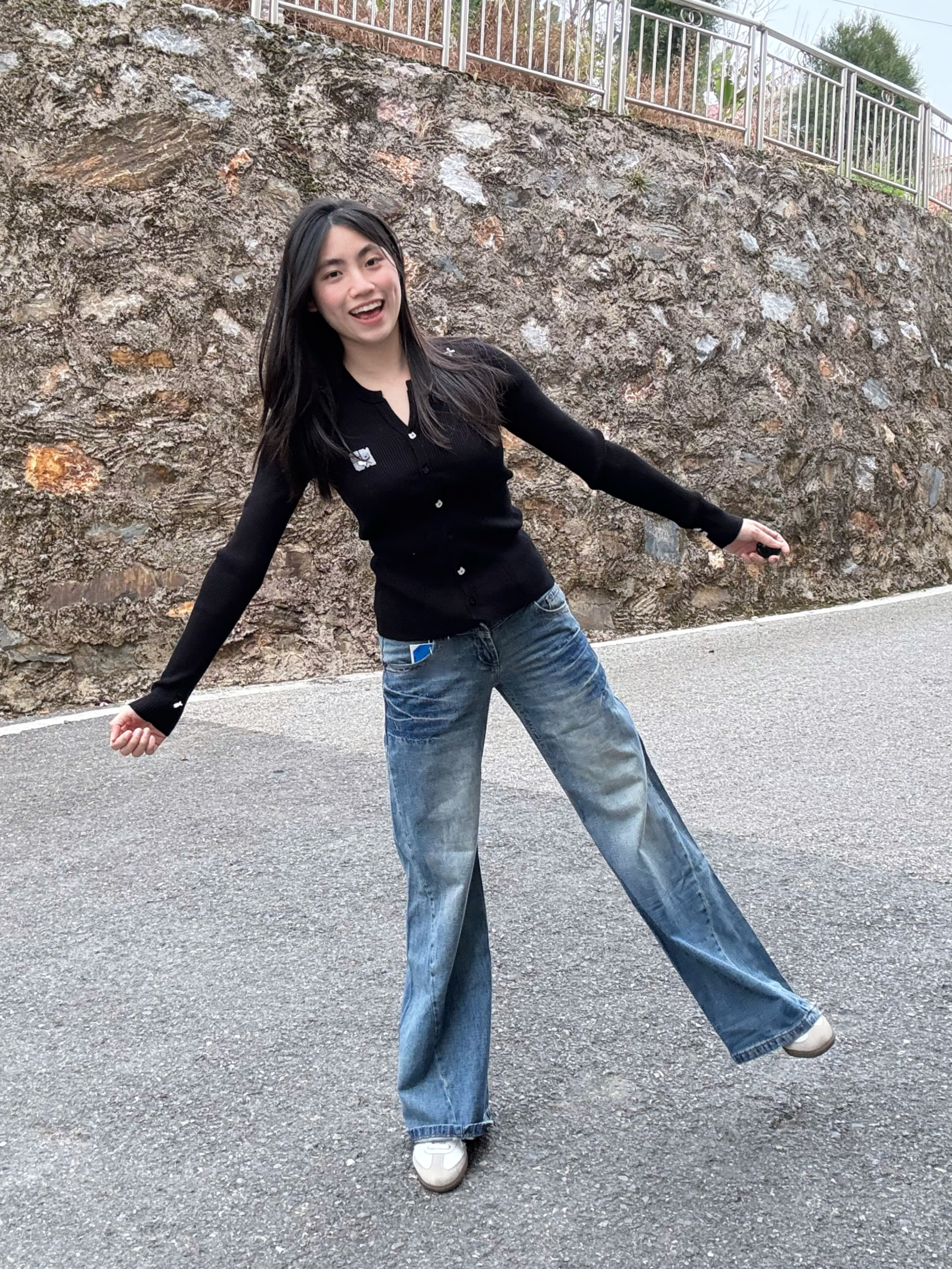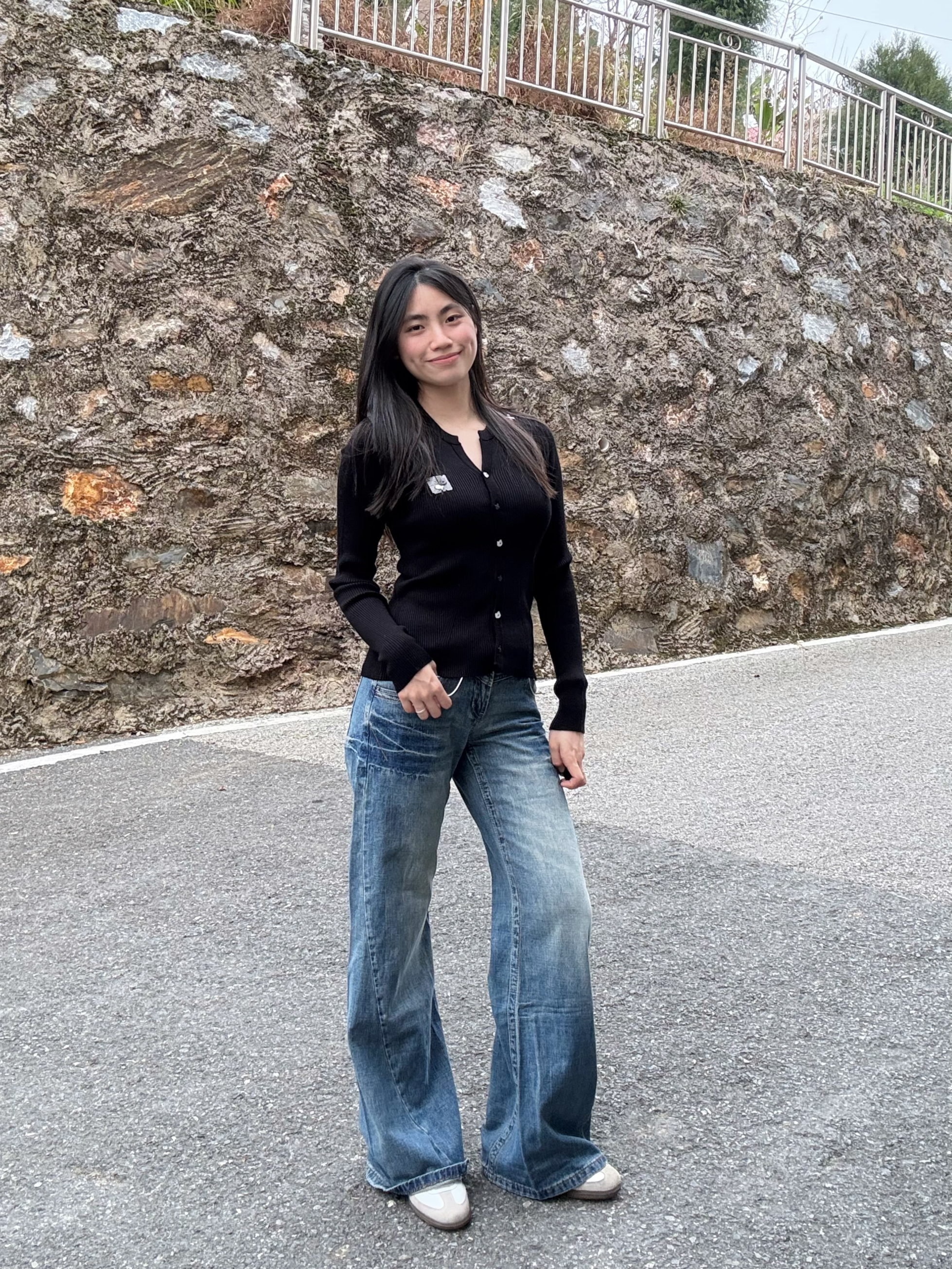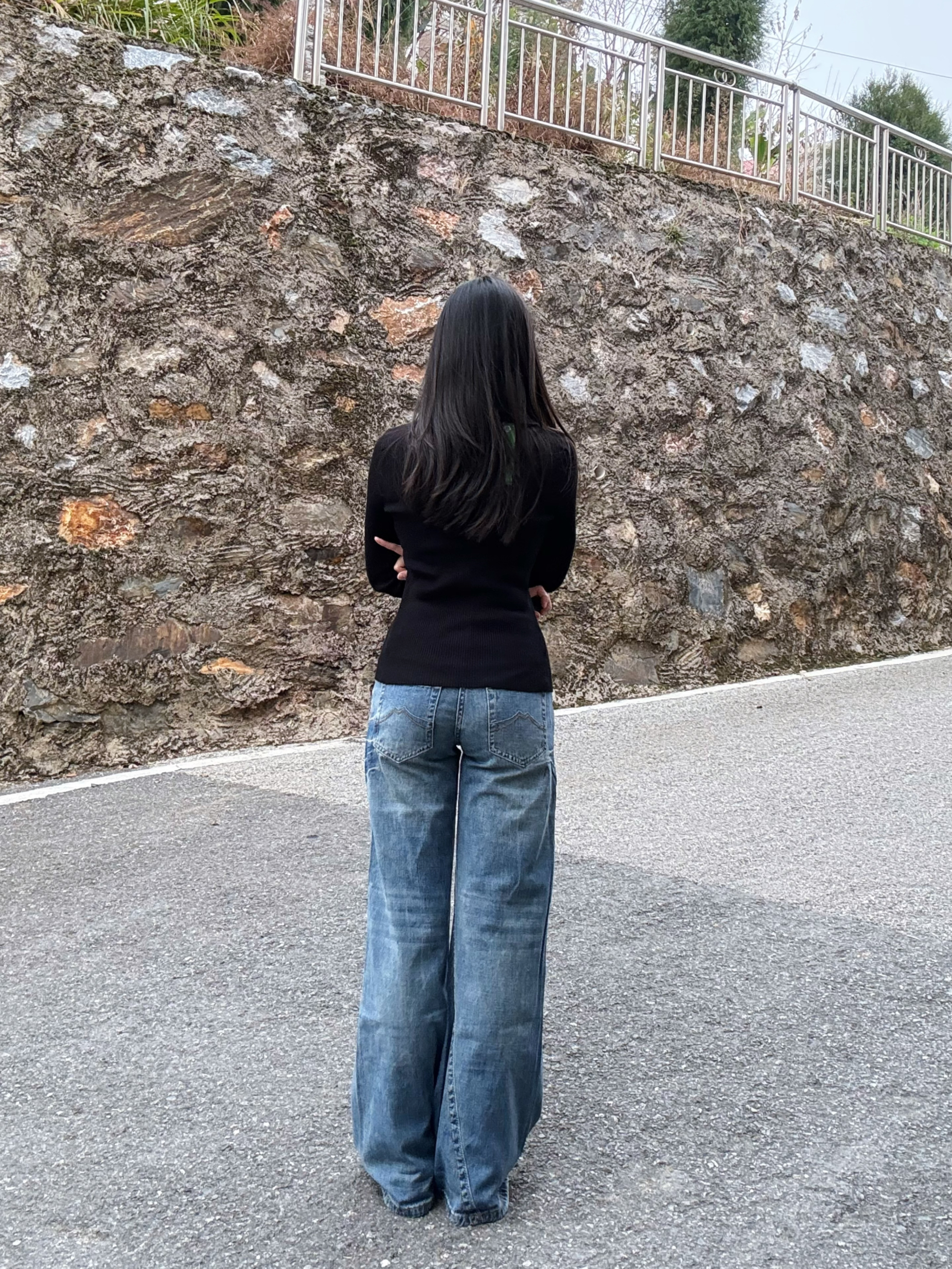 166 102穿的是M码 是低腰的设计 我还是第一次尝试低腰裤 有被惊喜到 这个裤型是不贴腿的微喇 显得比例很好呢 喜欢的宝宝可以参考一下哦