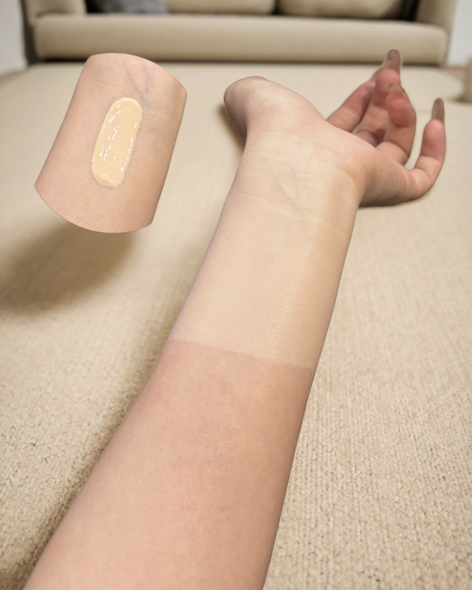 伪素颜的地基 质地与上脸:像乳液一样,徒手就能抹开。我早上赶时间,直接挤一泵在手心,搓开就往脸上拍。没有粉感,不卡纹,就是均匀、提亮了肤色,像是皮肤自然透出的好光泽。遮瑕力约等于无,能盖住一点暗沉,但红痘痘和黑眼圈别指望它。 真实心得:它赢在“快”和“自然”。后续不用定妆(除非大油皮),皮肤能自由呼吸。记住,用量要少! 全脸一颗花生米大小就够了,不然假白。它是给你好气色,不是给你换张皮。