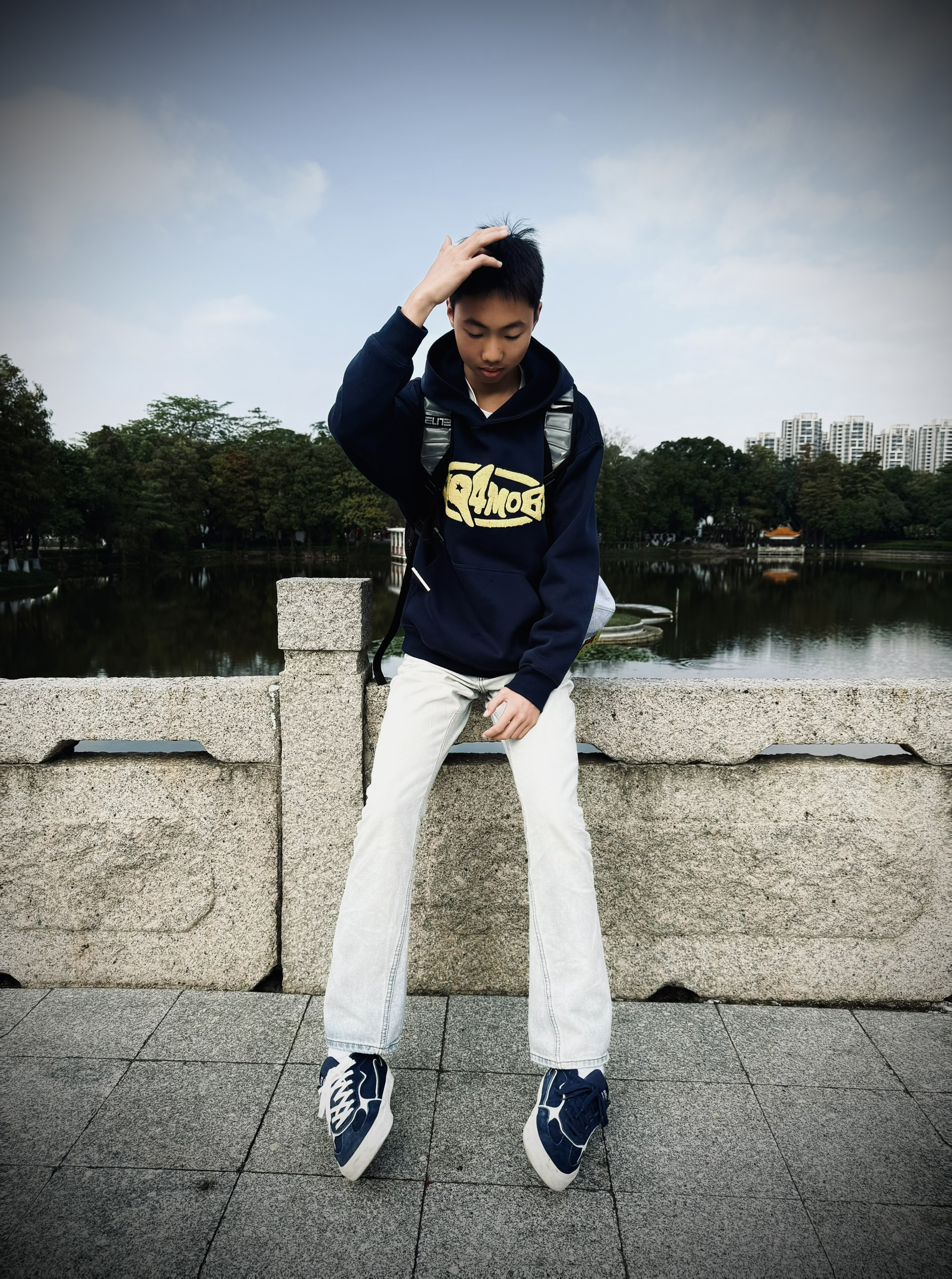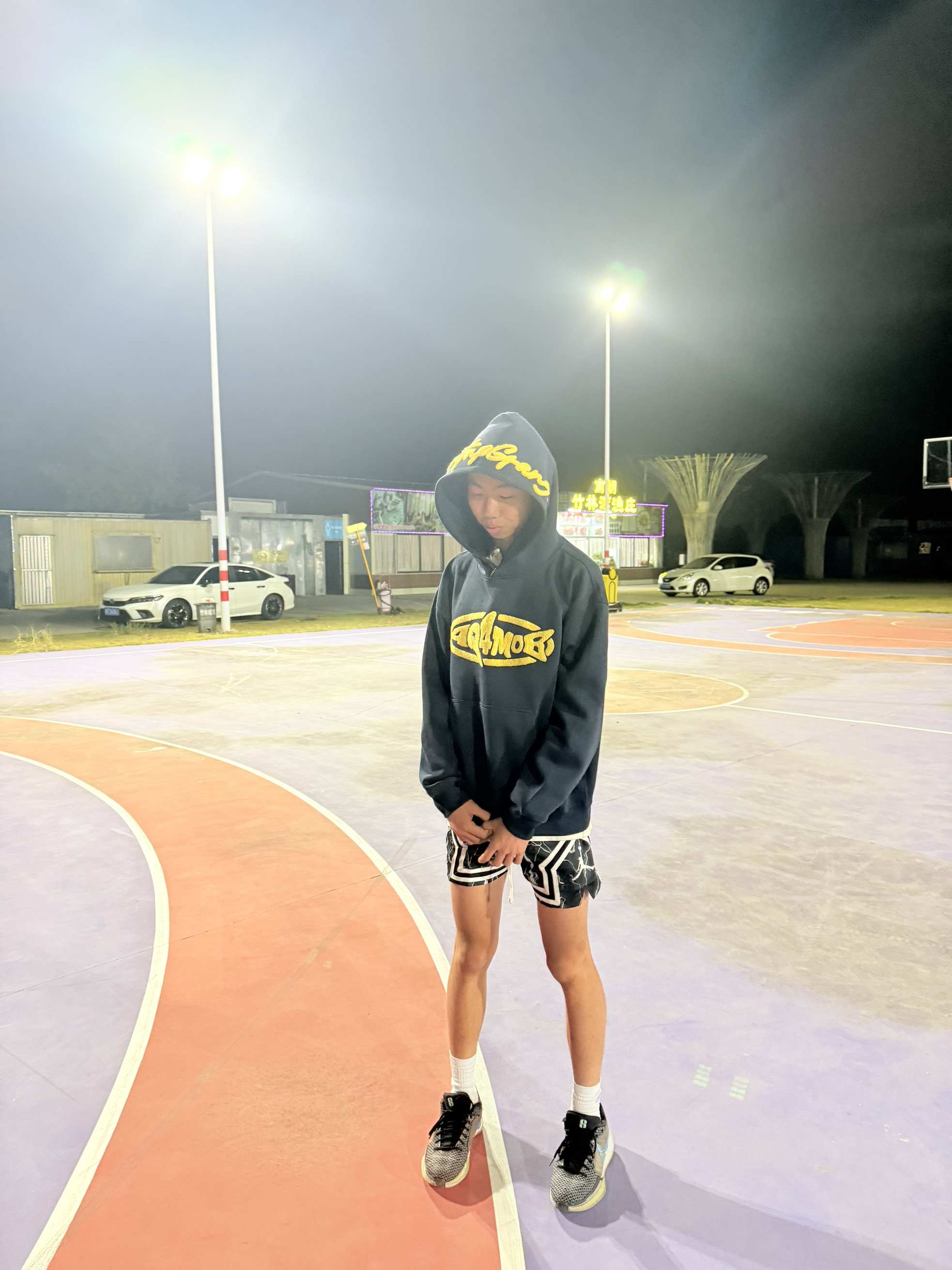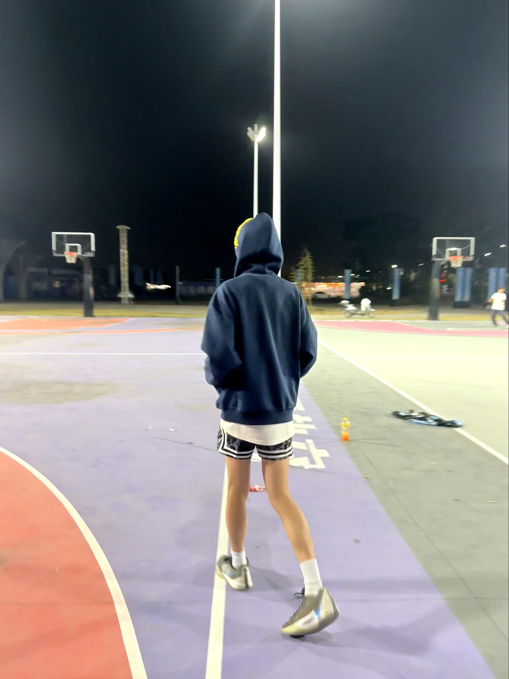上身藏蓝色连帽卫衣,胸前黄色图案点亮整体,面料软糯贴身穿不扎。下身搭配迷彩短裤,街头感恰到好处,活动起来没束缚。踩一双简约运动鞋+白袜,清爽利落。随手拎球、骑上小电驴就能出发球场,一套轻松实穿的搭配,分享给你们