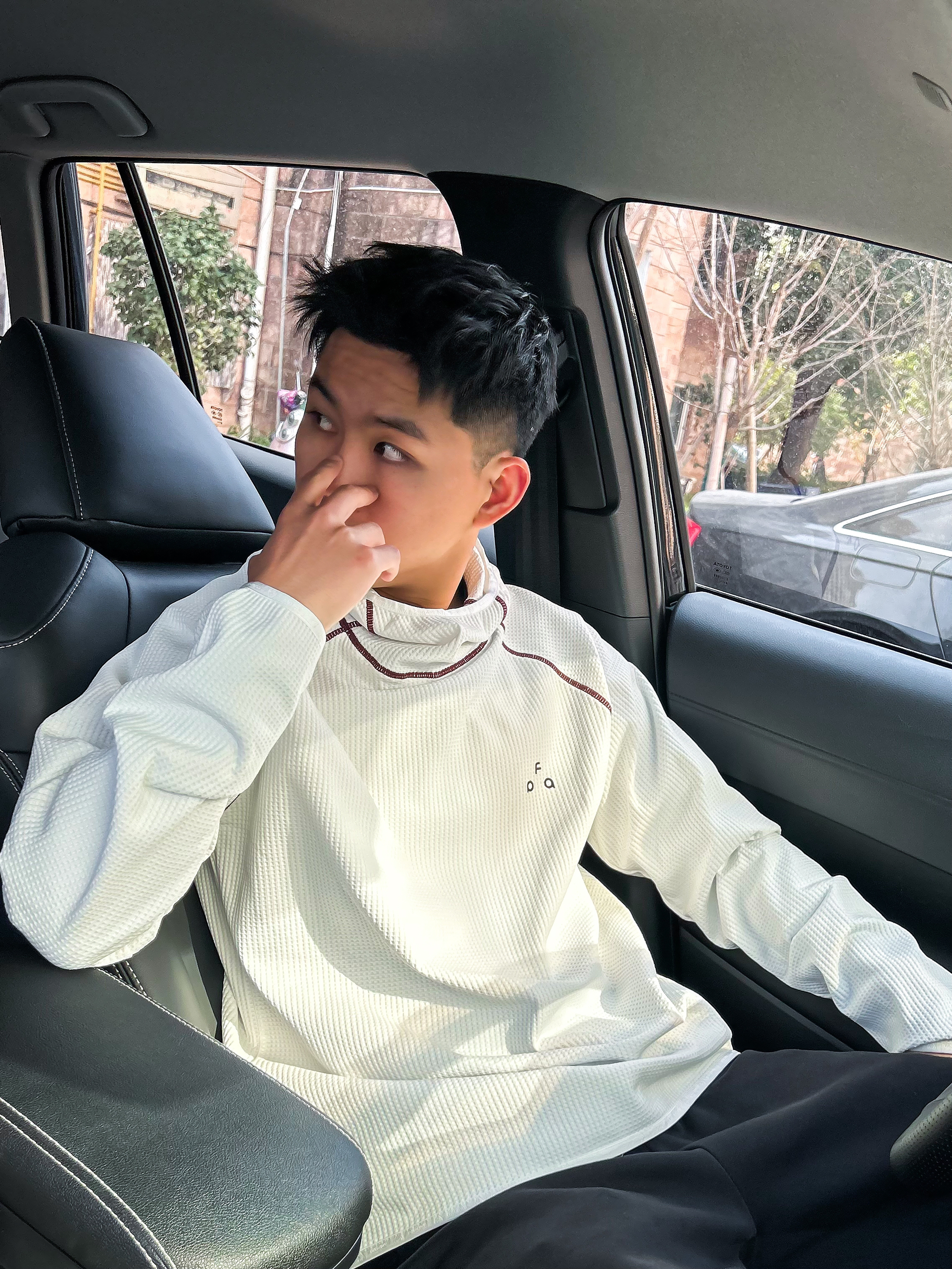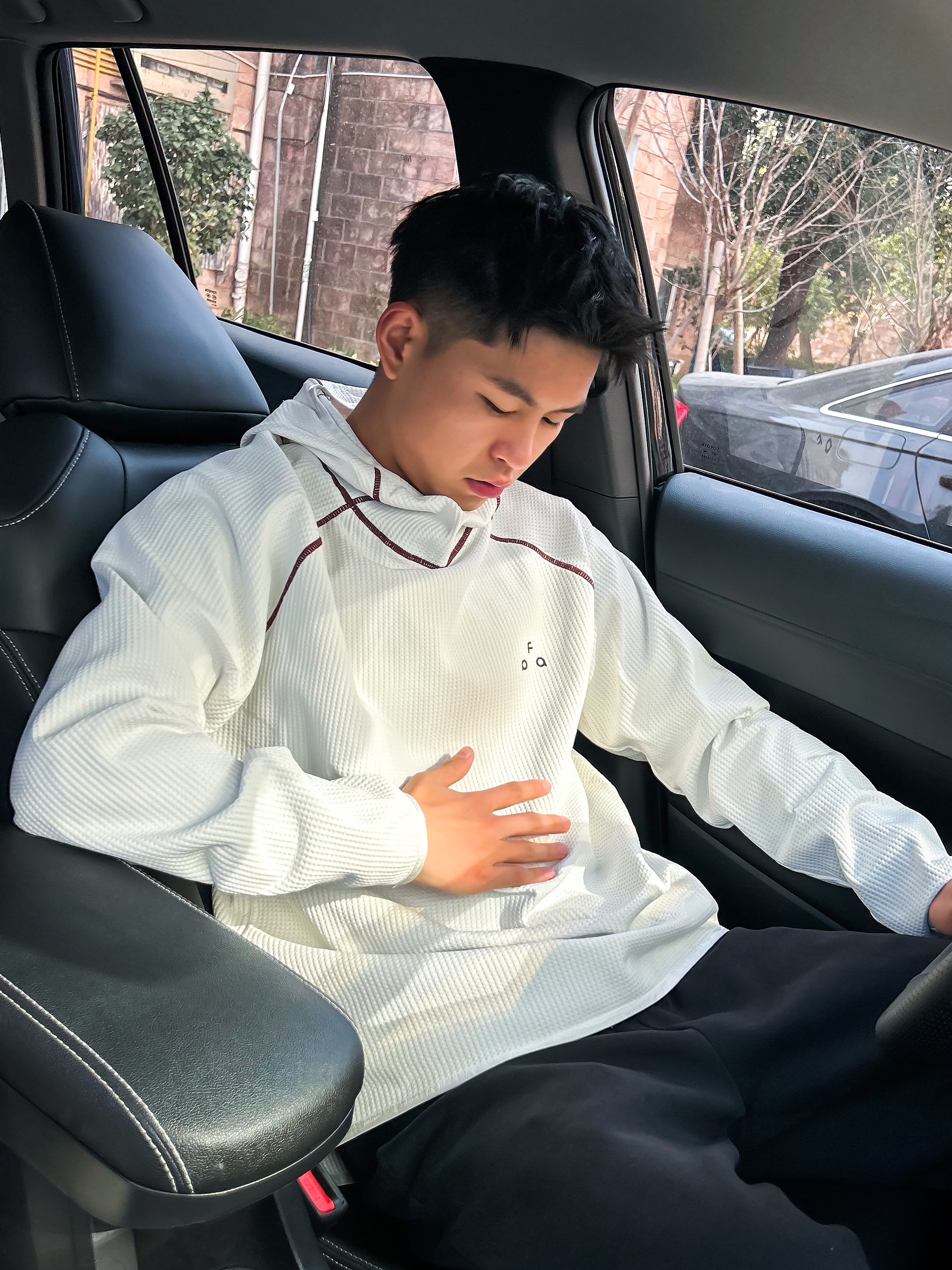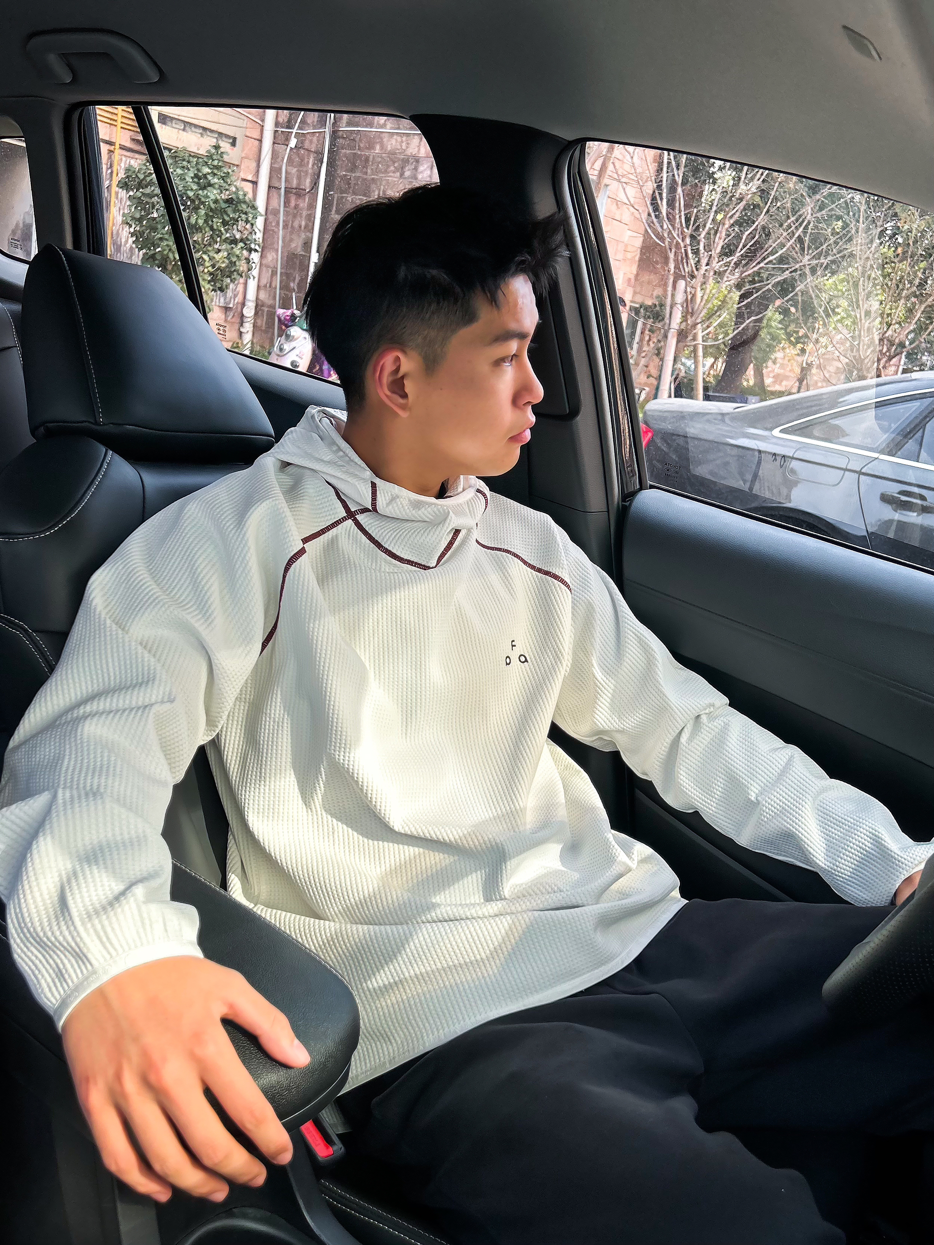 哈咯,这里是卢_SG 秋冬松弛感运动风穿搭又来啦! 上身选了件 FPA 华夫格连帽卫衣 后背的字母印花设计吸睛度拉满 华夫格纹理自带质感 宽松版型对各种身材都超友好 藏肉的同时还能穿出随性的运动范儿 落肩+撞色包边的细节设计,让肩线更显舒展 不管是日常开车出行还是打球穿搭 舒适度直接拉满~ 下身搭了条黑色休闲裤