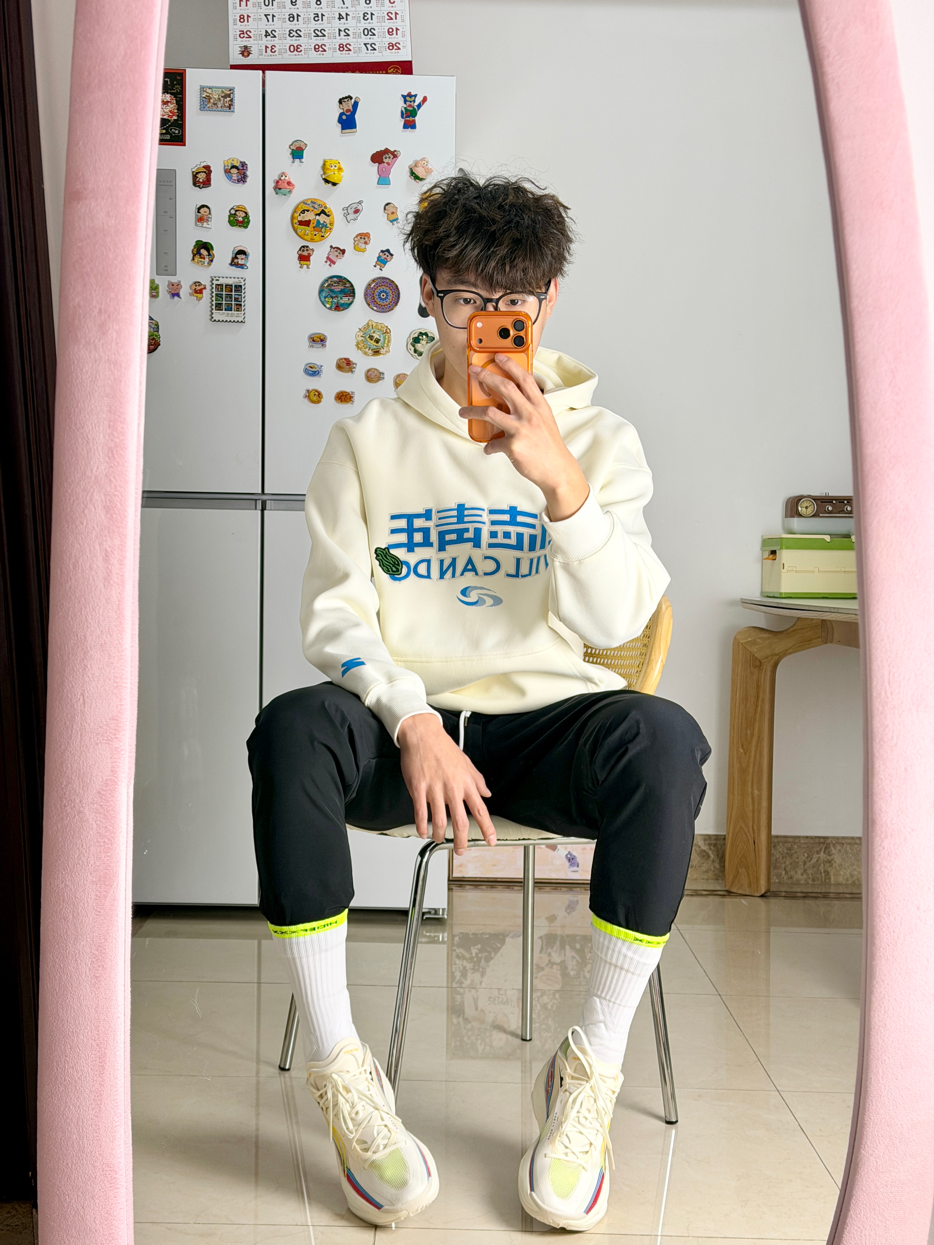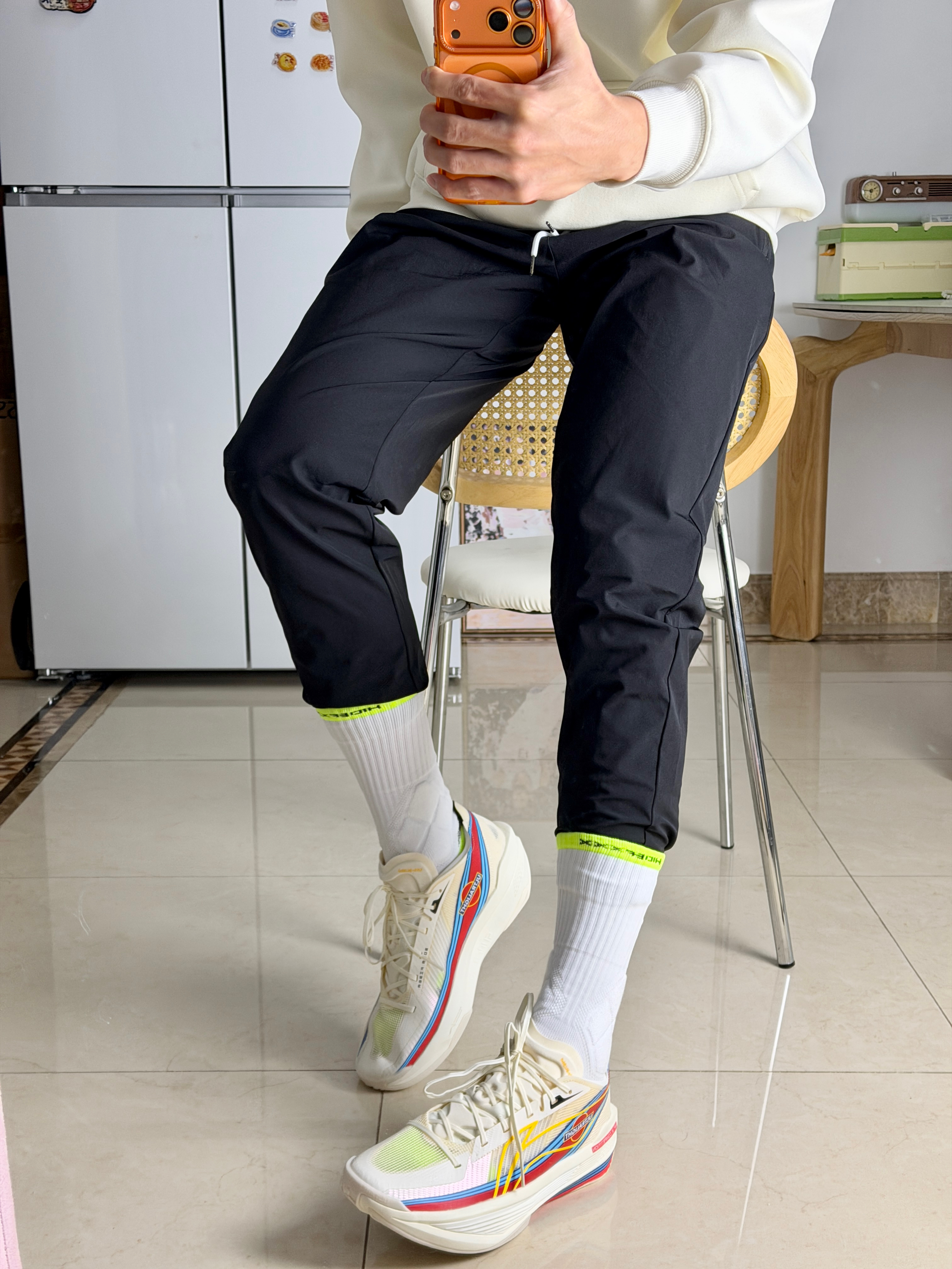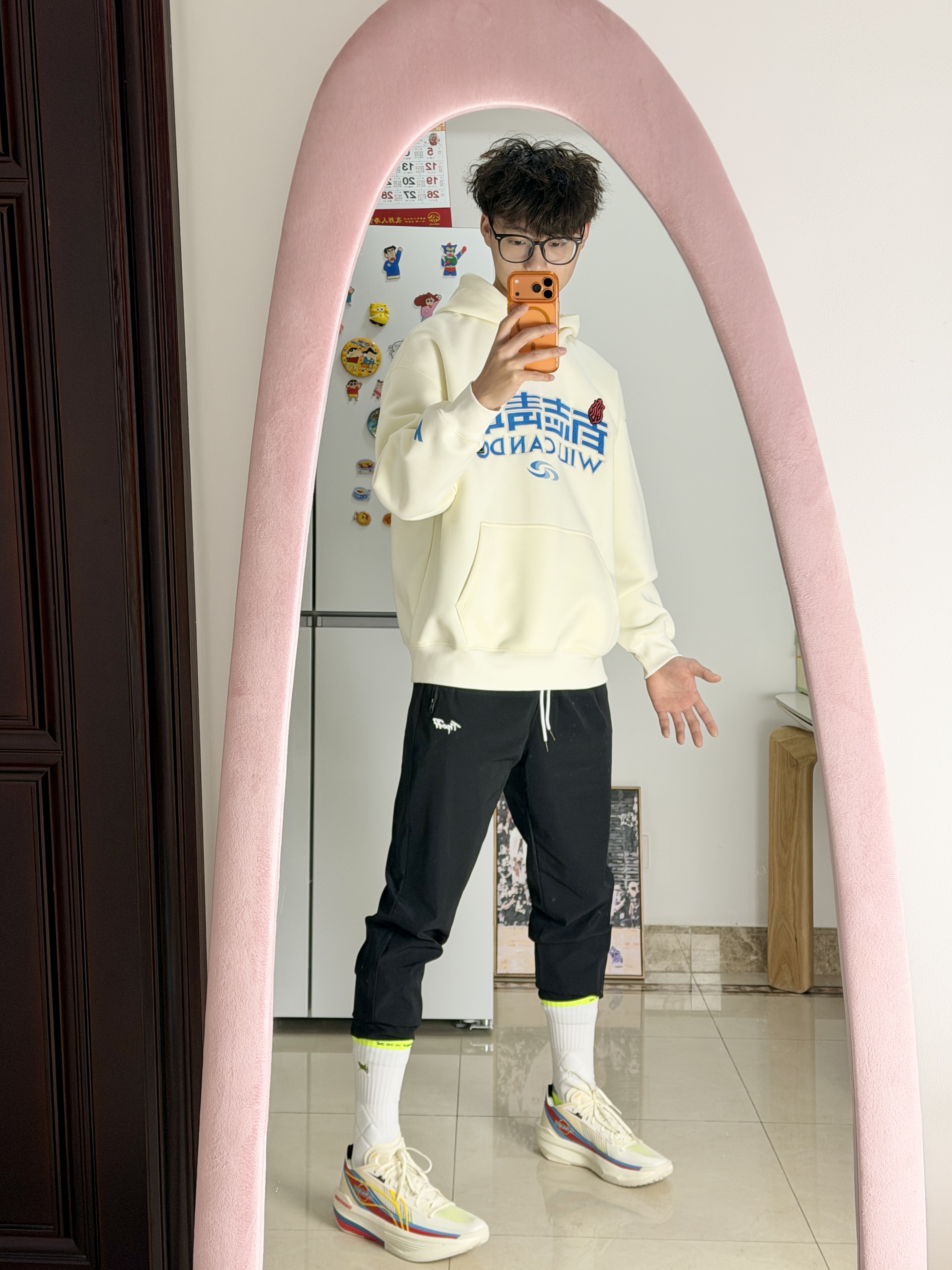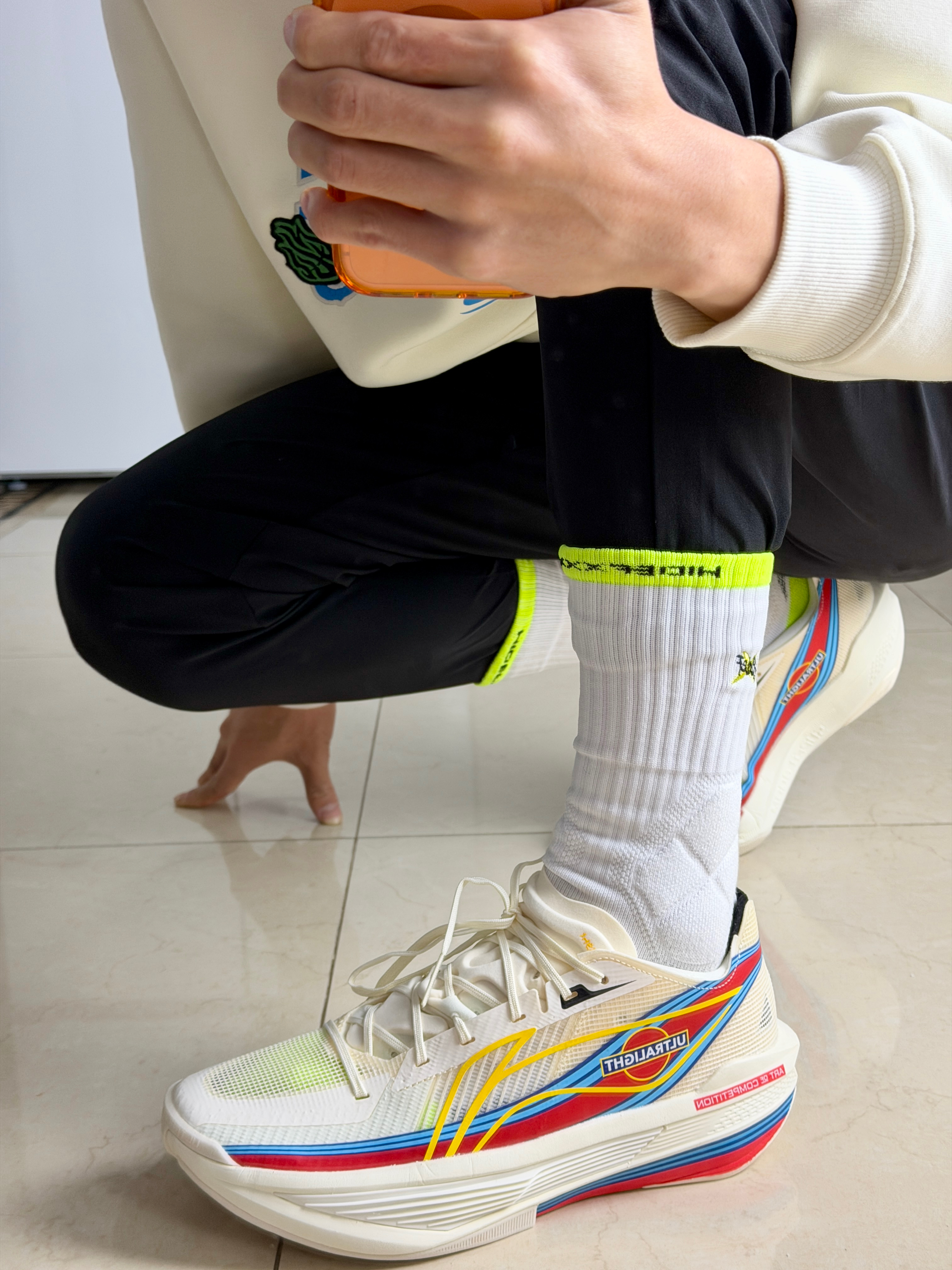 今天来看看183体育生这样穿你能给打几分? 米白宽松卫衣Q+黑色九分裤+彩色厚底鞋 再用荧光绿袜子做小面积撞色不用费脑搭配 也能帅的过分