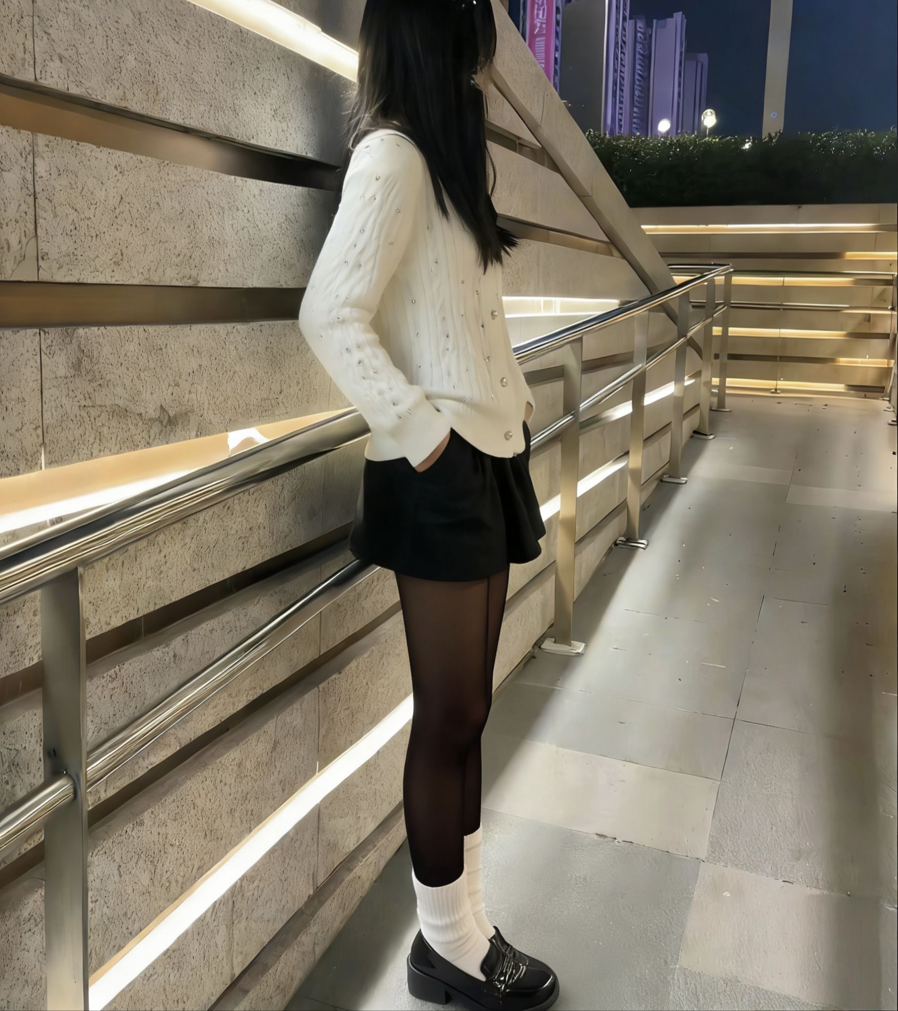 今晚这套穿搭直接把辣妹氛围感焊在身上,麻花毛衣中和了黑丝的性感,小白袜又增添了几分可爱,甜辣双修谁不爱! 乐福鞋厚底设计超显腿长,黑丝的光泽感直接把腿P成漫画腿!