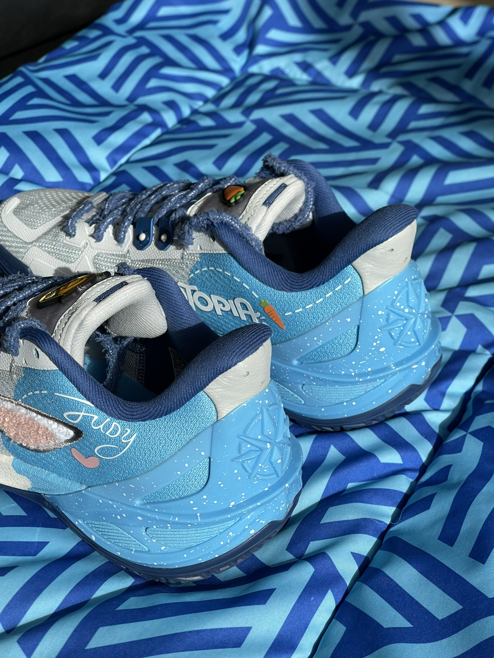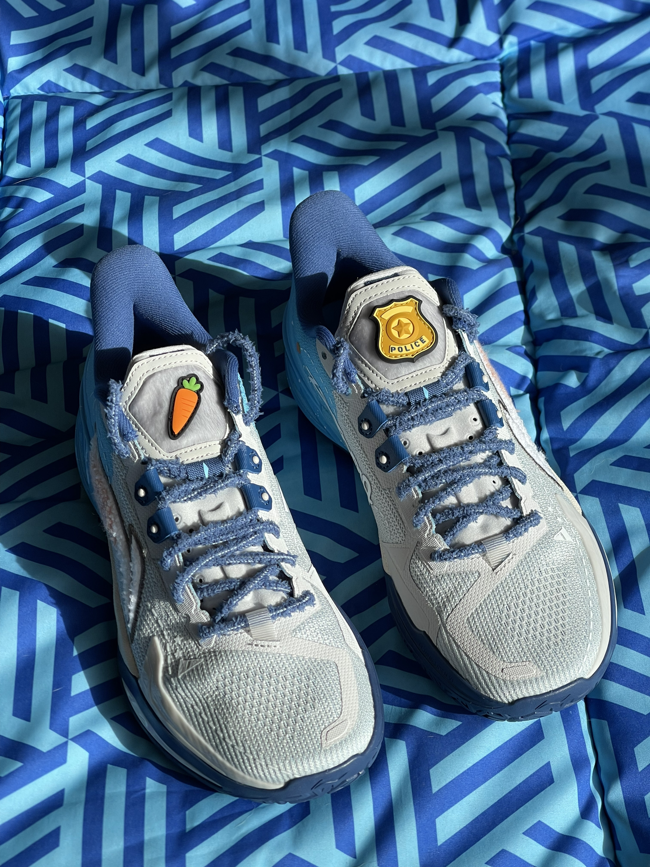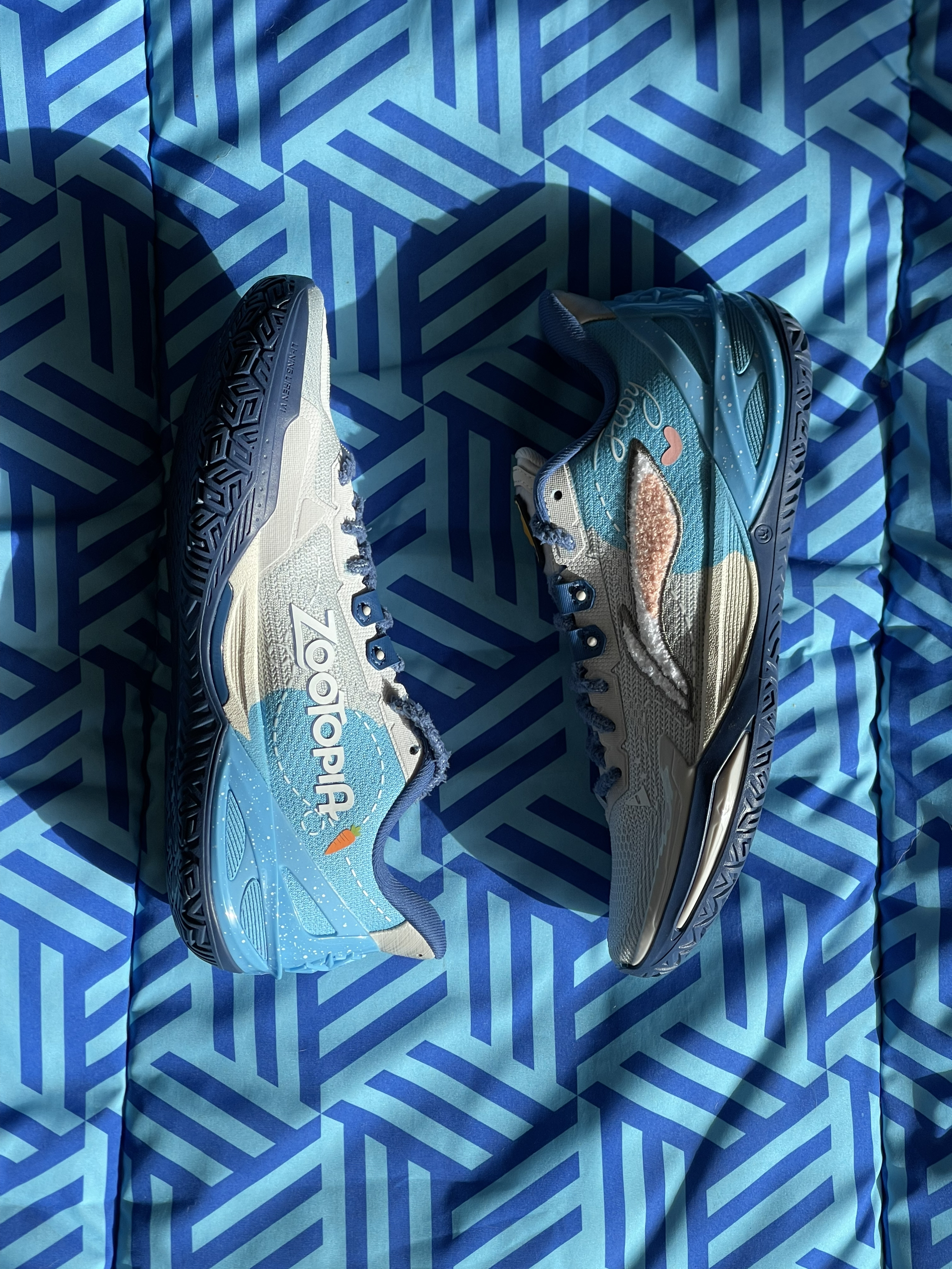 真是被这双鞋子的颜值所折服👟,疯狂动物城的还原度真的太高了,朱迪警官配色的利刃6V2我太喜欢了😘,尤其是鞋上的胡萝卜🥕录音笔和警徽👮,整体颜值的搭配非常的和谐侧边的李宁logo换成了兔子耳朵非常细节🐰,不管是内场还是外场都能轻松驾驭,210斤的我穿上打球两小时没有累的感觉⛹🏻,鞋码可以正常选择不偏🦶,无论是脚感还是颜值都非常在线🤩,你觉得兔朱迪好看还是胡尼克好看呢?评论区聊吧💬